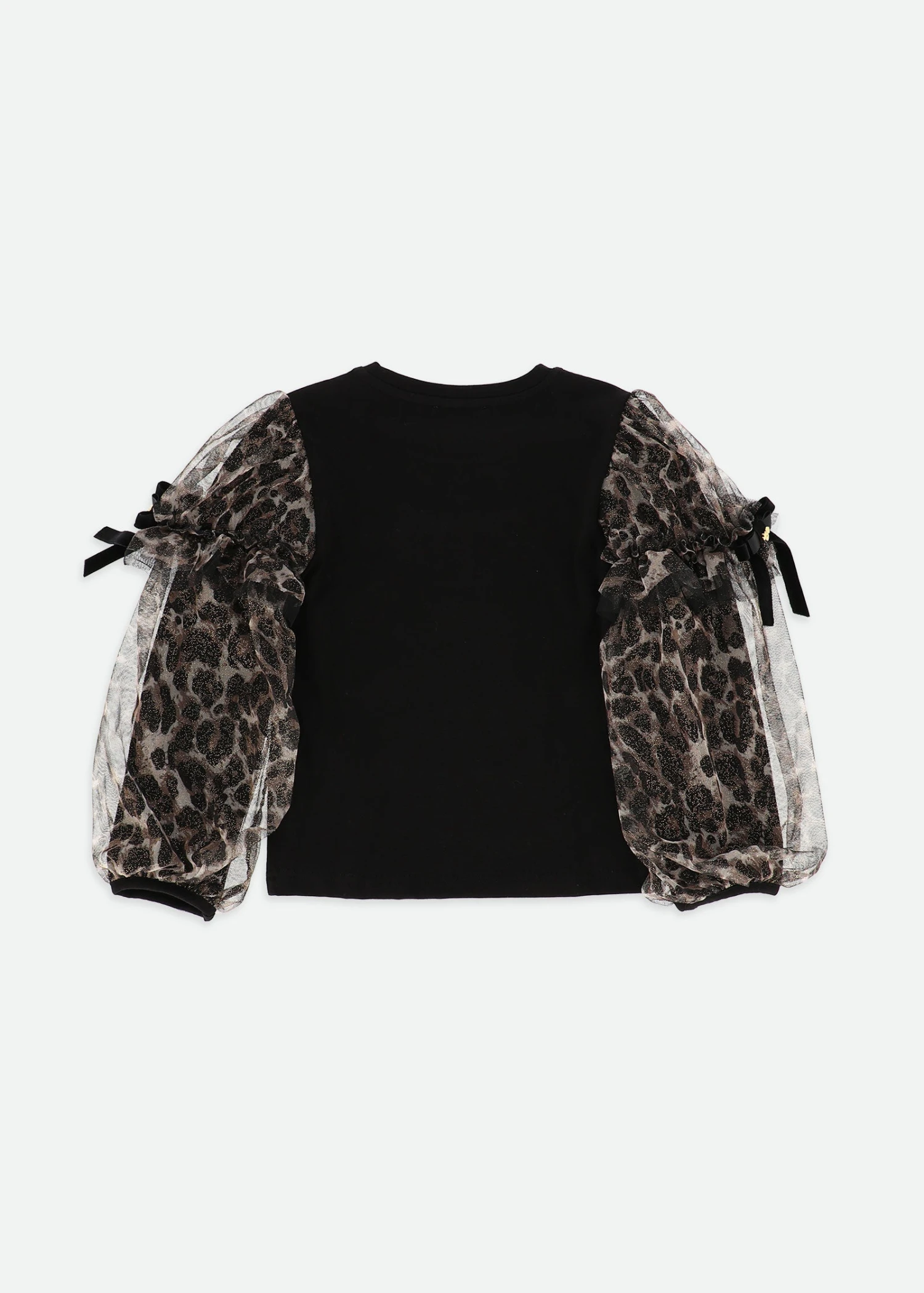 Feel extra special in this beautiful leopard tulle top. The soft jersey top has floaty sheer tulle sleeves in a pretty leopard print and velvet bows on each side. Perfect for parties or dressing up any day.