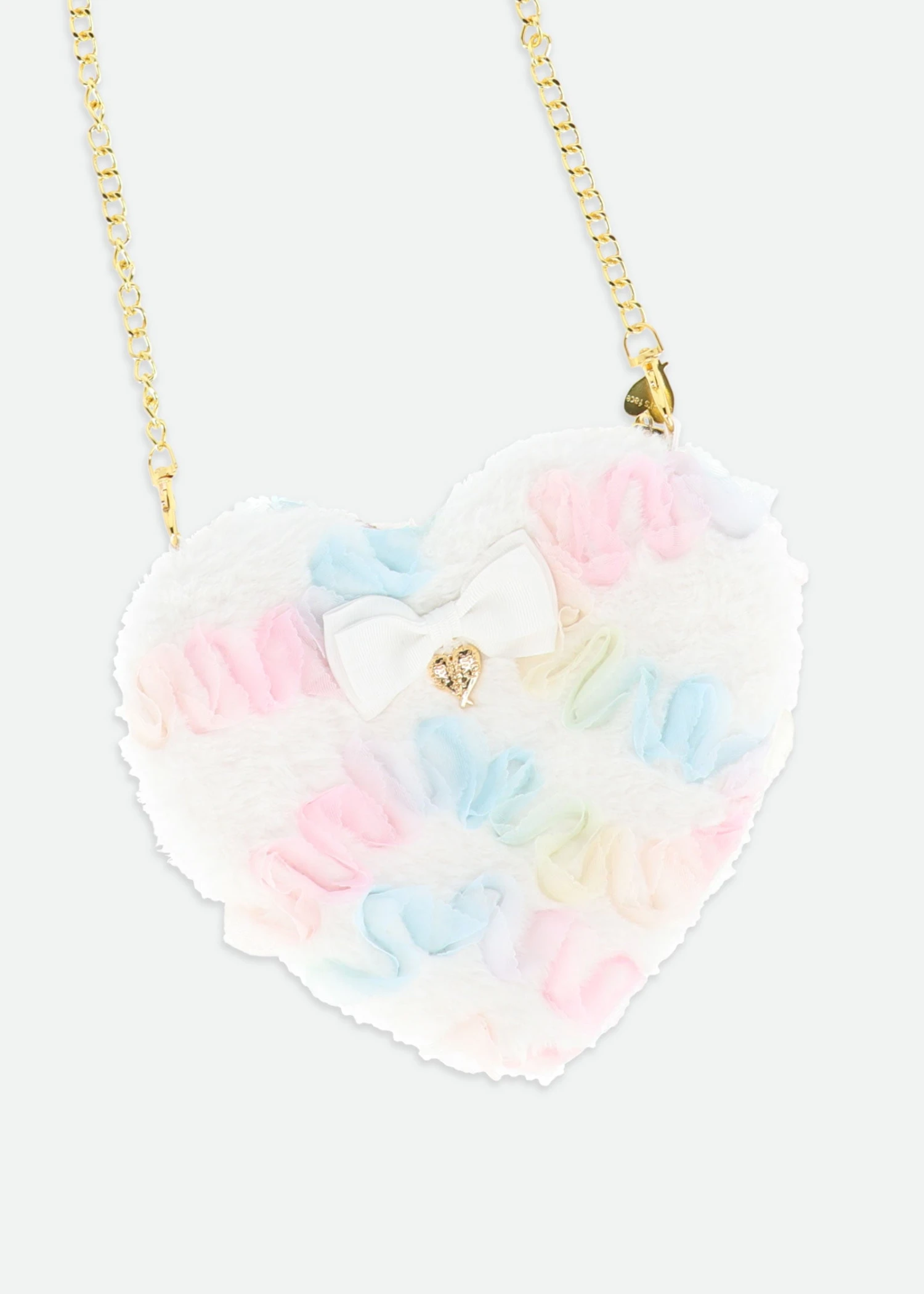 Fall in love with our faux fur snowdrop heart bag and keep your treasures safe in style! This fun-loving bag has a detachable gold chain and fur chain cover on the shoulder. The bag is complete with fleece lining, our gold heart zipper to keep essentials secure and a signature bow and gold heart charm on the front.