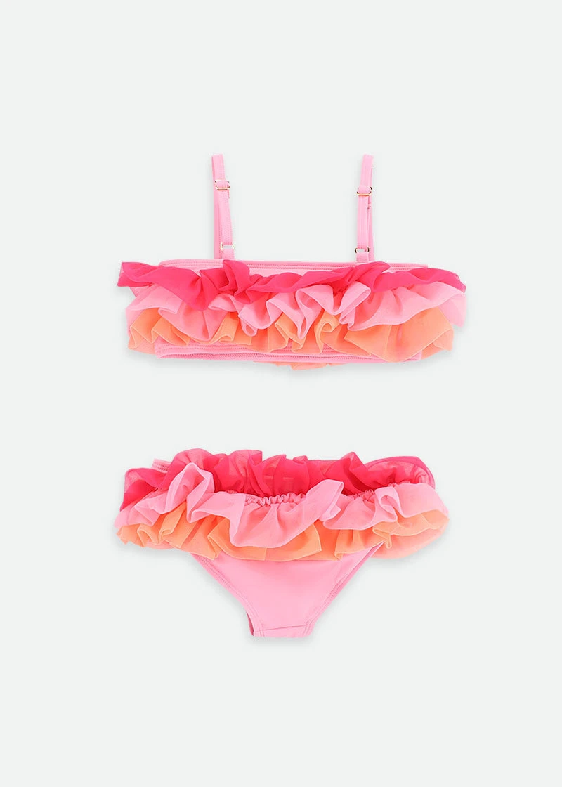 Fabulously frilly pink bikini for girls. Top and bottoms feature voluminous soft tulle ruffles and decorative bows complete with our signature gold heart charms. Swimwear fully lined and made from SPF 50 fabric for optimum sun protection.