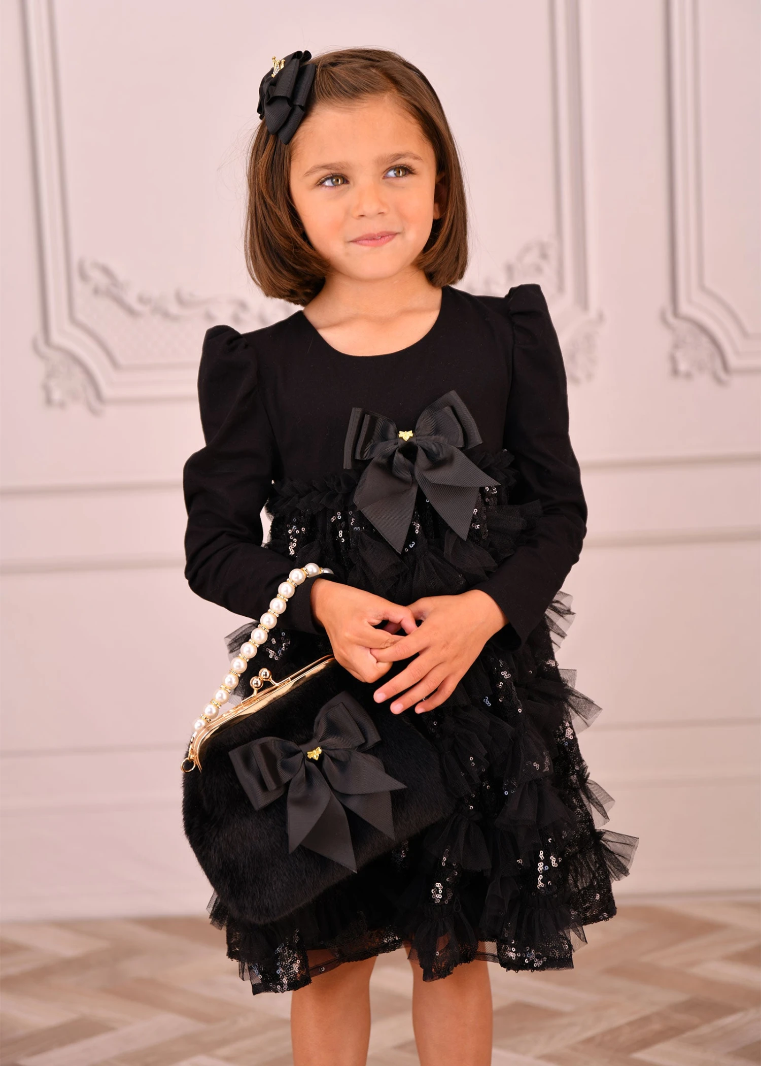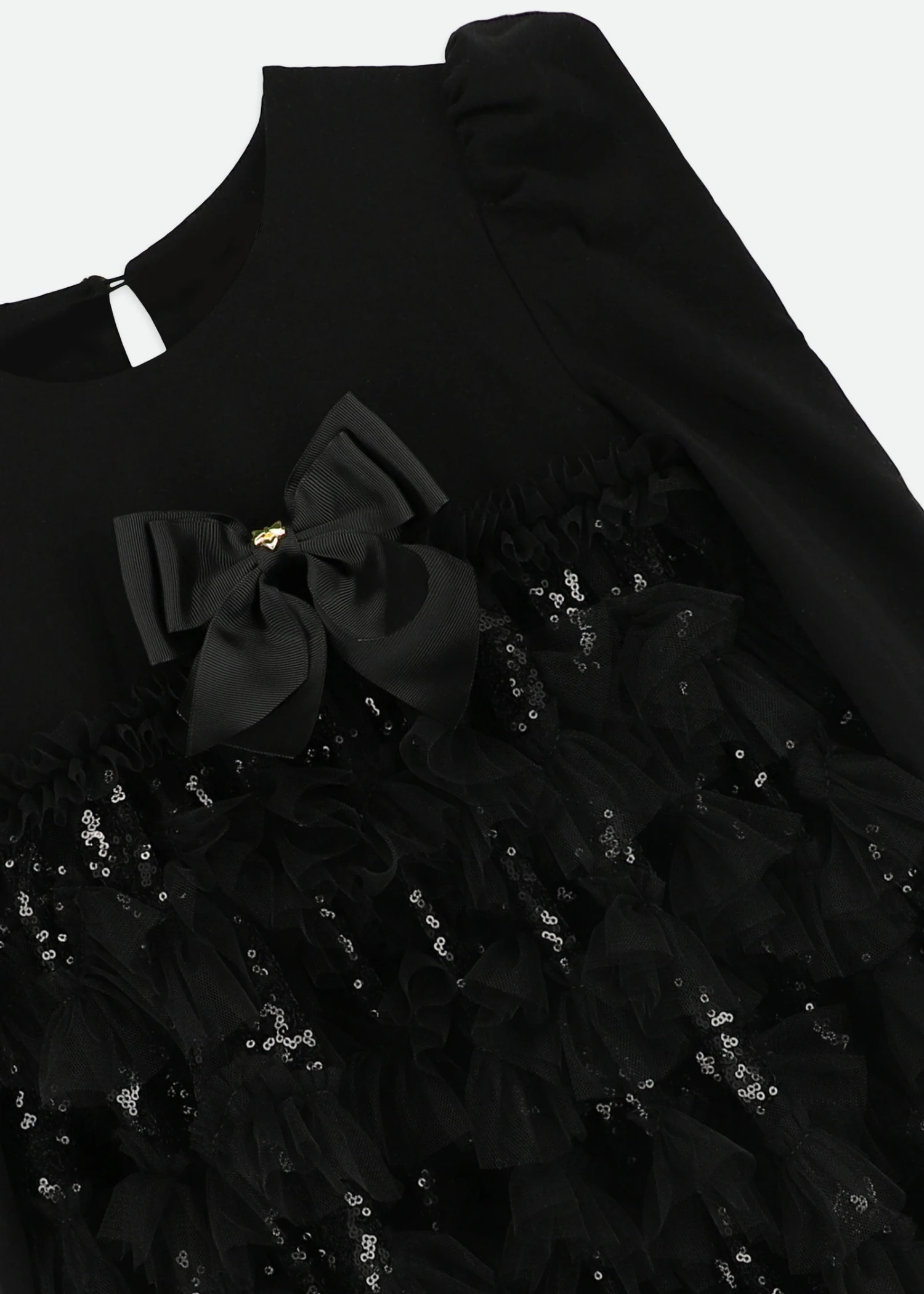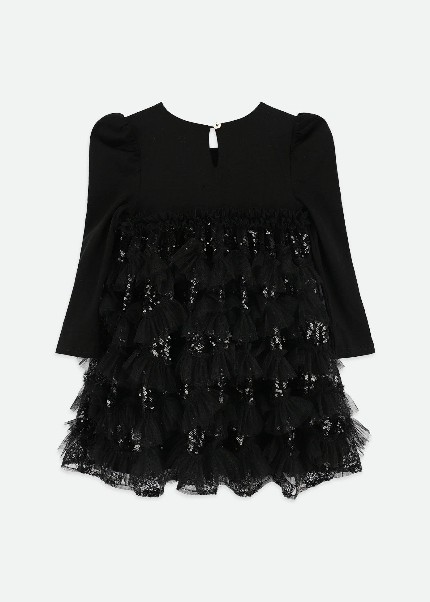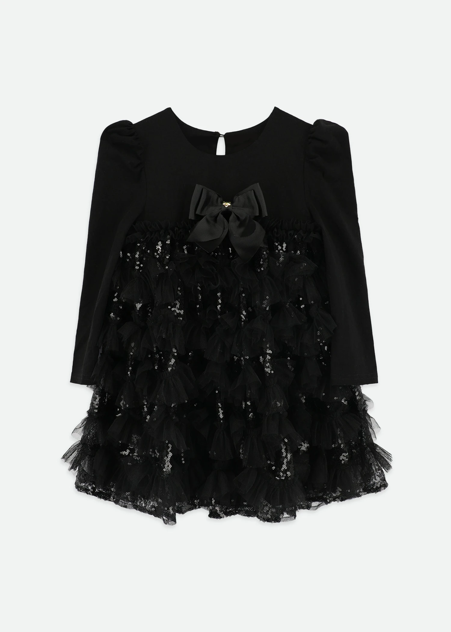 Shine bright in this sparkly black sequin dress for girls. This show-stopping dress is perfect for parties and special occasions. It features long jersey sleeves and a soft stretch bodice for comfort, while the skirt is covered in layers of glittering sequin-embellished tulle ruffles. Fully lined in smooth cotton to keep you comfy. Finished with a large grosgrain bow and our signature gold heart stud on the front, fastening at the back with a single button.