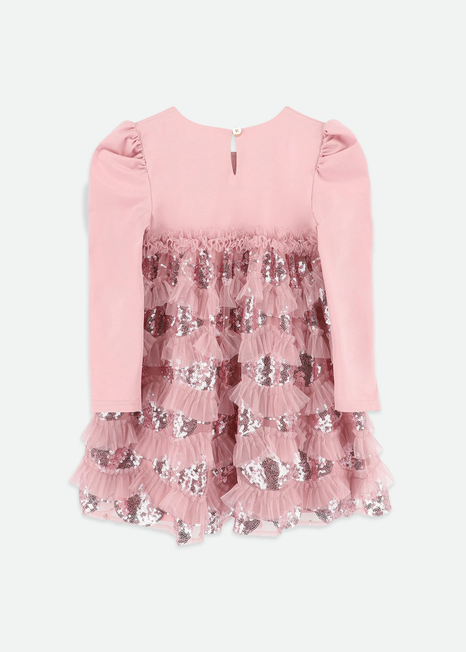 Shine bright in this sparkly pink sequin dress for girls. This show-stopping dress is perfect for parties and special occasions. It features long jersey sleeves and a soft stretch bodice for comfort, while the skirt is covered in layers of glittering sequin-embellished tulle ruffles. Fully lined in smooth cotton to keep you comfy. Finished with a large grosgrain bow and our signature gold heart stud on the front, fastening at the back with a single button.