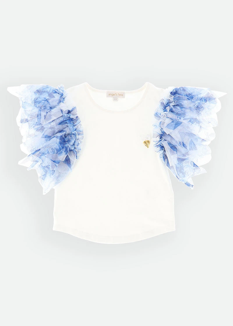Luxurious summer t-shirt in snowdrop with blue flower print tulle sleeves. This t-shirt features gorgeous gathered petal tulle sleeve detail that pairs perfectly with our Abbie roses skirt to create an elegant look. Made from a soft stretch cotton blend, top is fitted with an elegant dipped hem and easy pull on fit. Complete with our signature bow and gold heart charm on the chest.