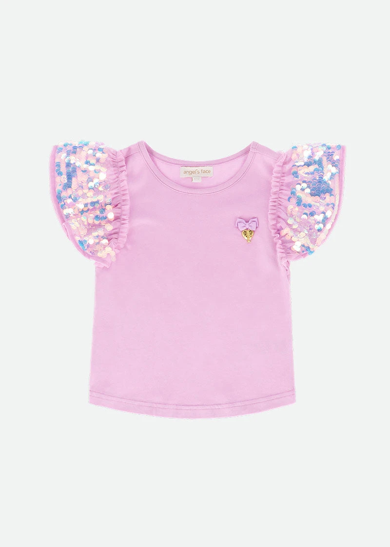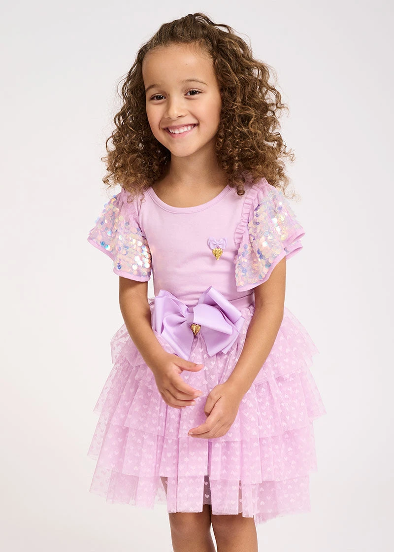 Sparkling summer t-shirt in violet featuring our signature bow and gold heart charm on the chest. Glamorous ruffle sleeves decorated with iridescent sparkling sequins on a soft tulle base. Bodice made from a soft stretch cotton blend with an easy pull on fit.