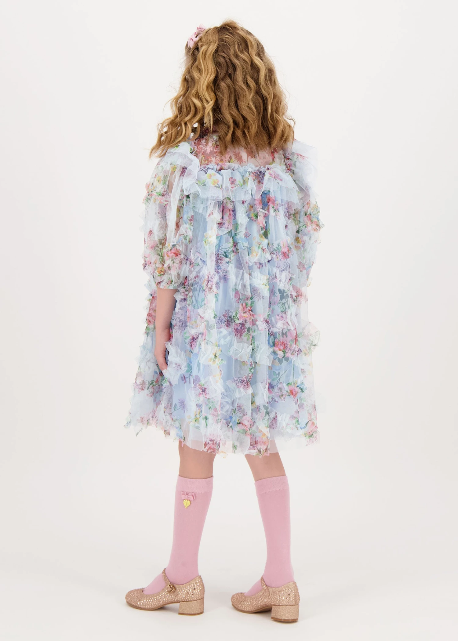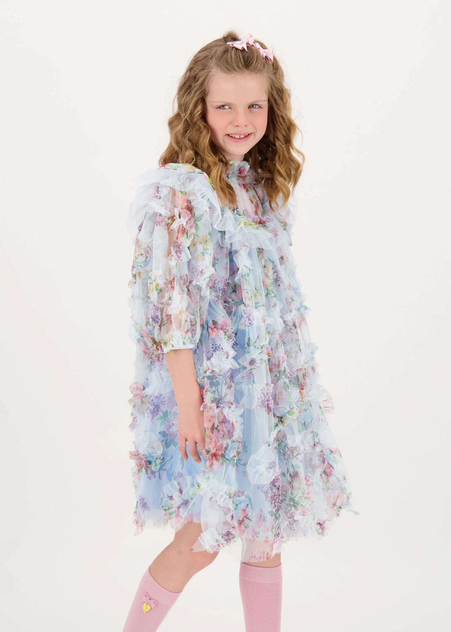 Make an entrance in this voluminous blue tulle party dress for girls. The luxurious tulle dress is detailed with this season’s exquisite flower design, fully lined in a soft stretch cotton blend. Three-quarter sleeve, frills at the neck yoke and skirt. The dress is complete with our signature bow and gold heart charm on the neckline, fastening at the back with a gold button.