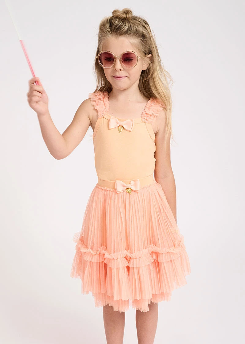 Perfectly pleated summer skirt for girls in apricot orange. Made from layers of soft voluminous tulle, fully lined in a comfortable cotton blend, featuring an easy elasticated waist. Skirt is complete with our signature bow and heart charm centre of the waist.