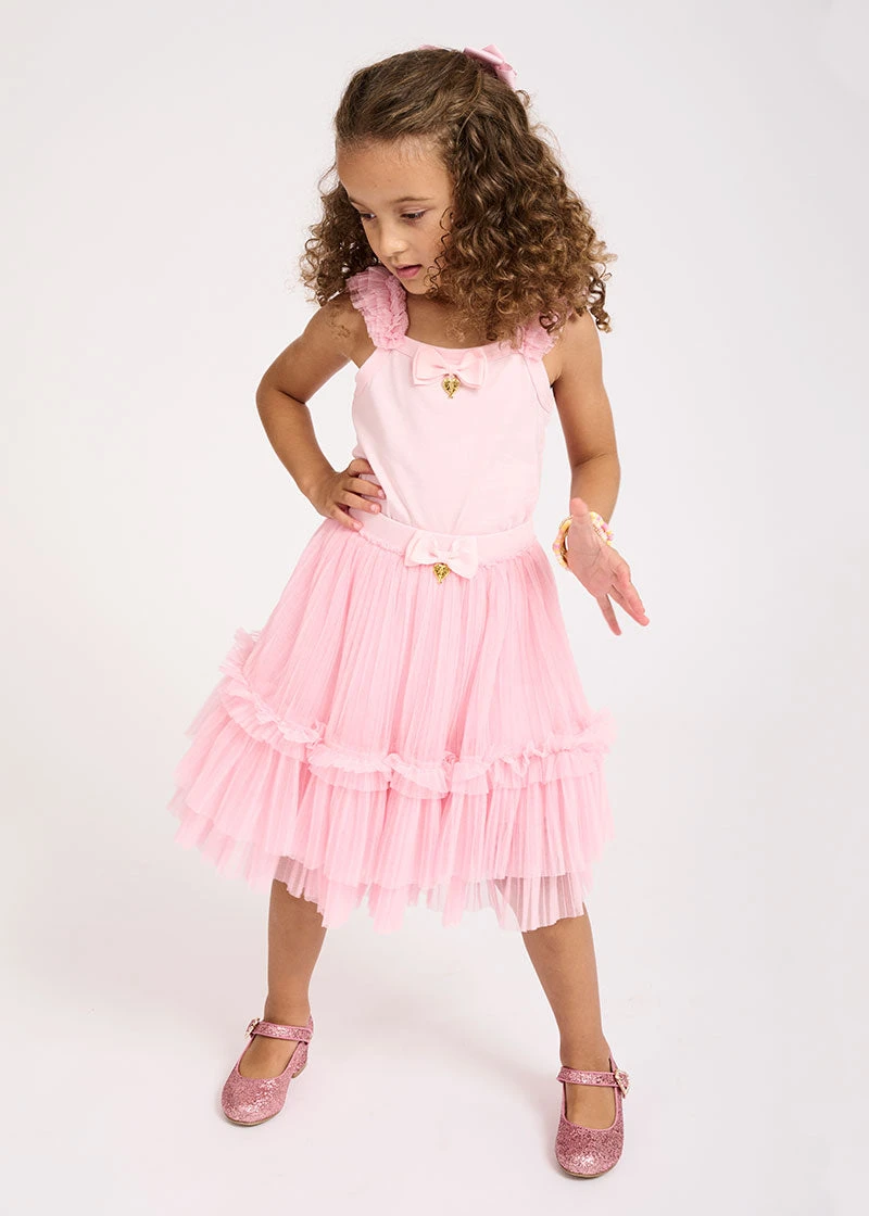 Perfectly pleated summer skirt for girls in fairy pink. Made from layers of soft voluminous tulle, fully lined in a comfortable cotton blend, featuring an easy elasticated waist. Skirt is complete with our signature bow and heart charm centre of the waist.