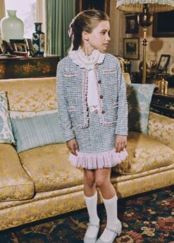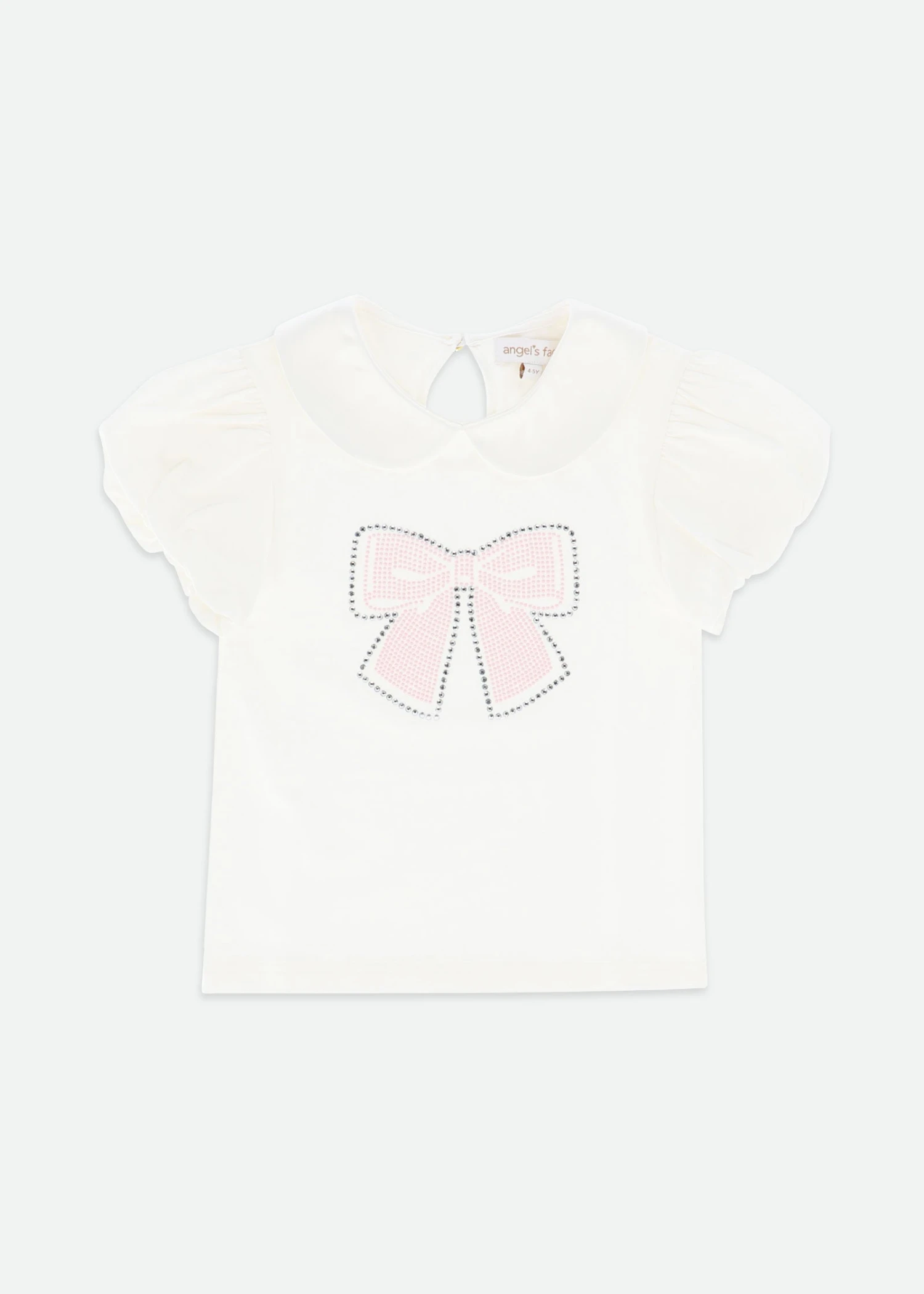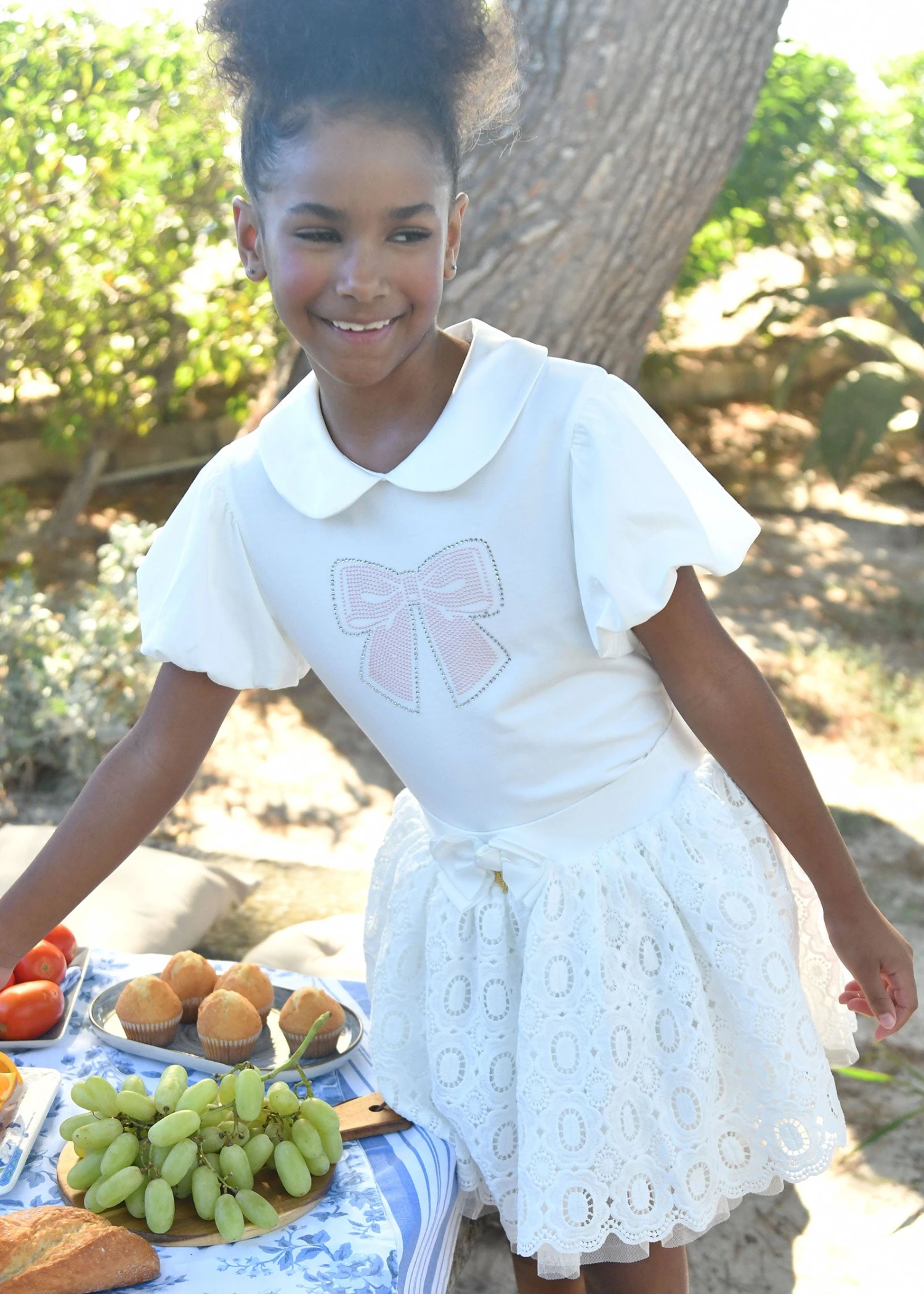 Luxury top with posh satin collar and diamanté heart in snowdrop white. The top is detailed with a contrast white satin collar, voluminous puffed sleeves and pretty bow diamanté embellishment on the front. Fastens at the back with gold logo button.