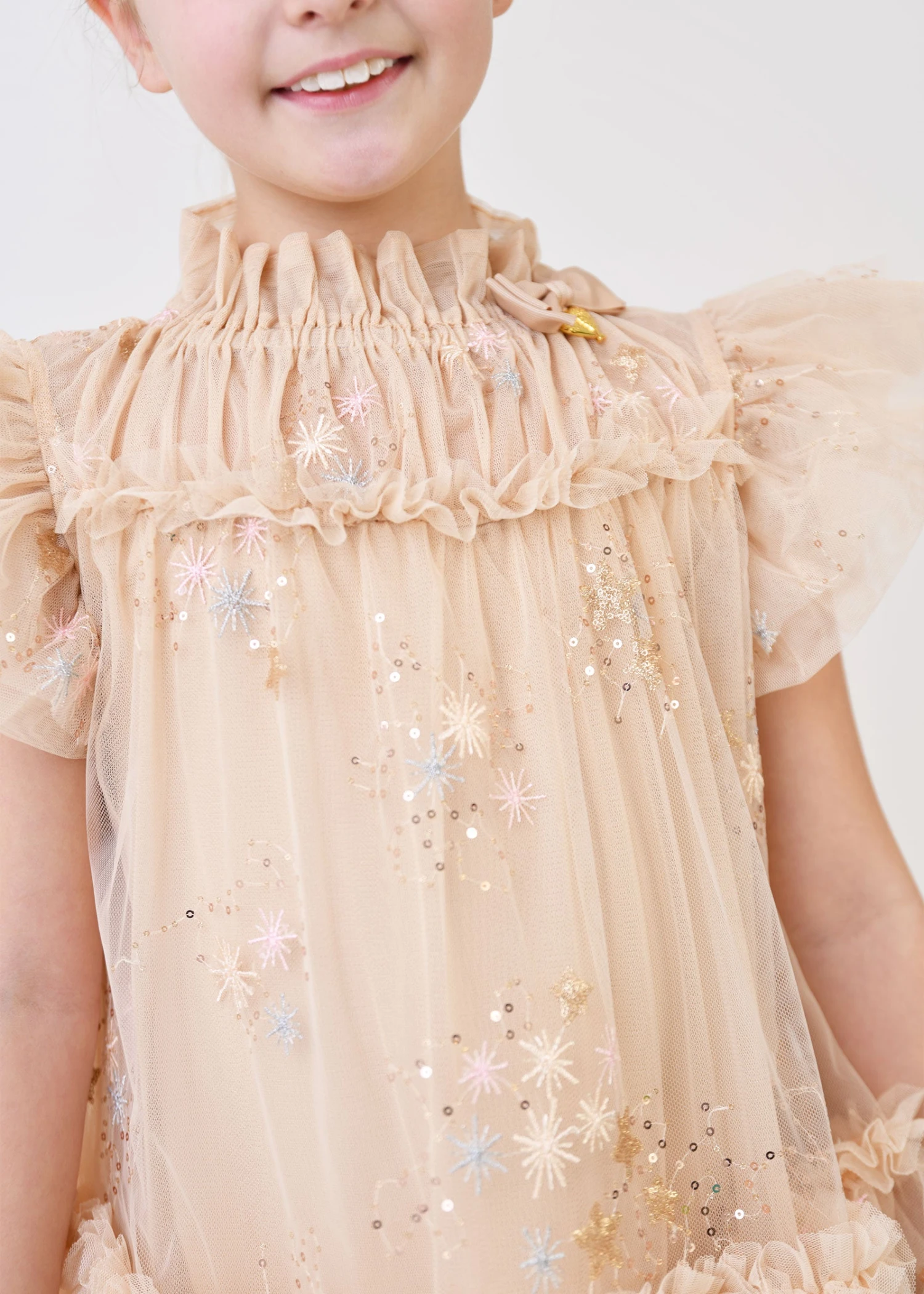 Gorgeous gold glitter star dress for girls. The dress is made from voluminous soft tulle, fully lined in soft cotton. Detailed with our signature bow and gold heart charm on the neckline, fastening at the back with a gold logo button.