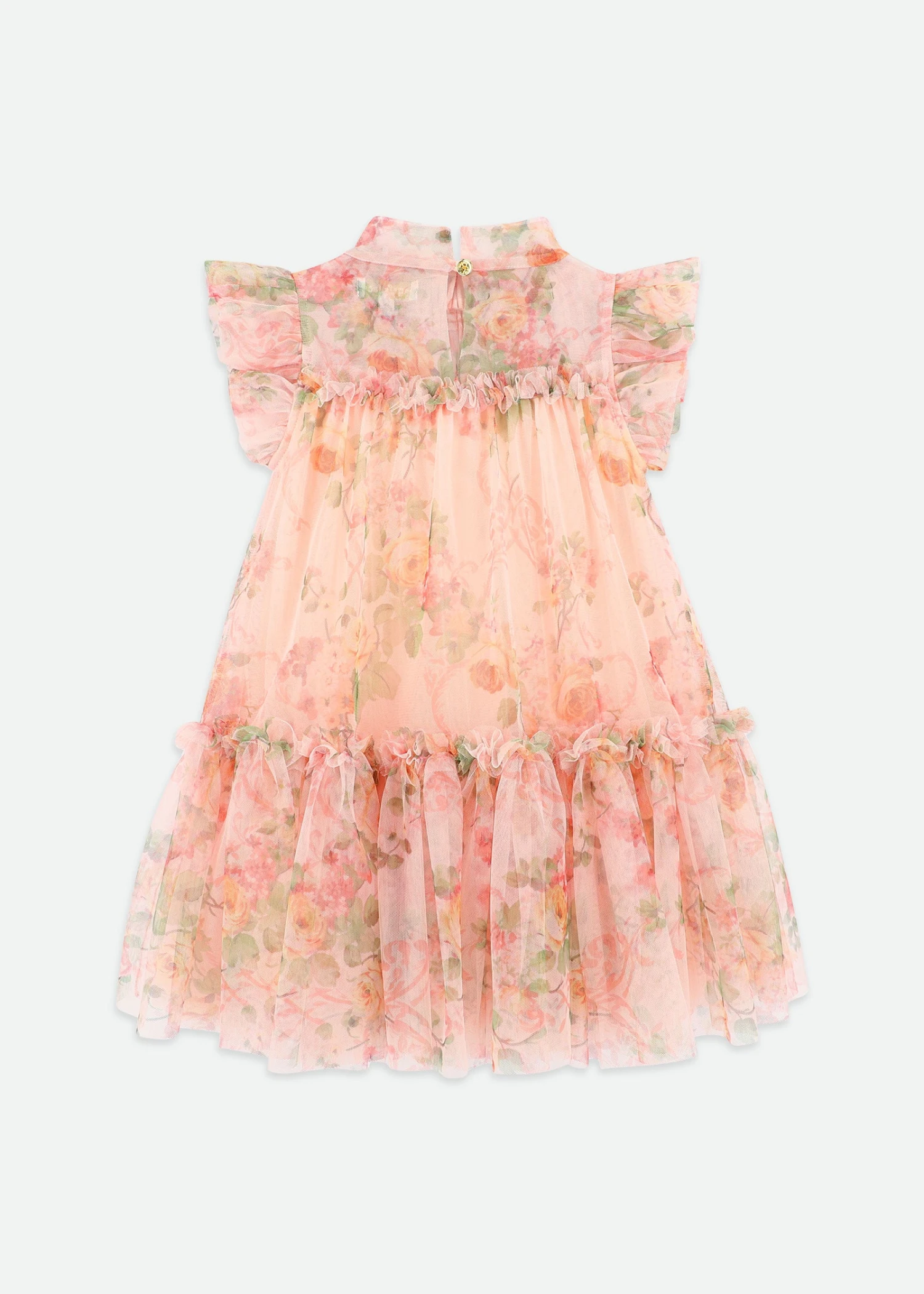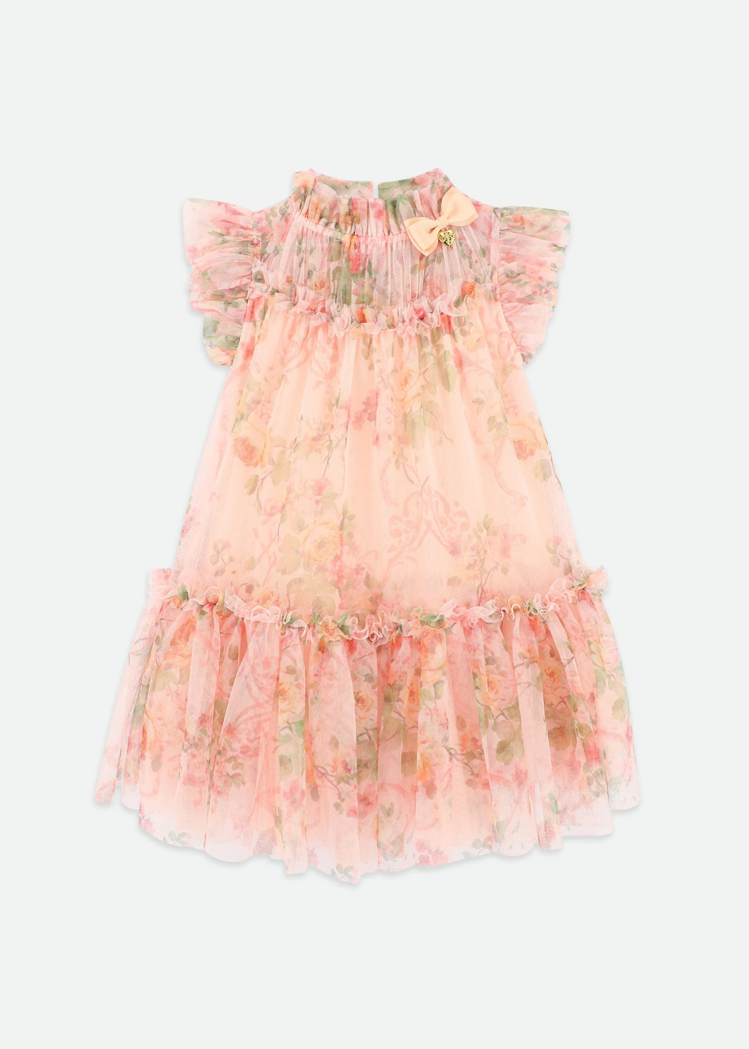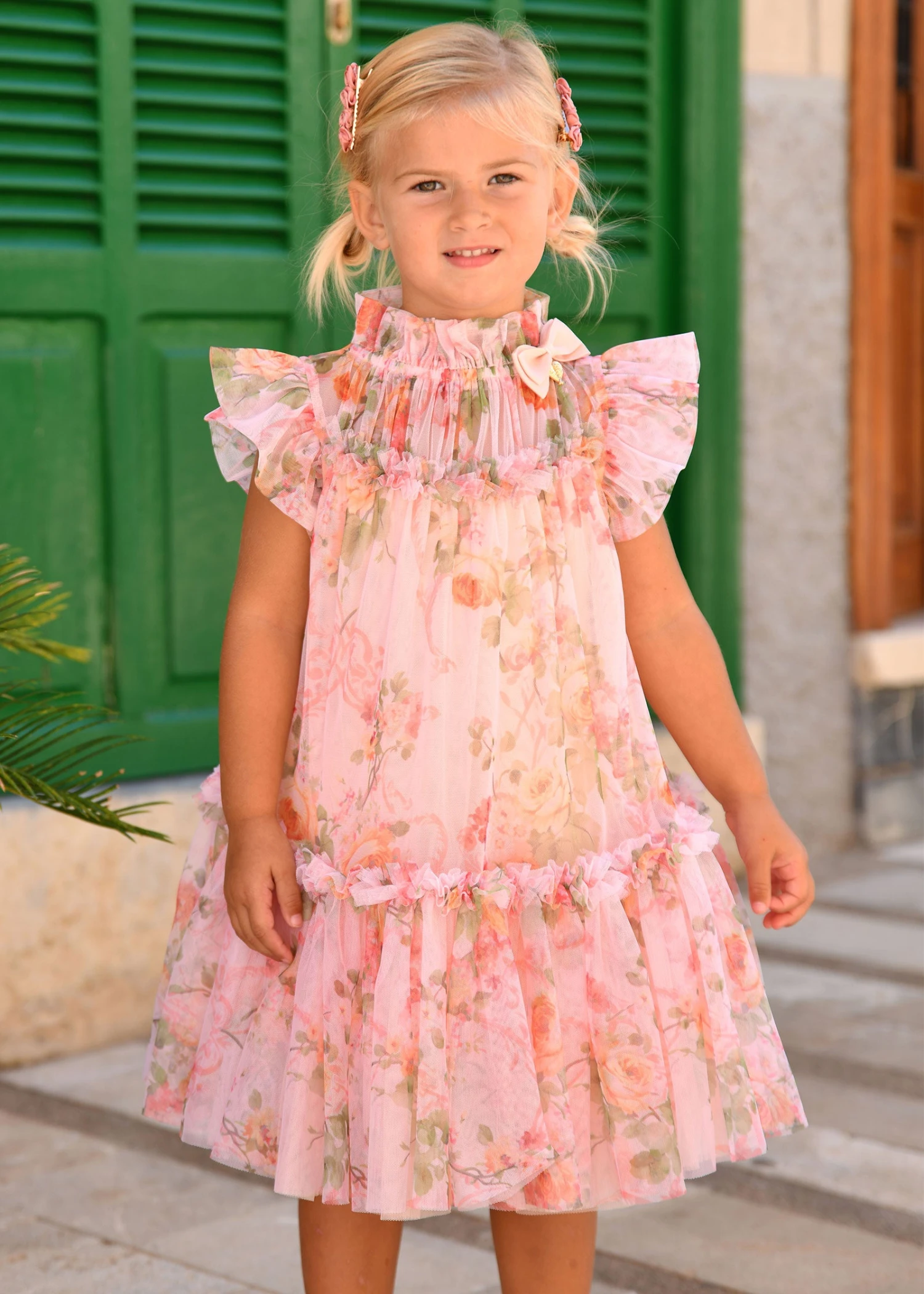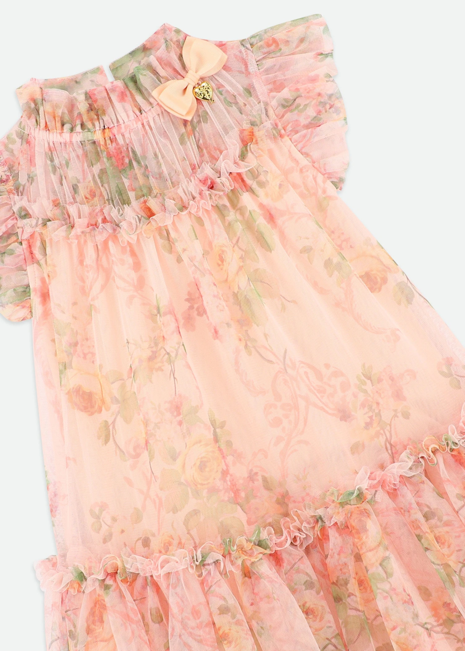 Gorgeous peach and green rose printed summer dress for girls. The dress is made from voluminous soft tulle, fully lined in soft cotton. Detailed with our signature bow and gold heart charm on the neckline, fastening at the back with a gold logo button.