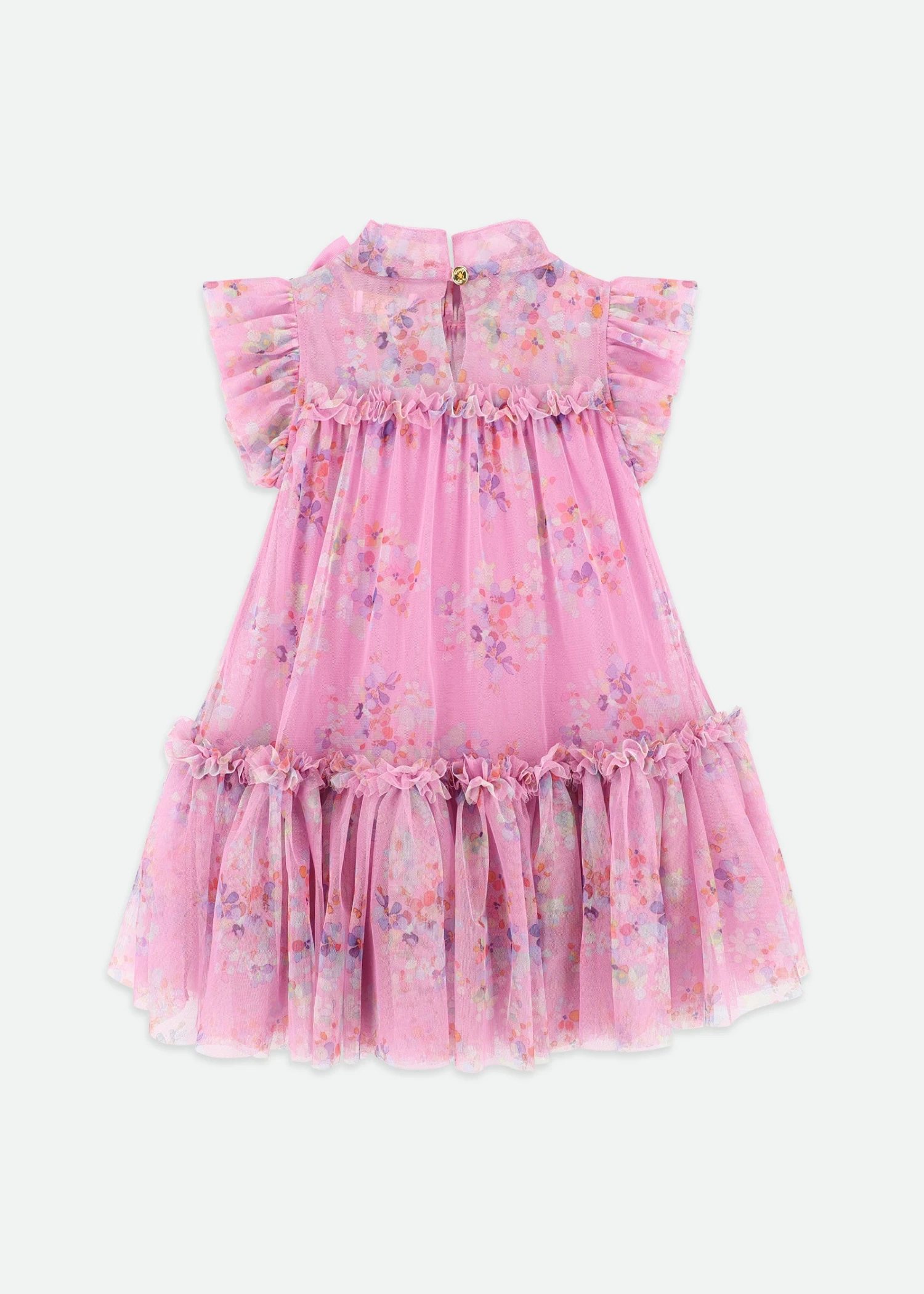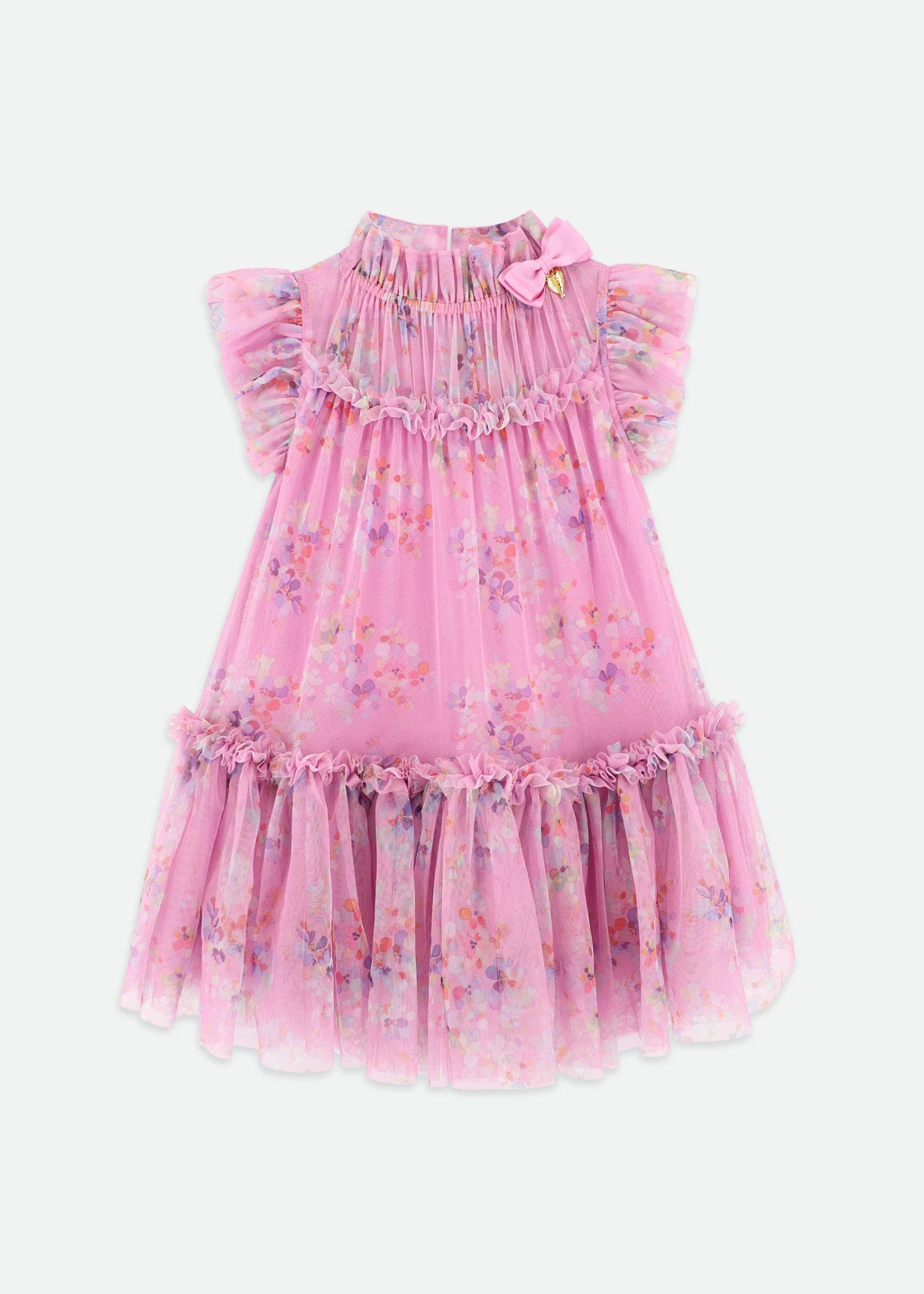 Gorgeous lilac printed summer dress for girls. The dress is made from voluminous soft tulle, fully lined in soft cotton. Detailed with our signature bow and gold heart charm on the neckline, fastening at the back with a gold logo button.
