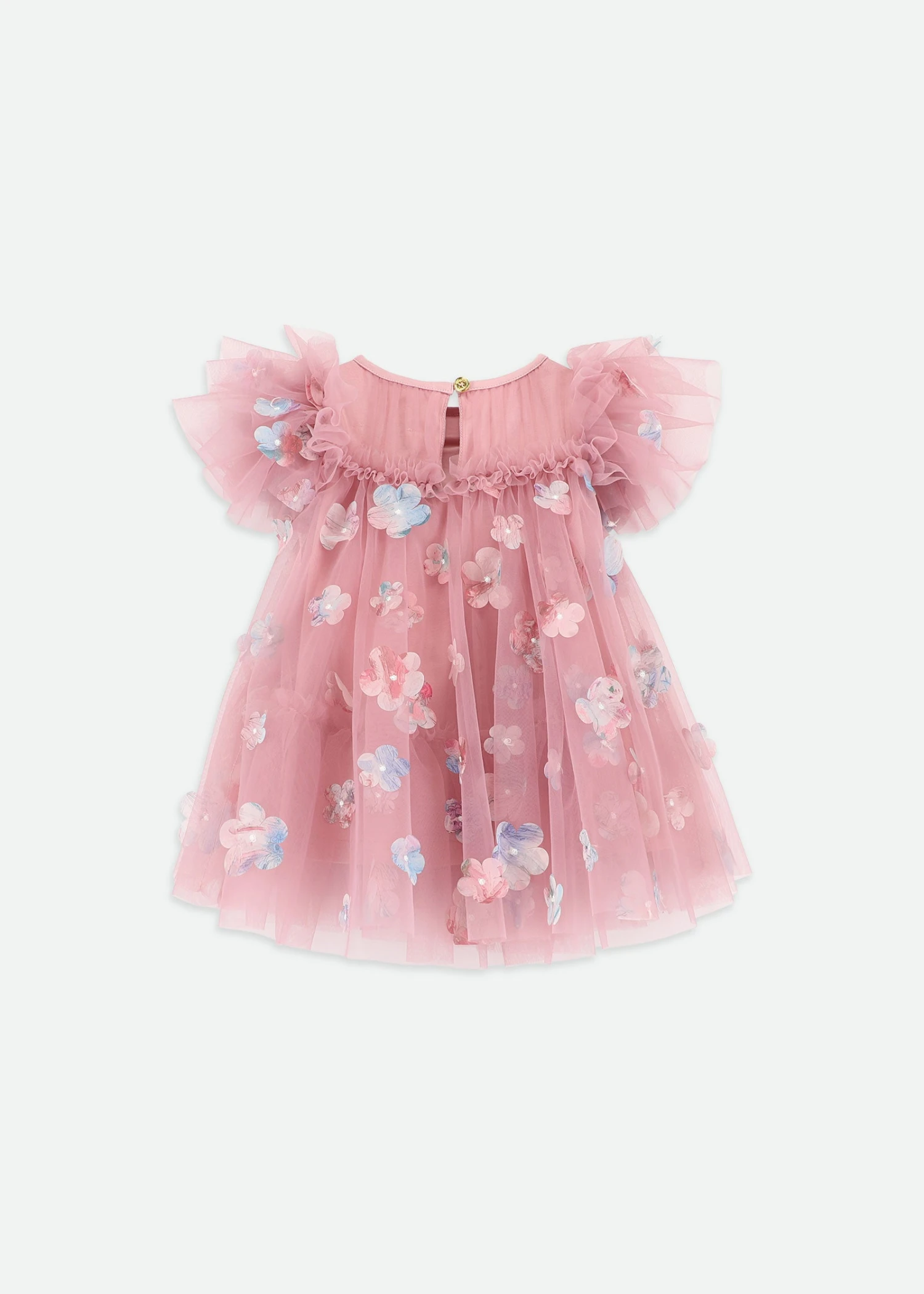 Feel like a little princess in this magical pink tulle dress for girls. Decorated all over with pretty 3D flowers that flutter with every twirl, this dress is perfect for parties and special occasions. It has soft ruffles across the chest and layered frill sleeves for extra charm. Fully lined in smooth cotton to keep you comfy. Finished with the Angel’s Face signature bow on the neckline and a button fastening at the back.