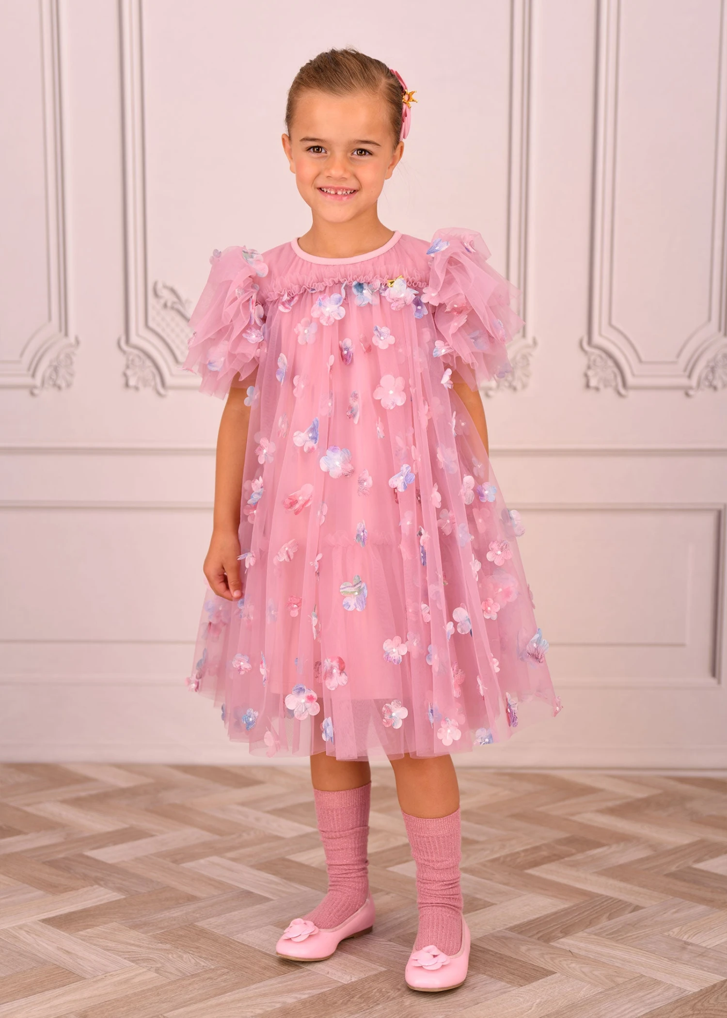 Feel like a fairy princess in this magical pink tulle dress for girls. Decorated all over with pretty 3D flowers that flutter with every twirl, this dress is perfect for parties and special occasions. It has soft ruffles across the chest and layered frill sleeves for extra charm. Fully lined in smooth cotton to keep you comfy. Finished with the Angel’s Face signature gold heart logo stud on the neckline and a button fastening at the back.