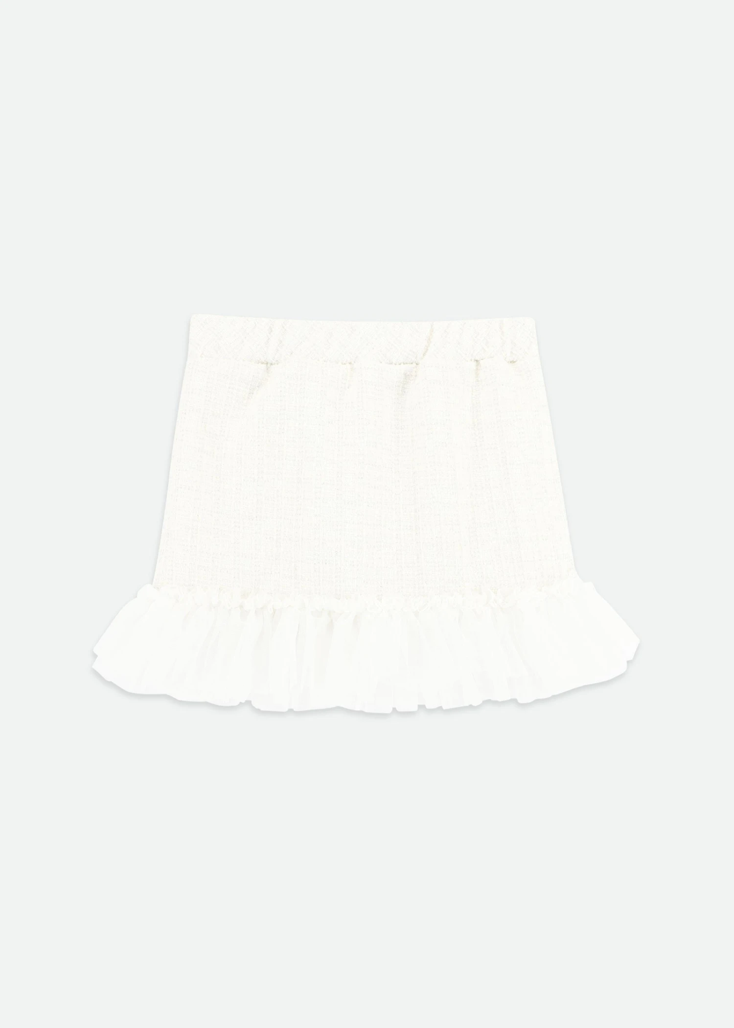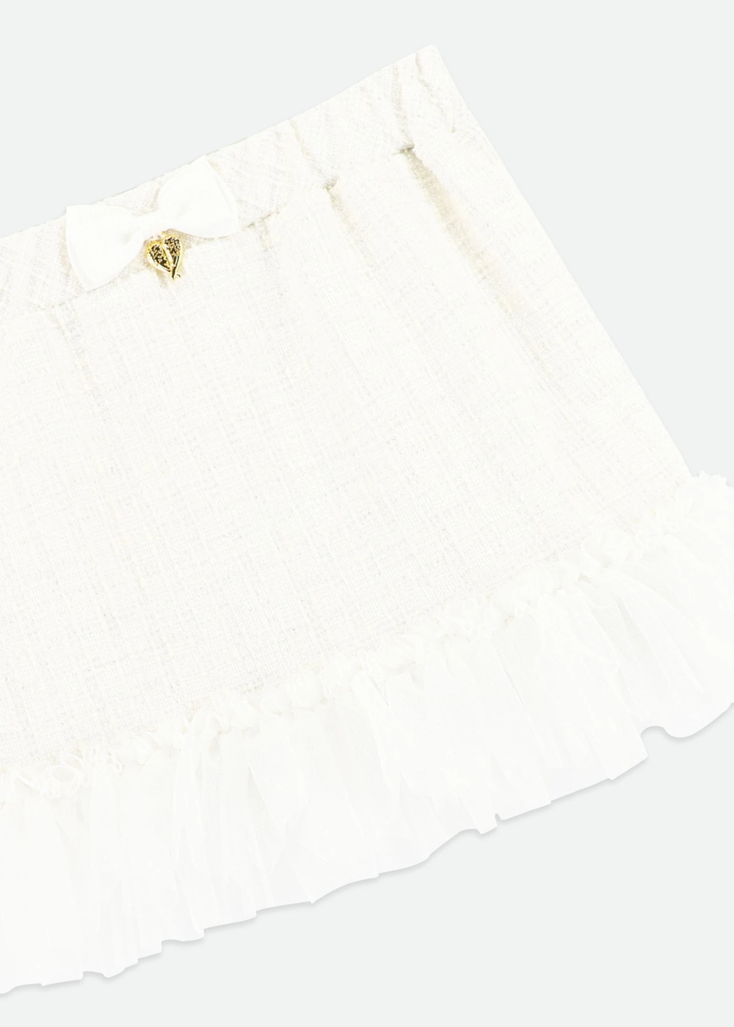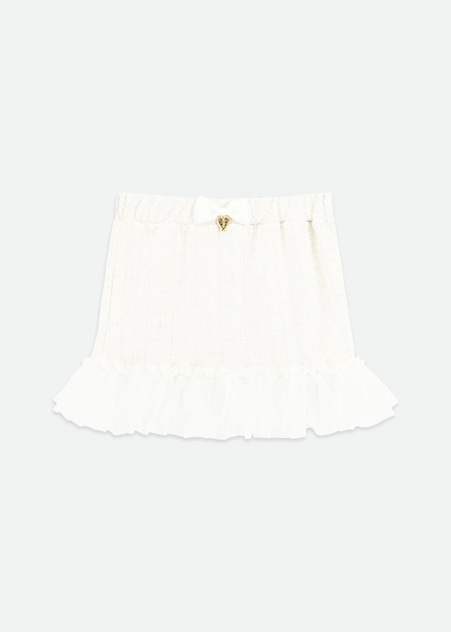 Luxury tweed skirt in snowdrop, featuring a tulle trim, the ultimate Angel’s Face style. The skirt is fully lined in a comfortable cotton blend and soft stretch elasticated waist. Features an Angel’s Face signature bow and gold heart charm on the waistband and a tulle ruffle on the bottom.