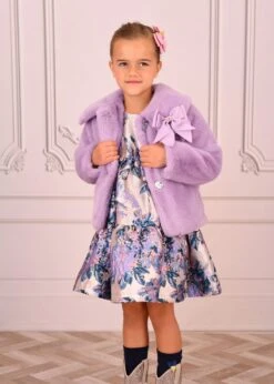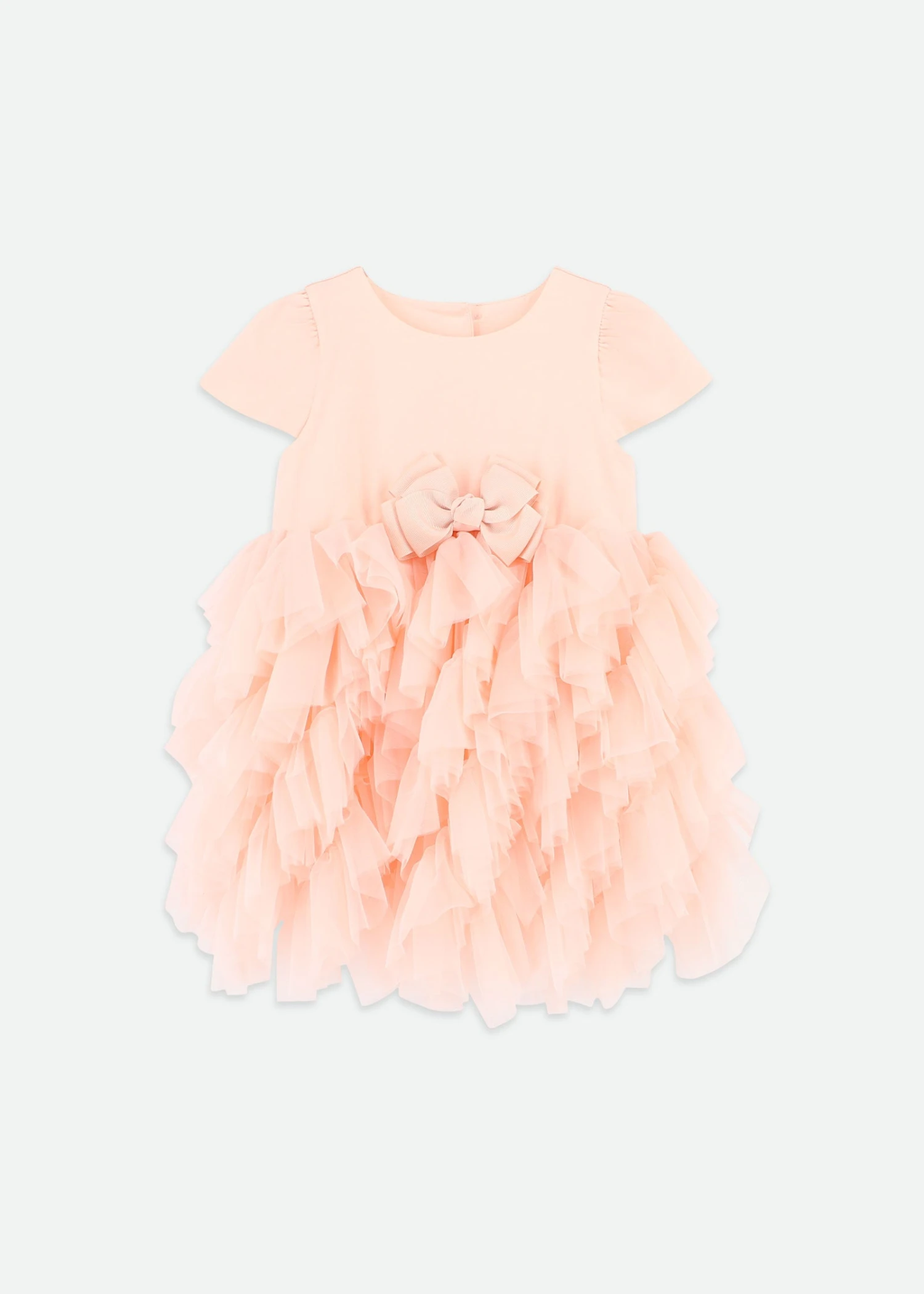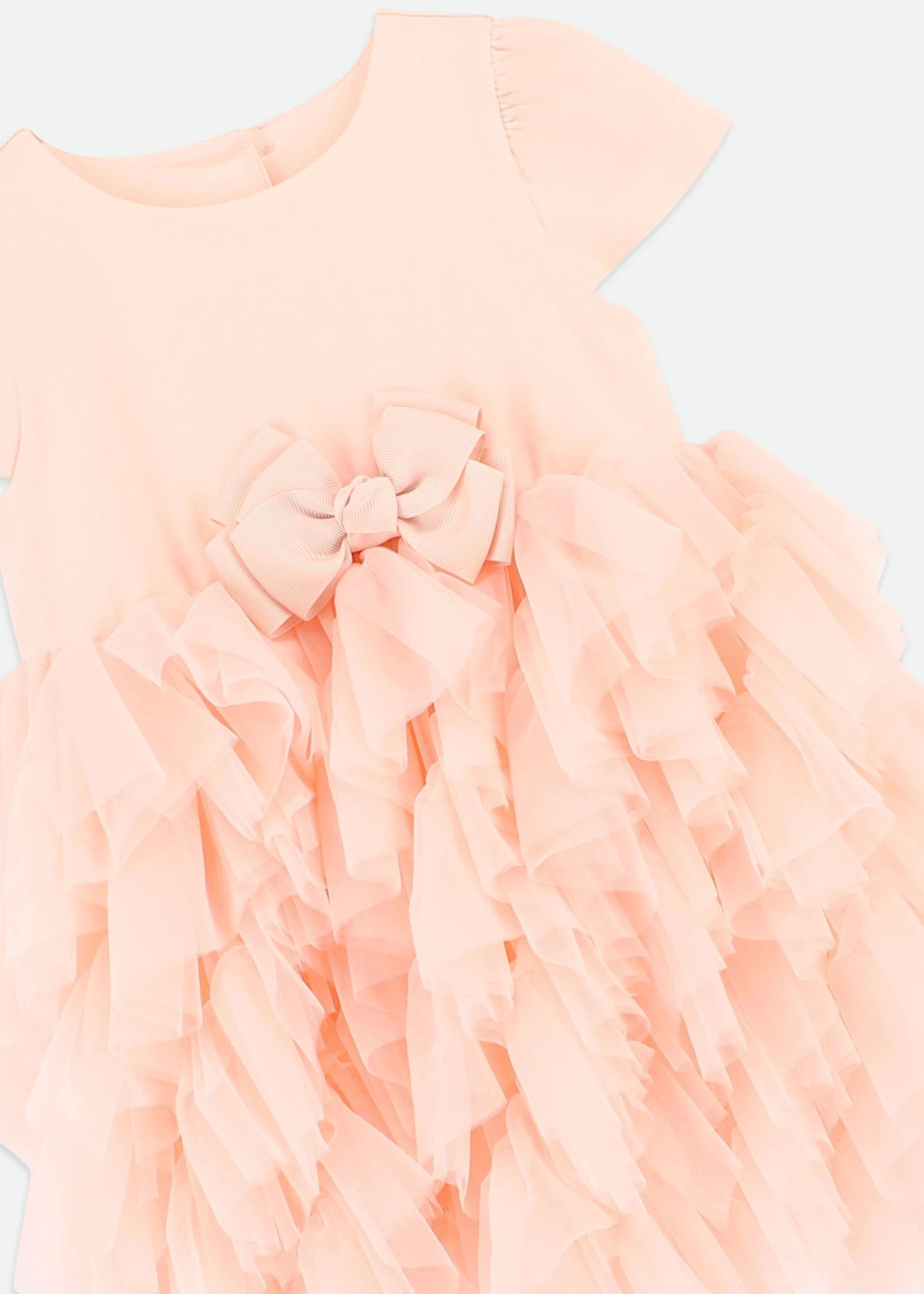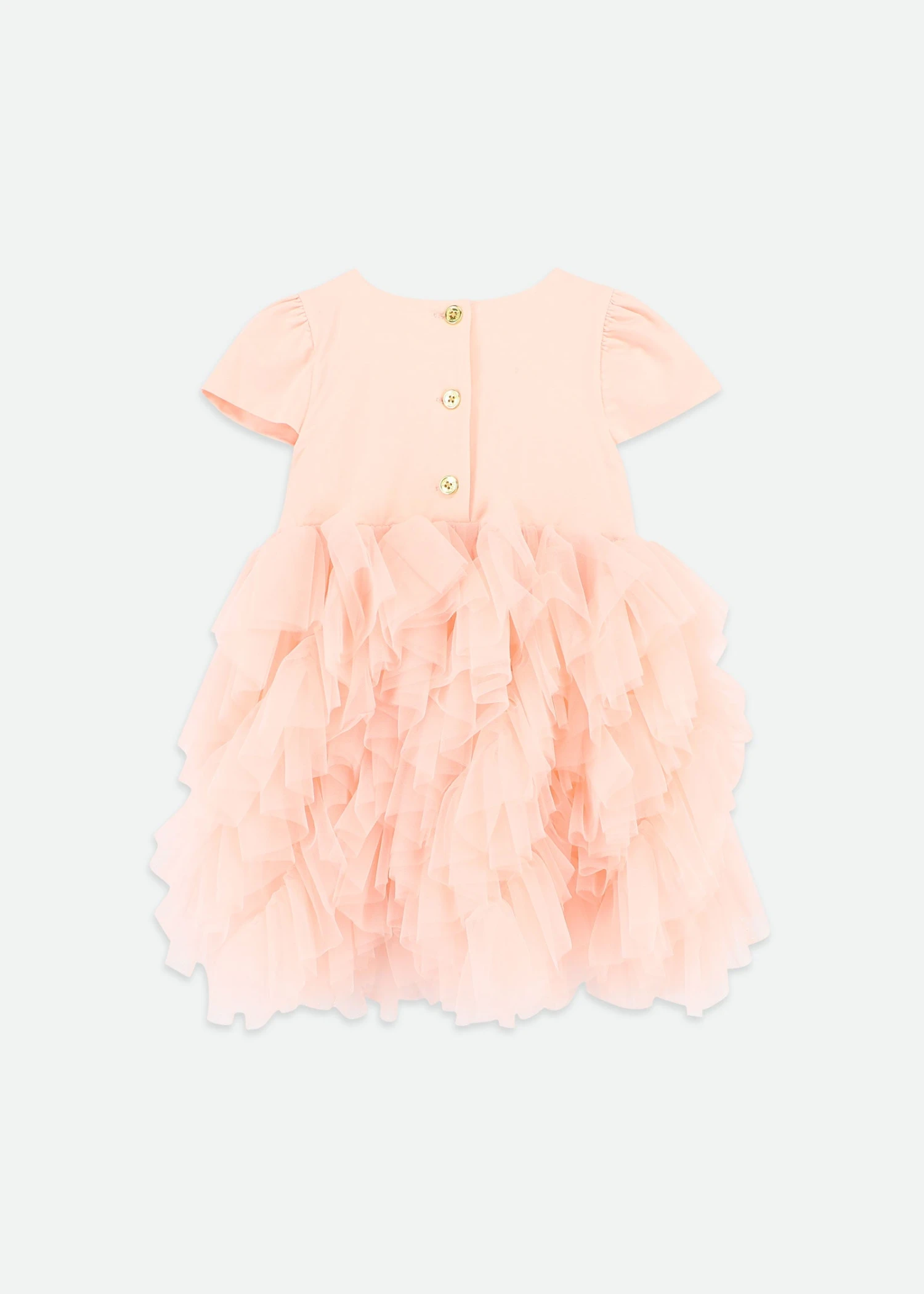 Elegant short sleeve cotton peach dress with tulle skirt. This dress features layers and layers of soft diagonal tulle. Finished with our signature bow on the waist and fastens at the back with gold logo buttons.