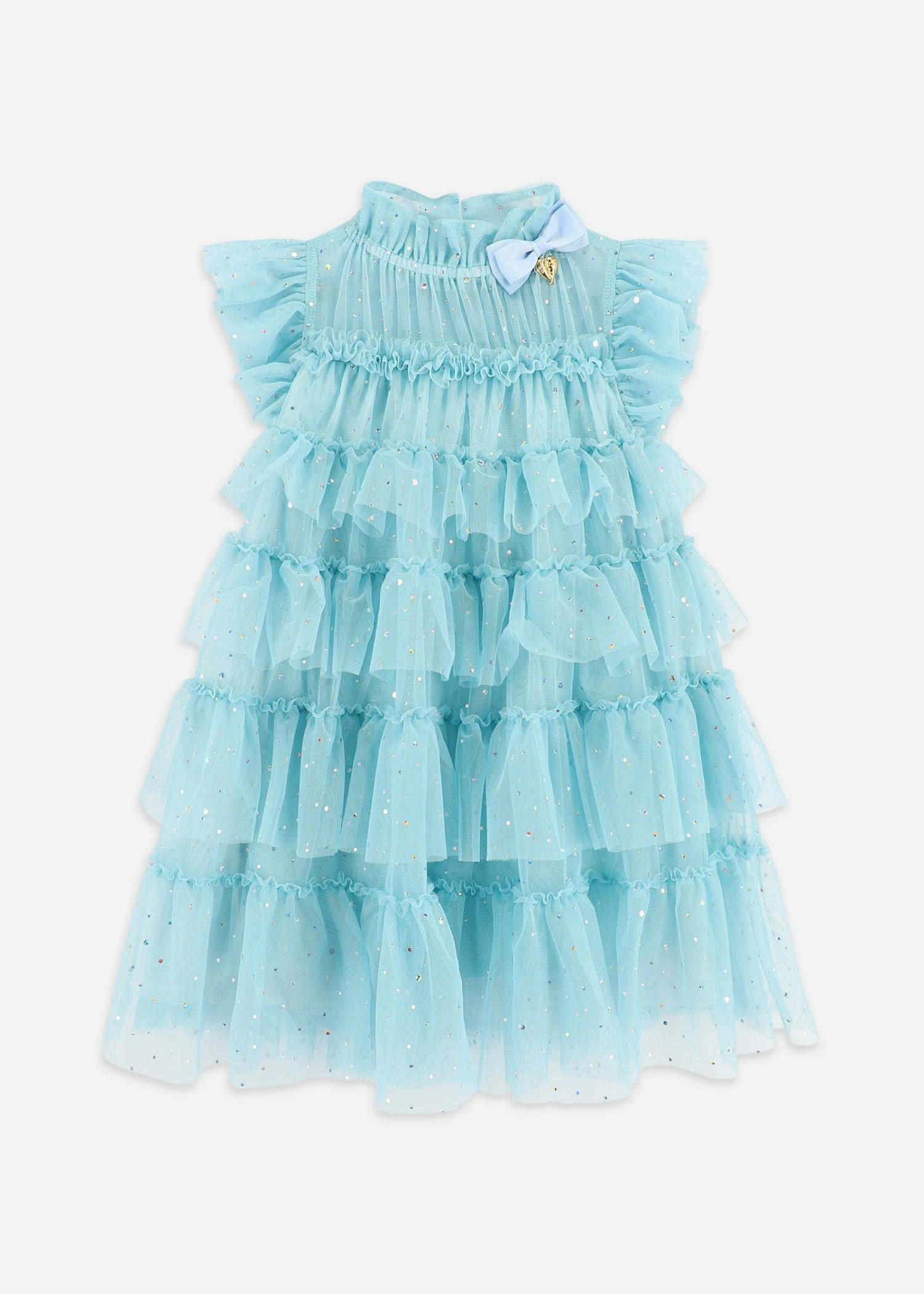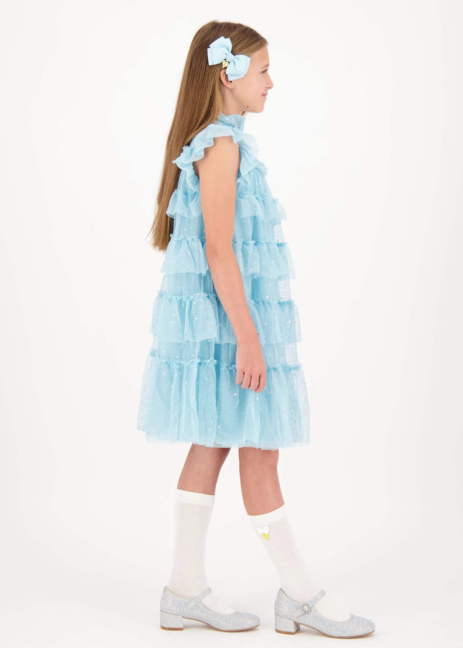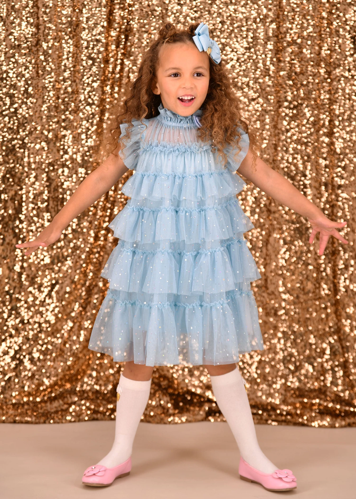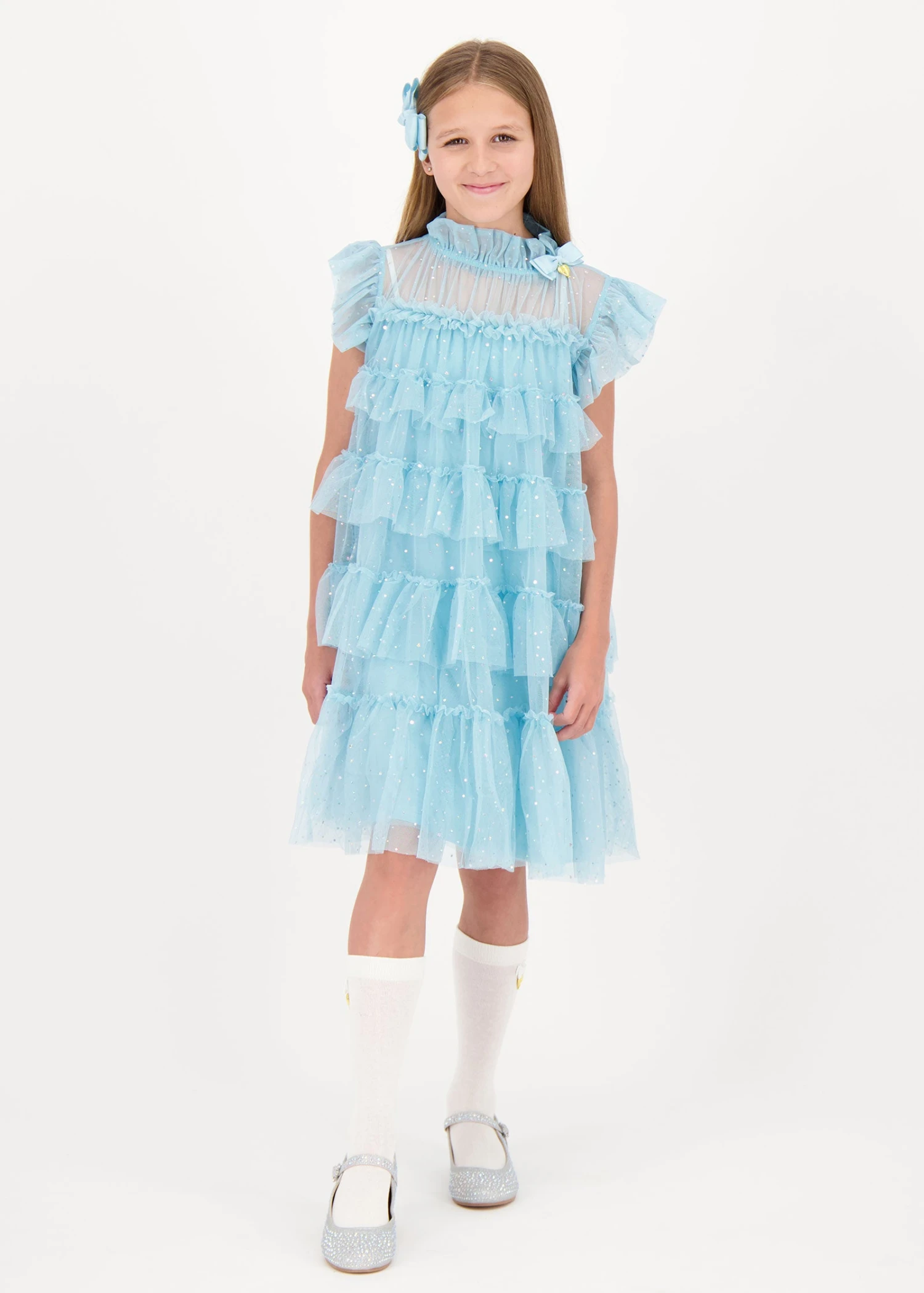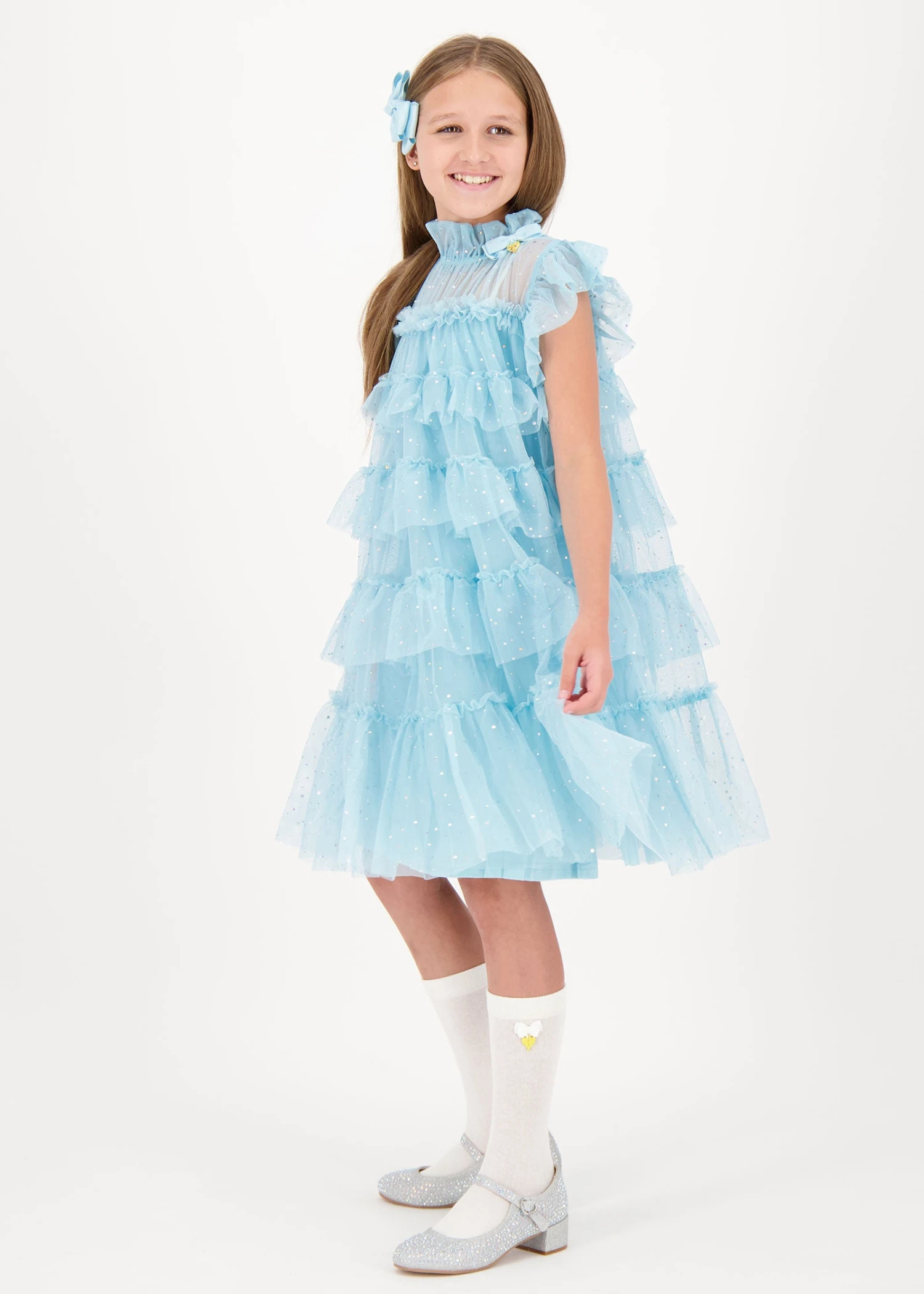 Pretty porcelain blue tiered tulle dress with a sparkle finish. The dress is made from voluminous soft tulle, fully lined in soft cotton. Detailed with our signature bow and gold heart charm on the neckline, fastening at the back with a gold logo button.