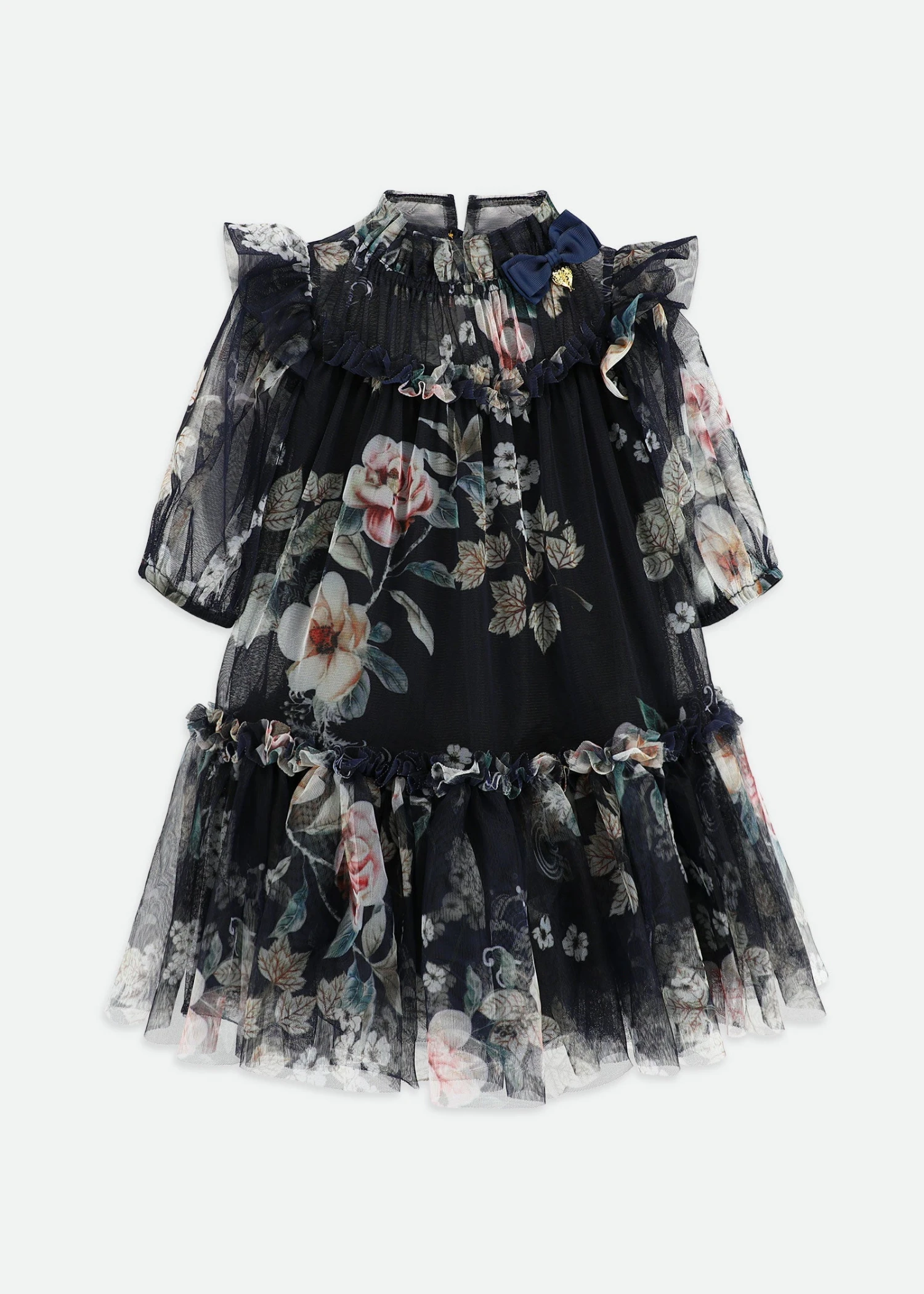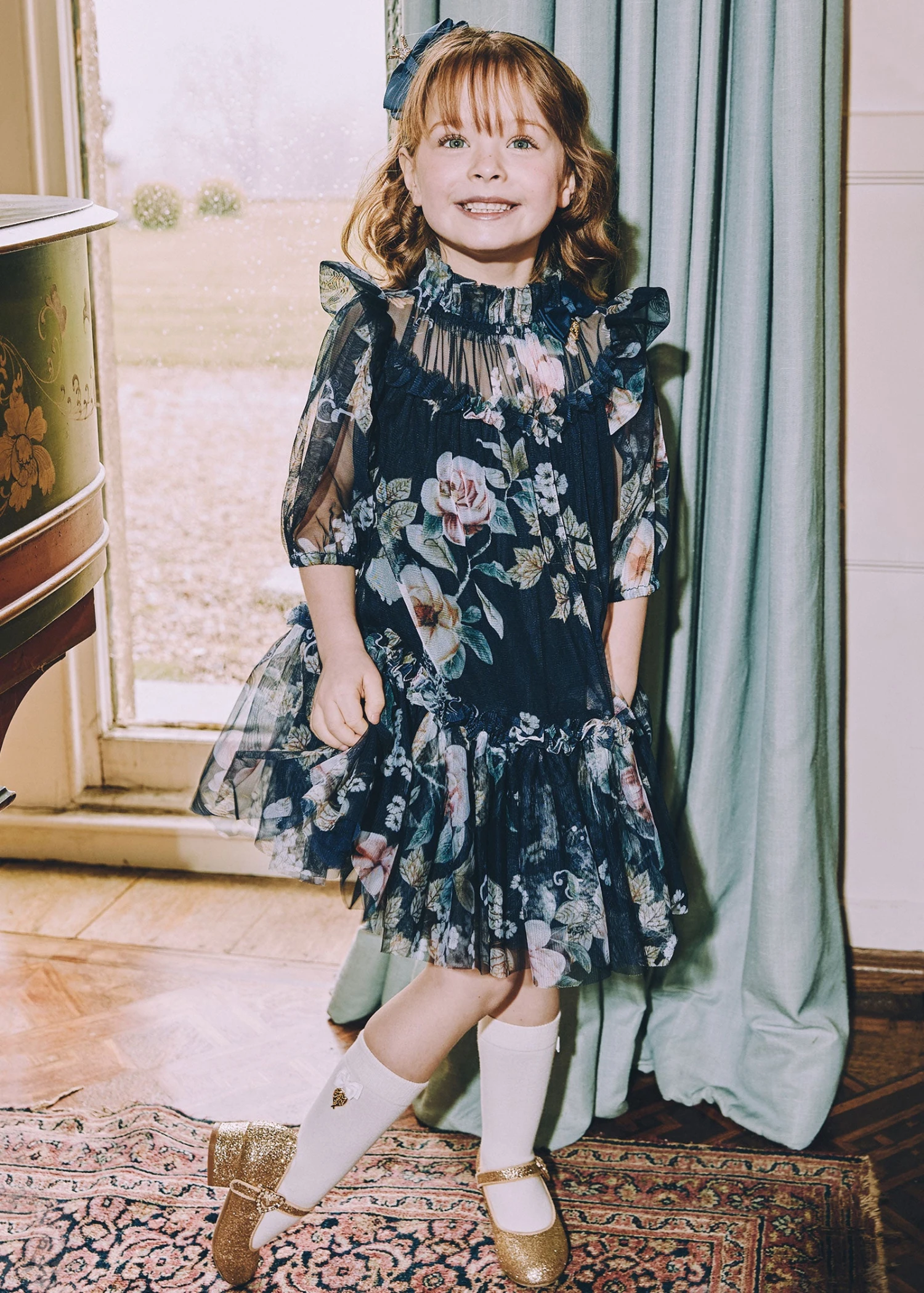 Make an entrance in this autumnal navy floral soft tulle dress for girls. This voluminous tulle dress is perfect for parties or special days. Three-quarter sleeve, frills at the neck yoke and skirt. Fully lined in a soft stretch cotton blend. The dress is complete with our signature bow and gold heart charm on the neckline, fastening at the back with a gold button.
