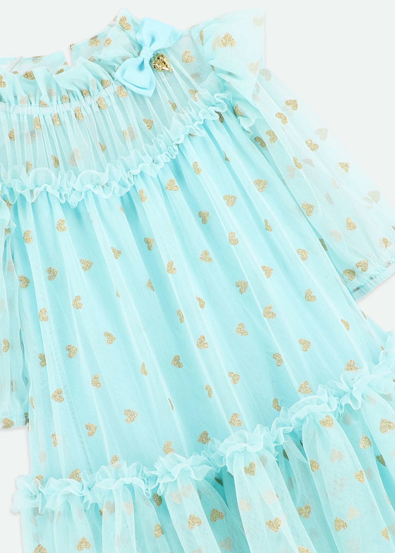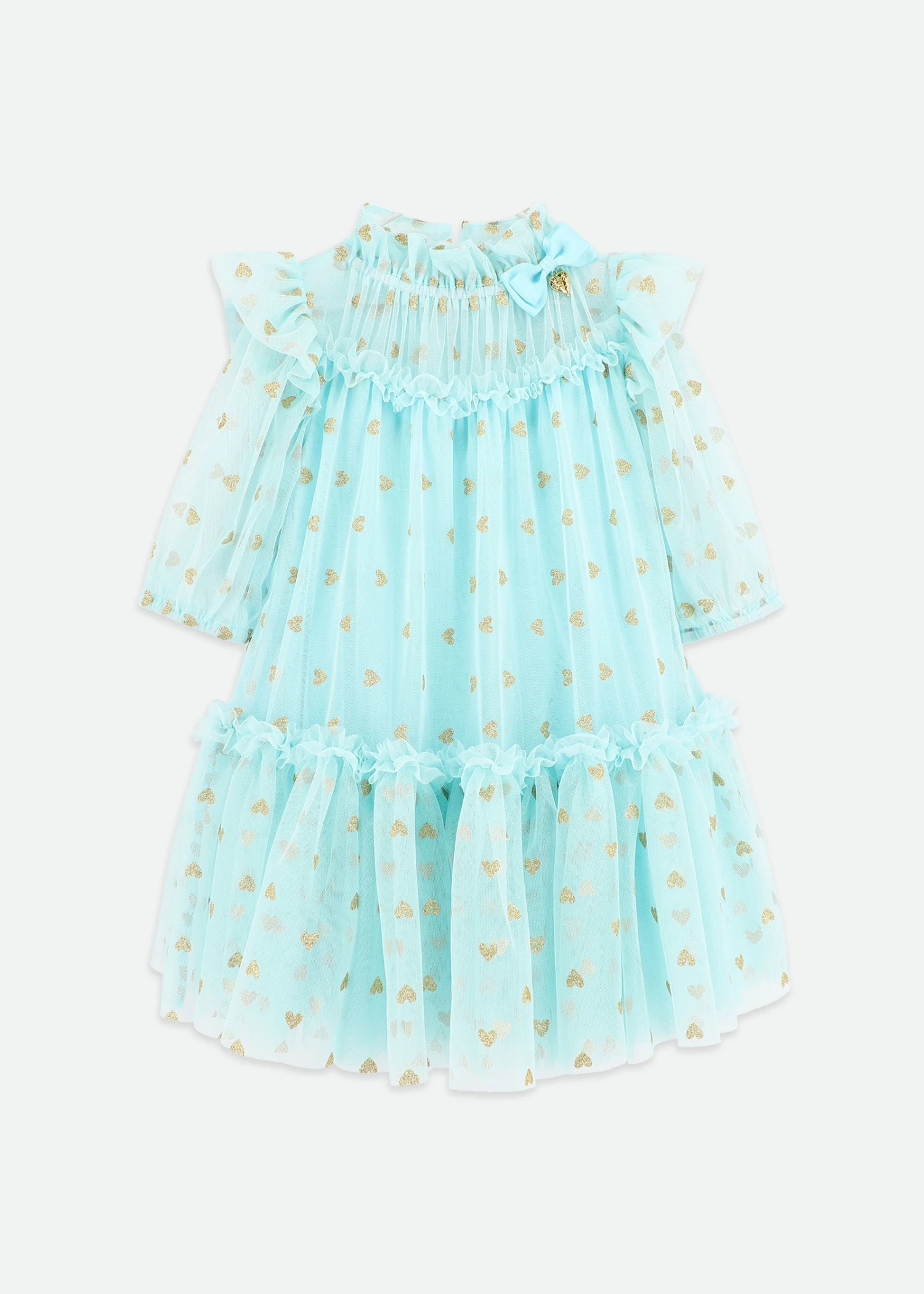 Make an entrance in this aqua soft tulle dress with little gold glitter hearts. This voluminous tulle dress is perfect for parties or special days. Three-quarter sleeve, frills at the neck yoke and skirt. Fully lined in a soft stretch cotton blend. The dress is complete with our signature bow and gold heart charm on the neckline, fastening at the back with a gold button.