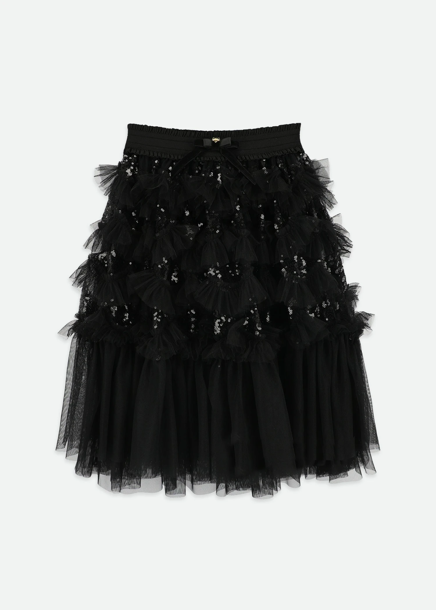 Luxurious sequin longline skirt for girls in black. Made from tiers of voluminous tulle and sequins, fully lined, with a soft stretch elasticated waistband. The skirt is complete with a velvet bow and our signature gold heart stud, centre of the waist.