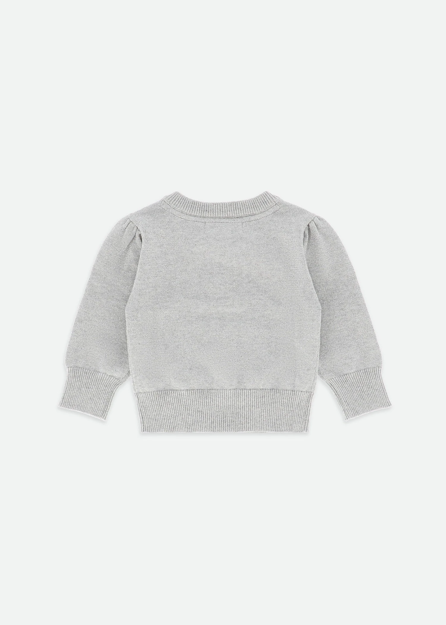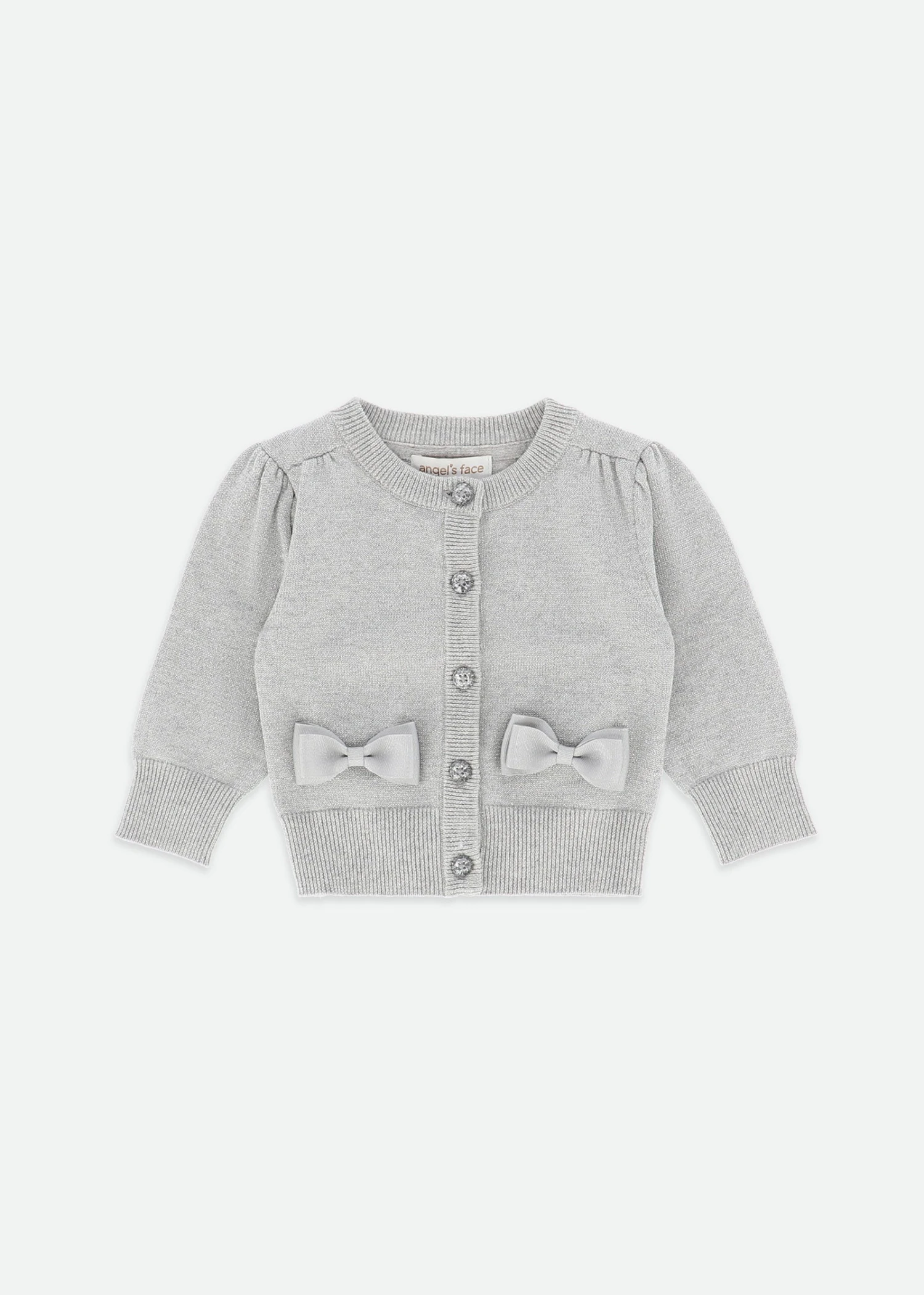 Fine knitted cotton blend silver cardigan with a touch of sparkle. Round neck cardigan which fastens down the front with silver crystal buttons. The delicate gathers on the sleeves and shoulders make this the perfect piece to wear over any dress. Ribbed detail on the cuffs and hems and finished with two of our signature bows and gold heart studs above the waist.