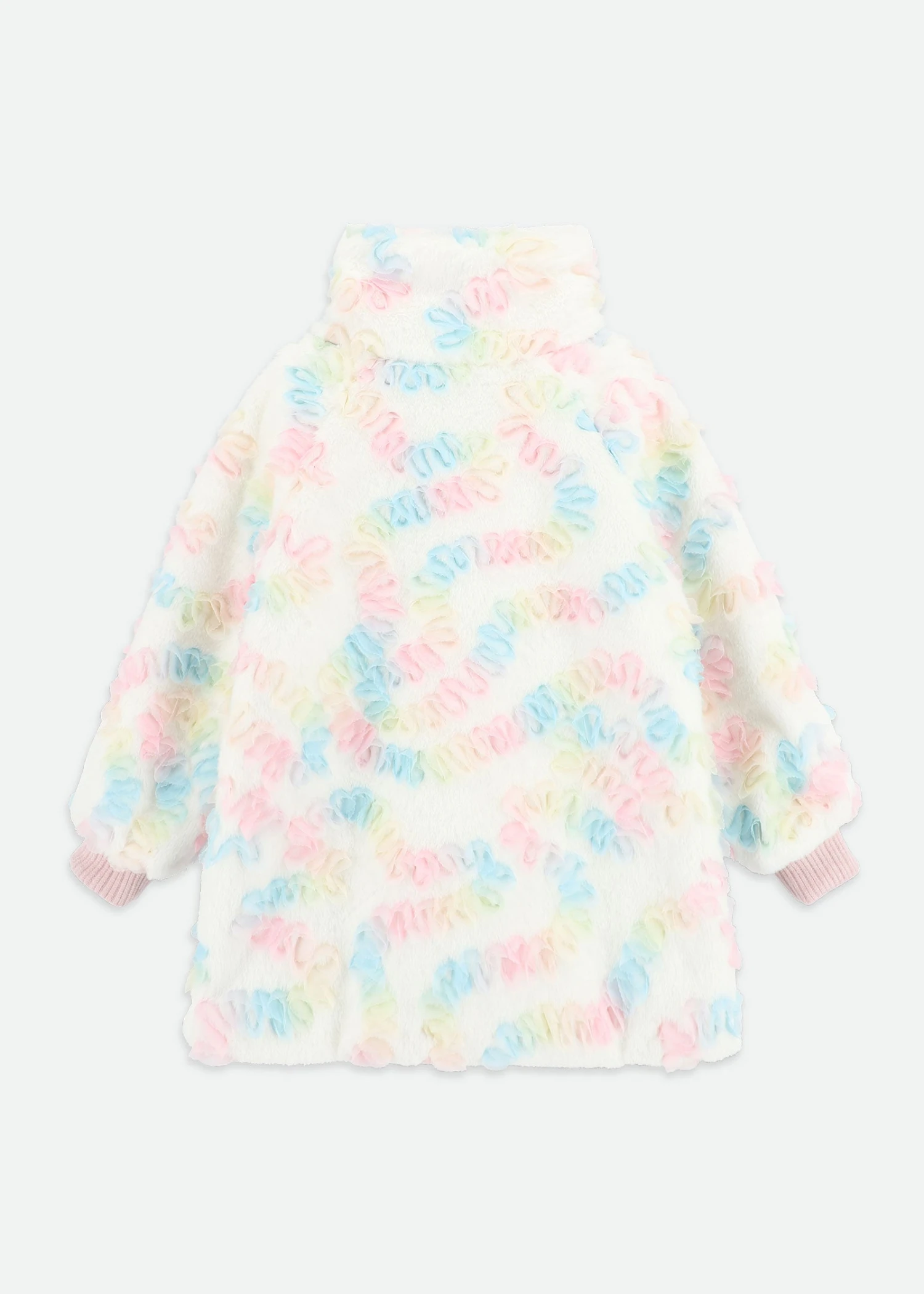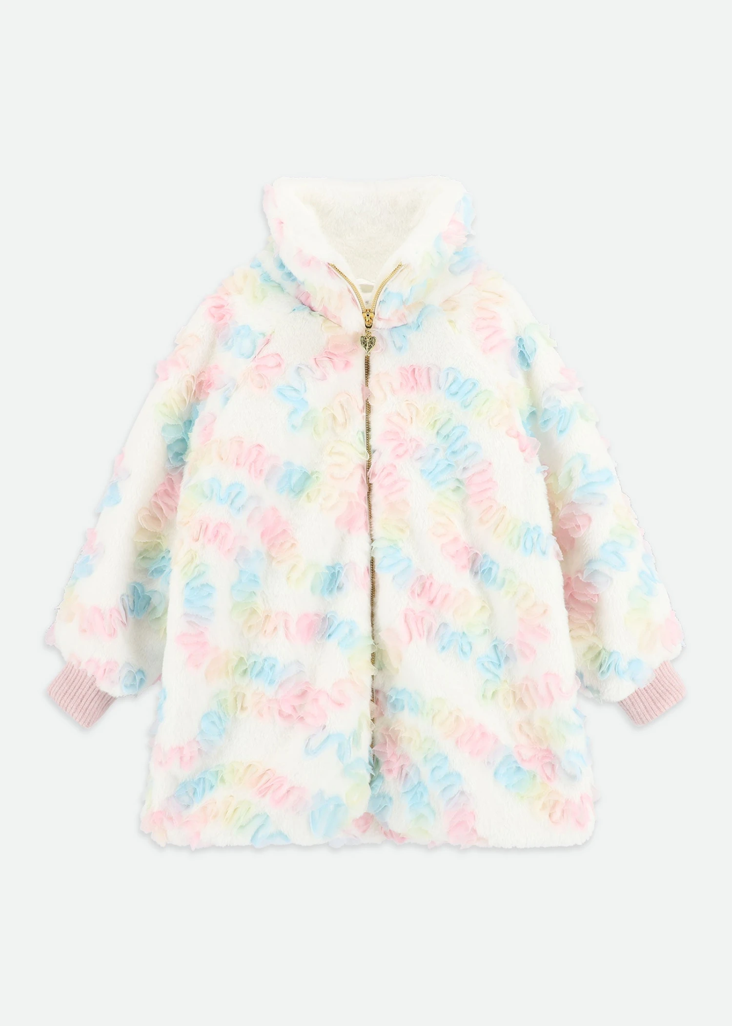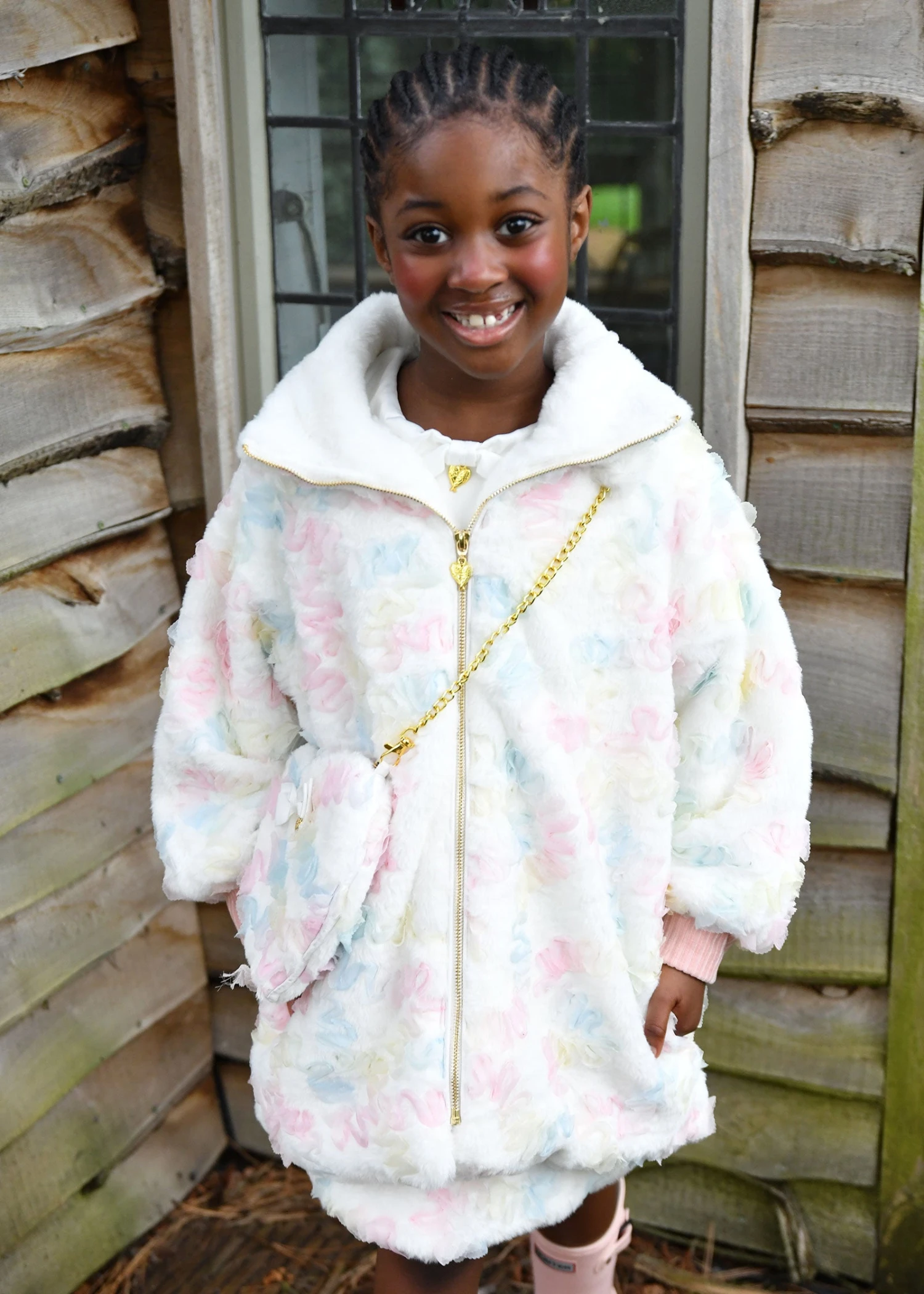 Glamorous faux fur snowdrop coat with pretty pastel tulle detailing. This luxuriously soft fur coat features a white satin lining. Sleeves are finished with a soft velvet ribbed cuff in pink. Coat has a cosy funnel neck and side pockets to keep your hands warm. Front has a gold zip with Angel’s Face charm puller.
