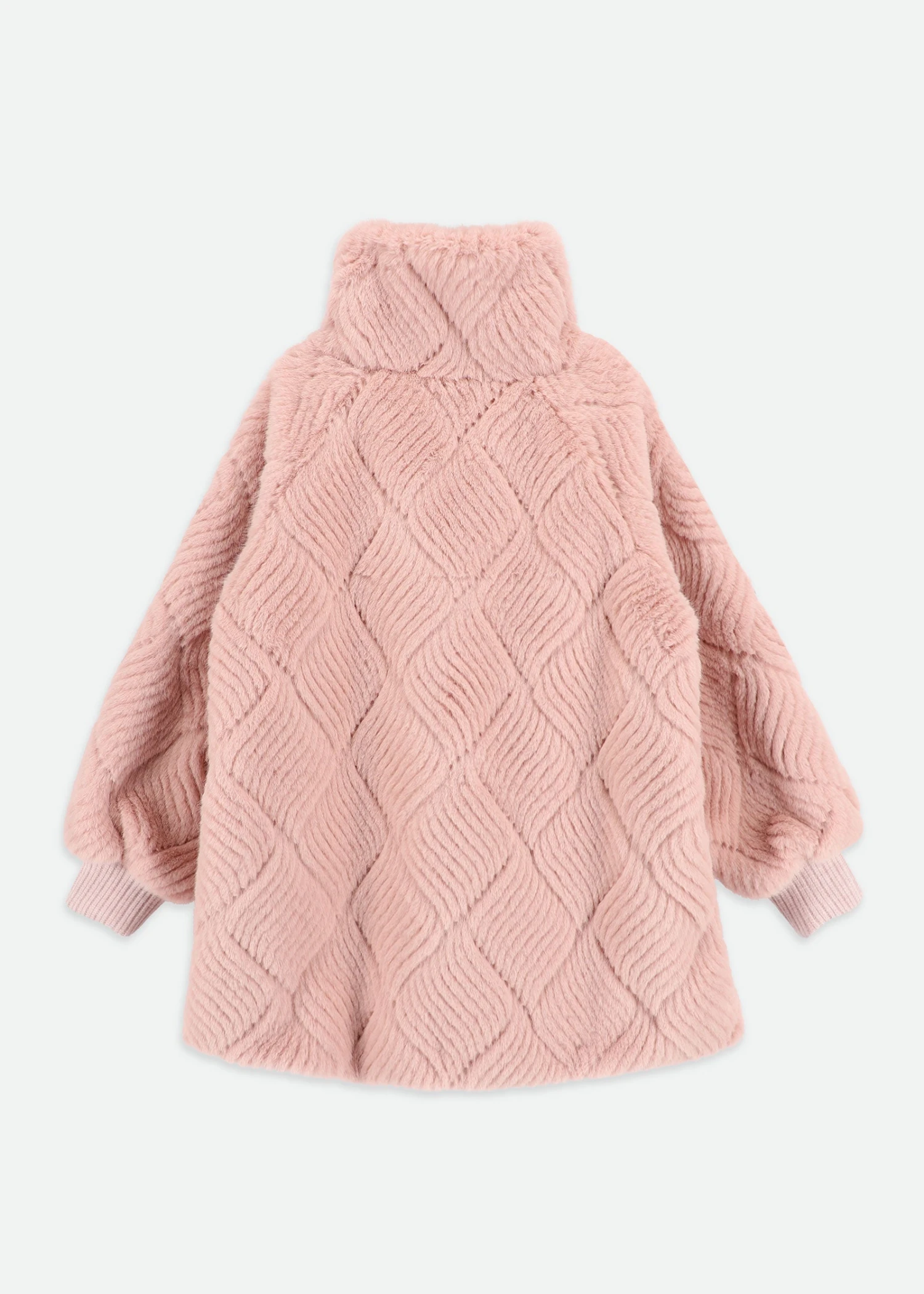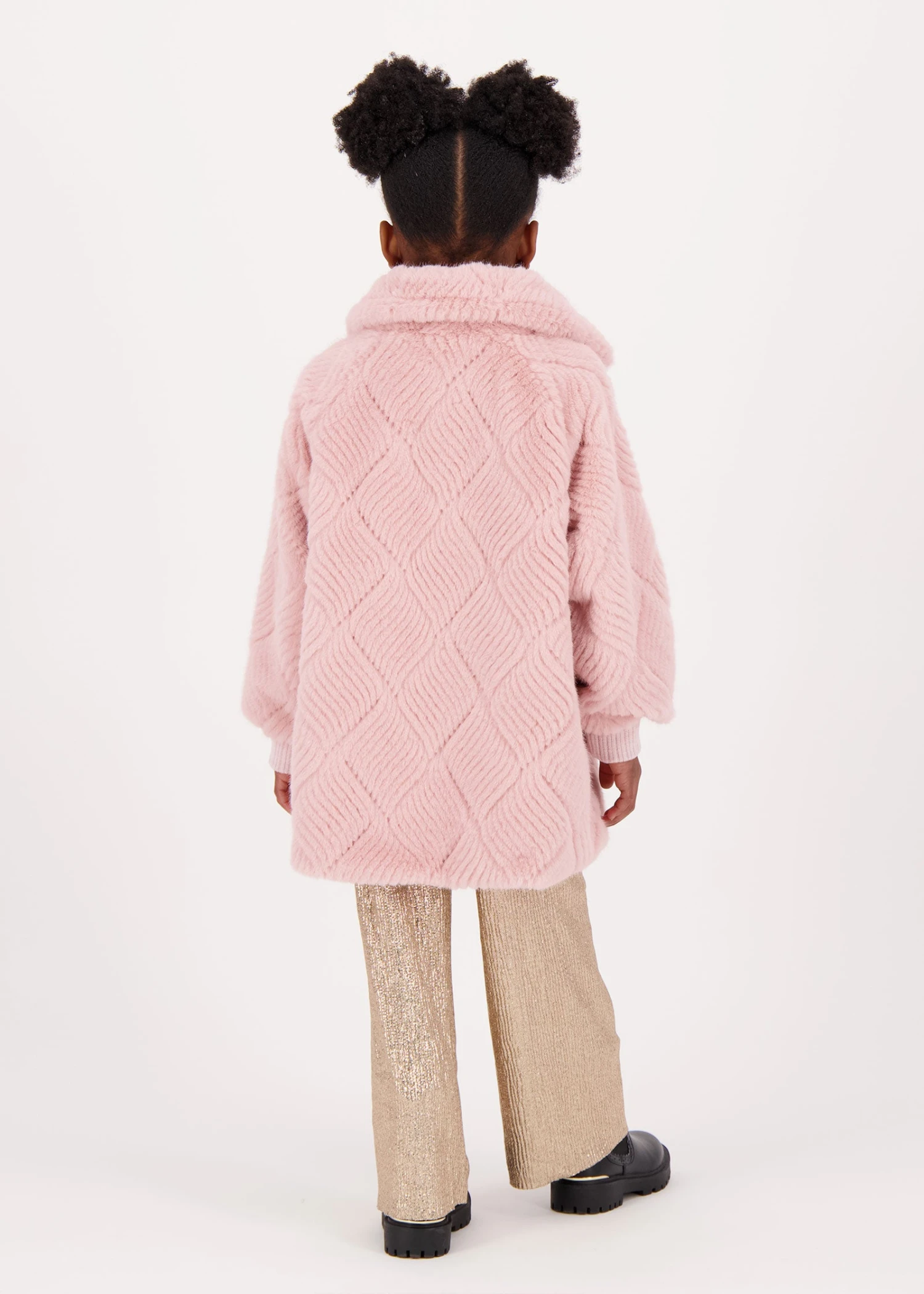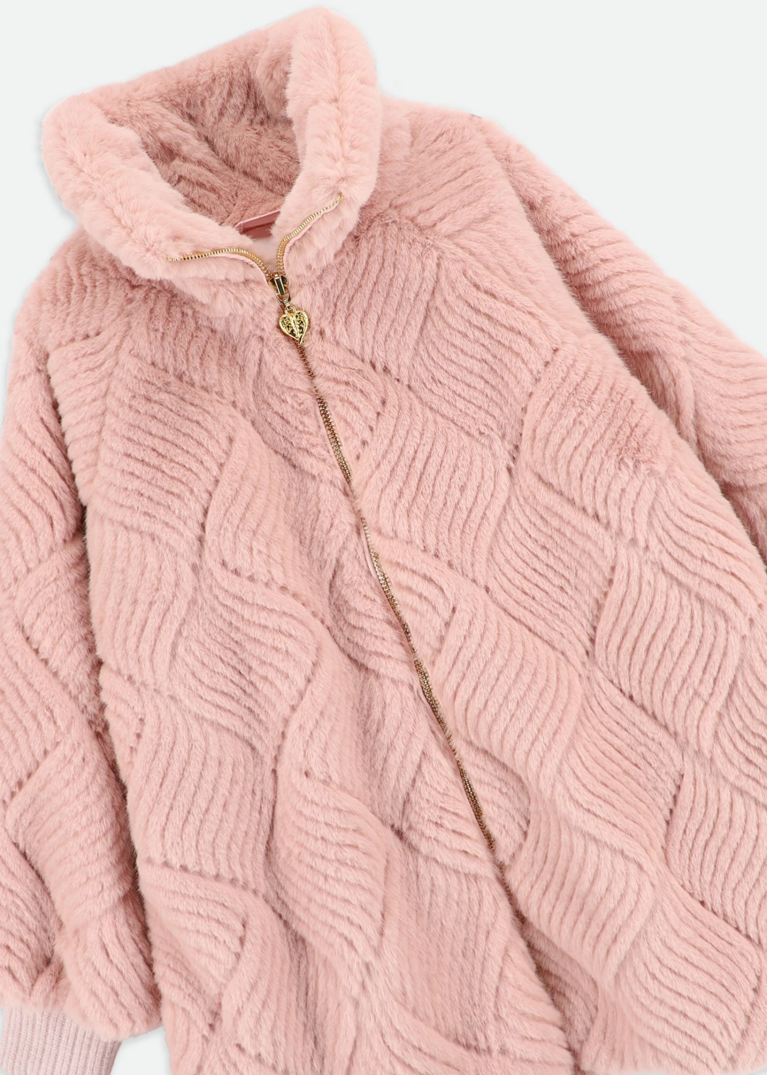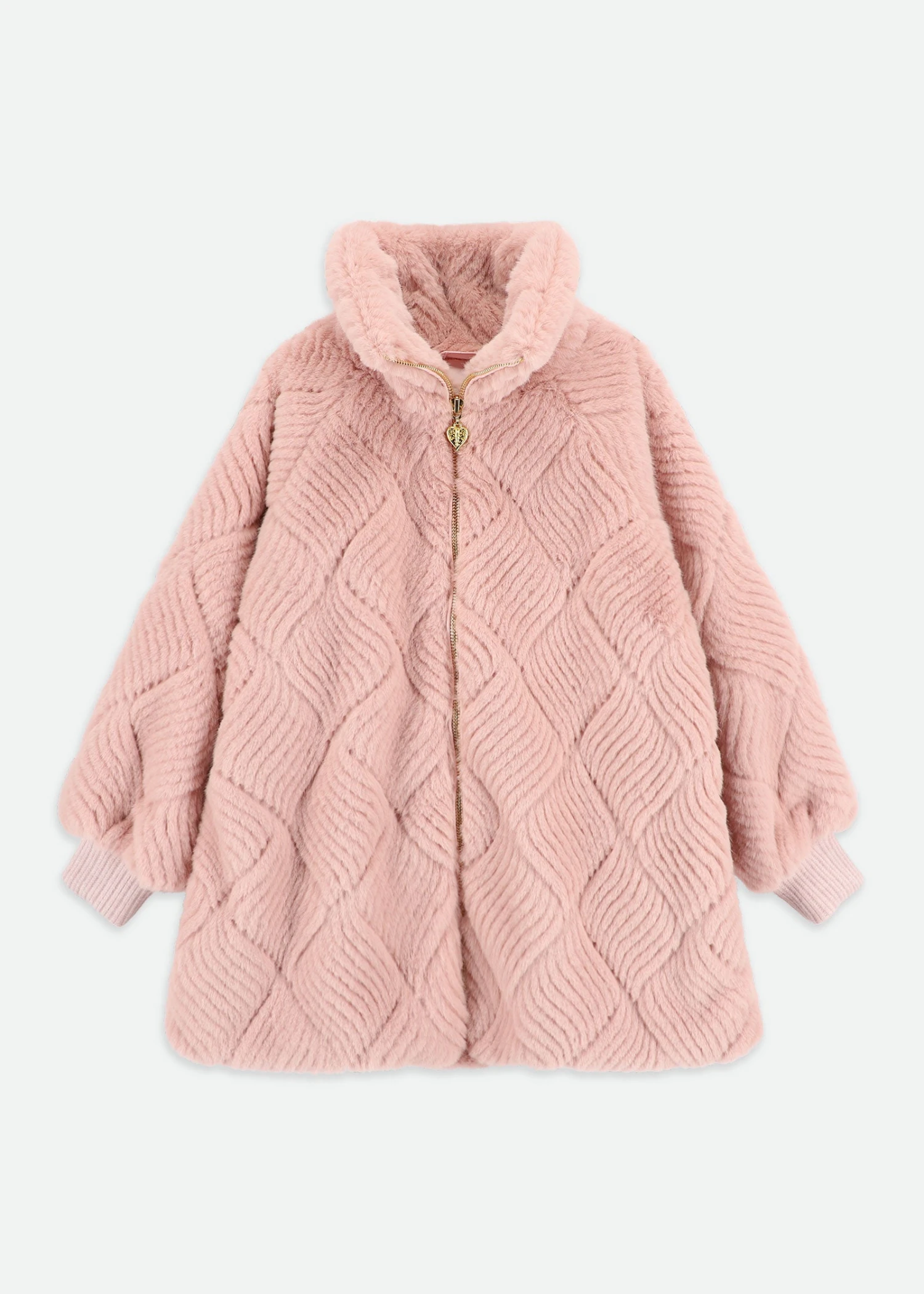Glamorous faux fur pink coat with weave effect. This luxuriously soft fur coat features a pink satin lining. Sleeves are finished with a soft velvet ribbed cuff. Coat has a cosy funnel neck and side pockets to keep your hands warm. Front has a gold zip with Angel’s Face charm puller.