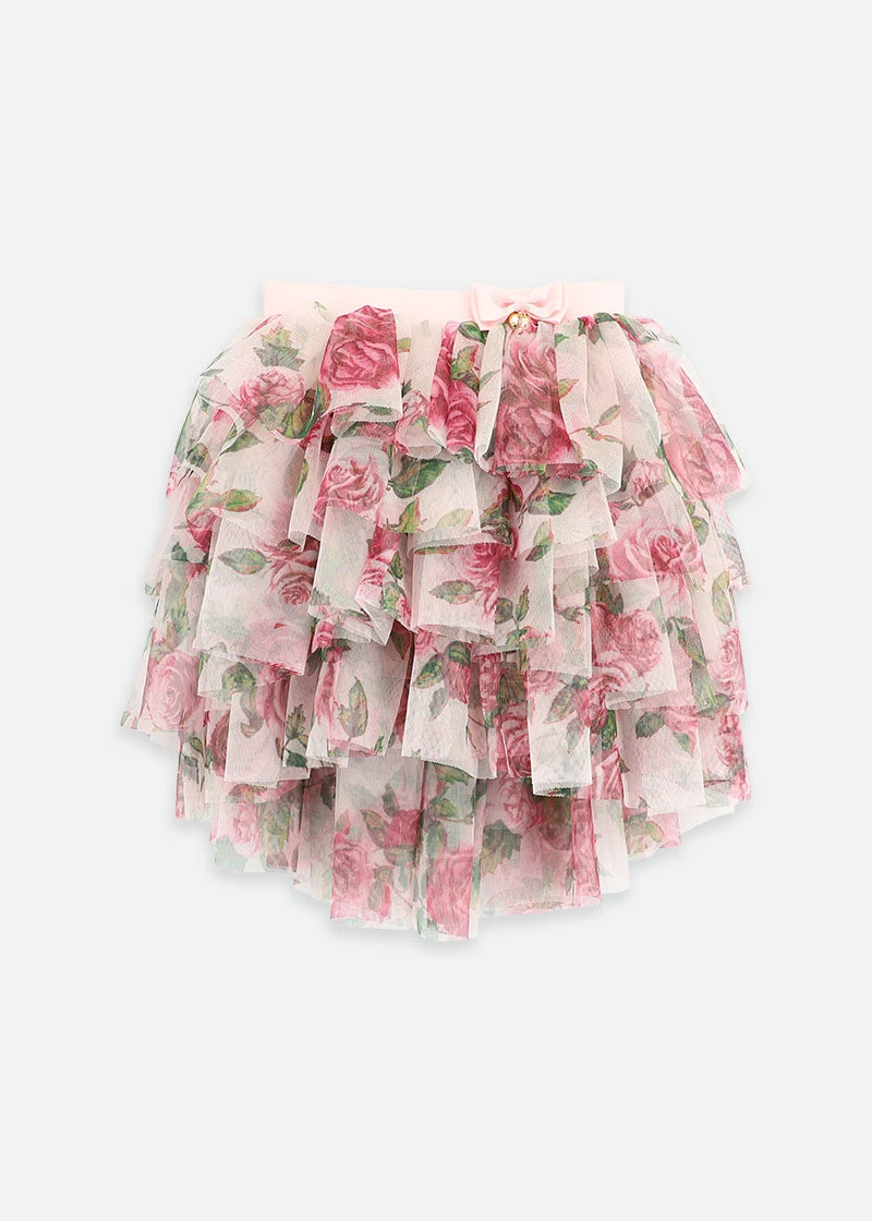 Super soft voluminous tulle skirt in a pink flower design/ the skirt has tiers of flower tulle with a dipped hem at the back. Waistband and lining made soft stretch cotton blend complete with our signature bow and gold heart charm on the waist.