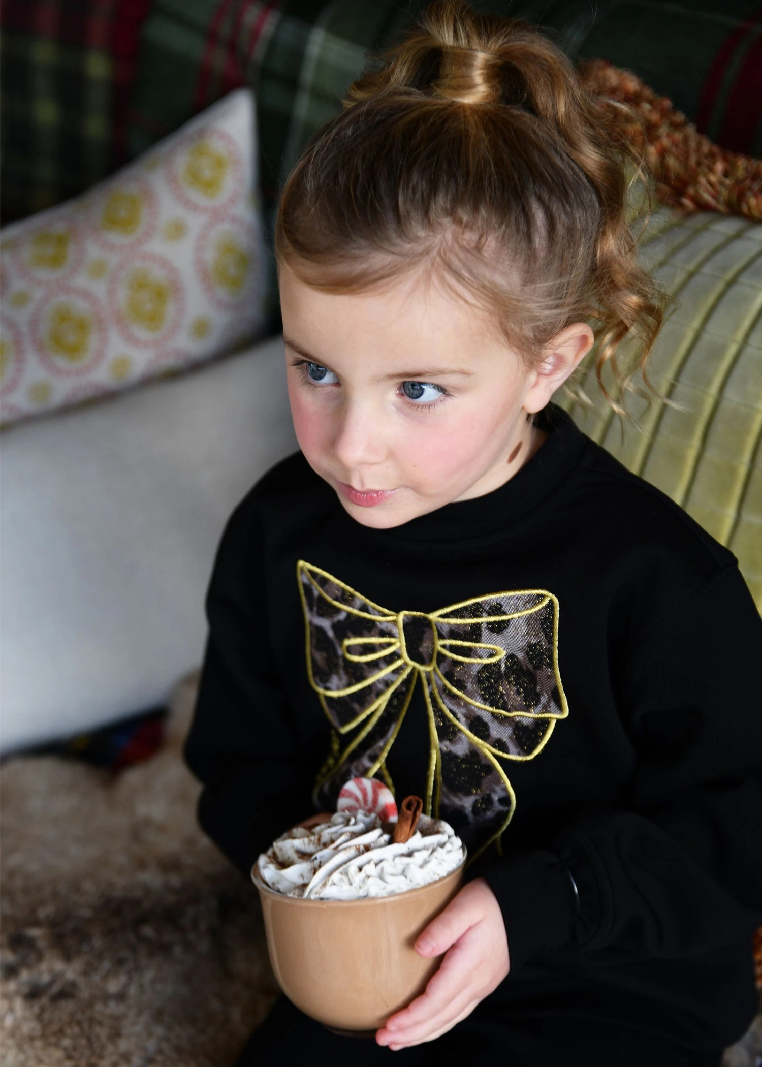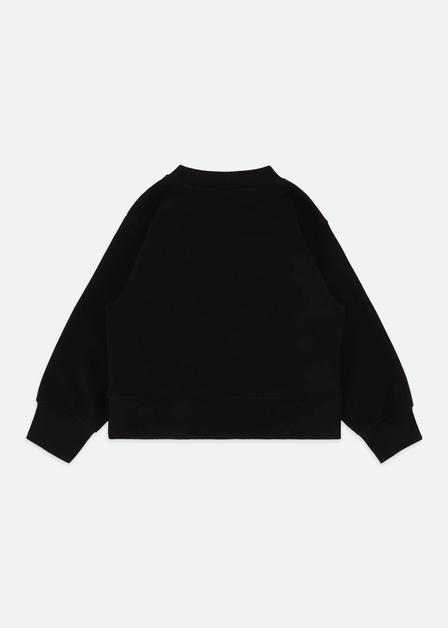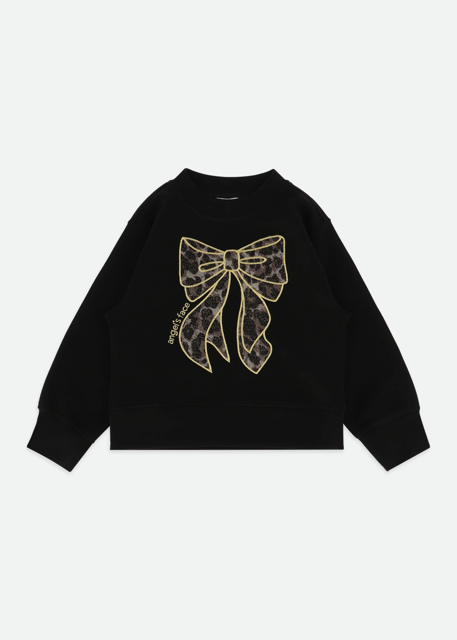 Black sweatshirt with embroidered leopard tulle bow detail on the front. Made with a soft stretch ribbed waist and neck. Relaxed fit sweat in soft cotton with ribbed cuffed details.