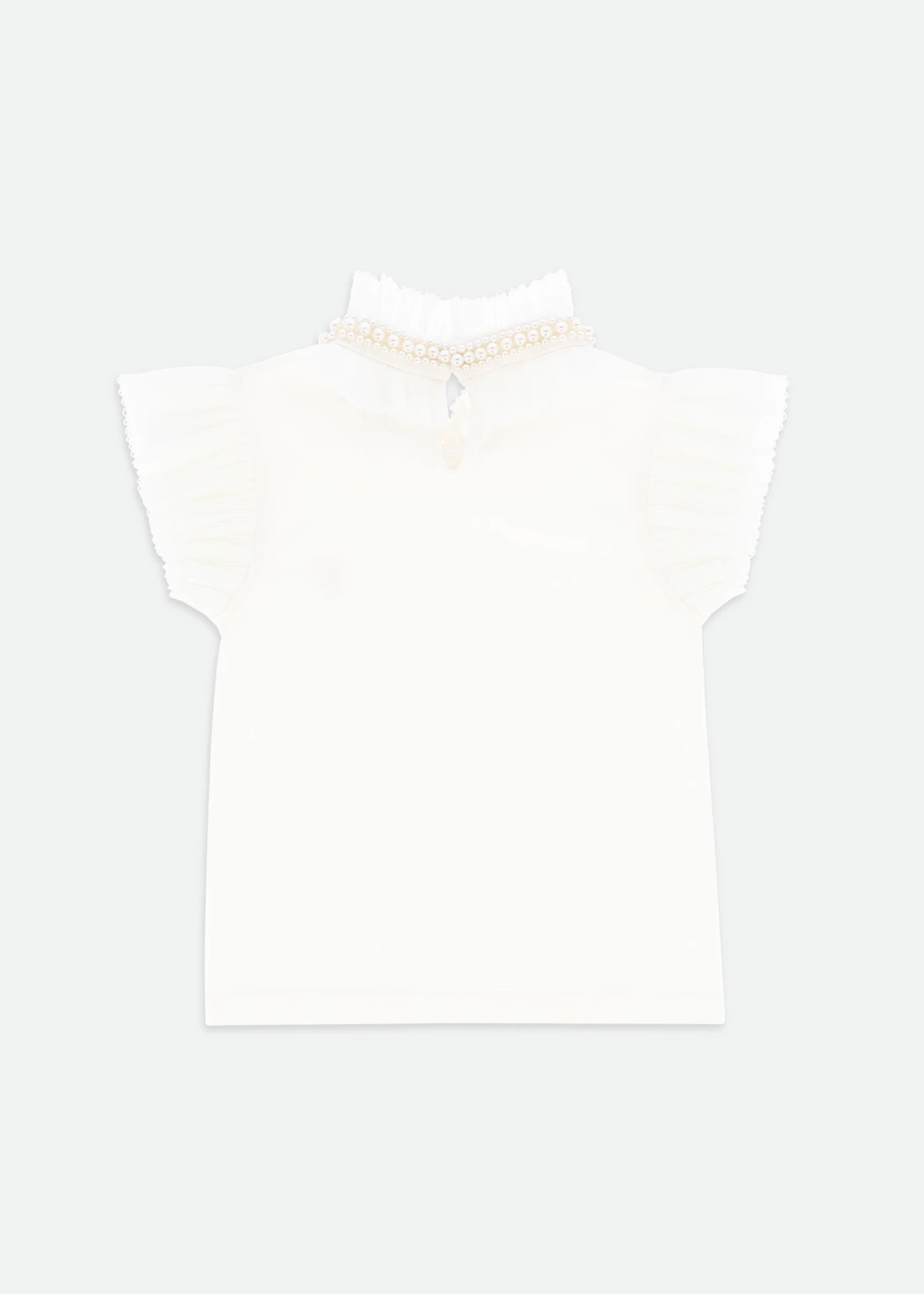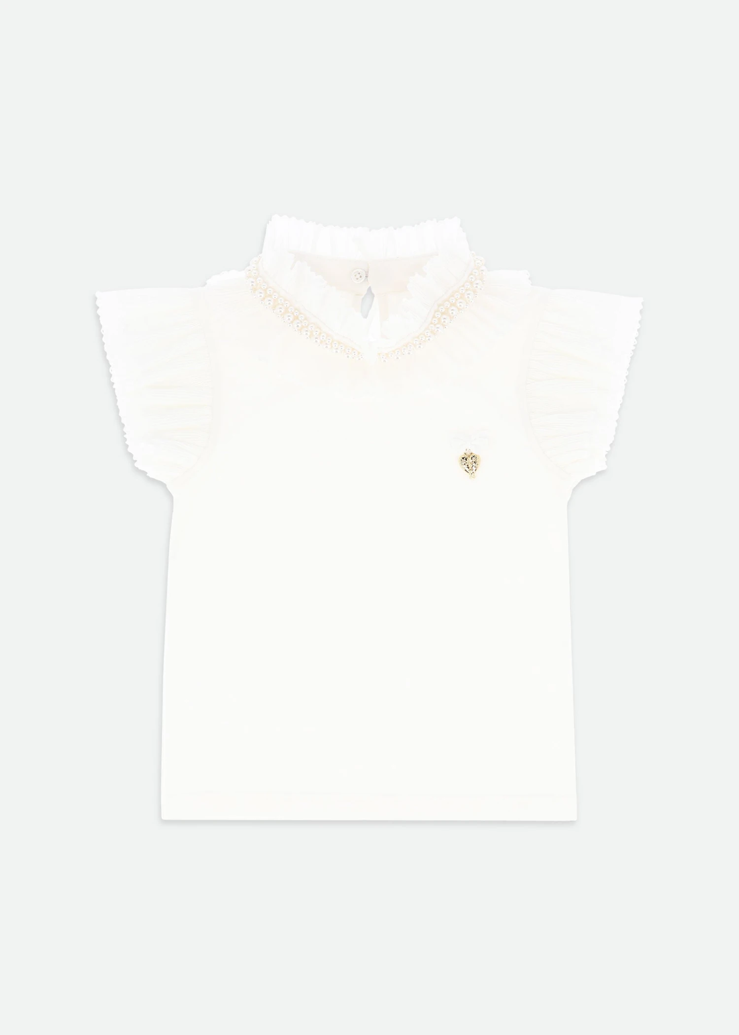 Dazzling pleated tulle and pearl top in snowdrop. This top features a pleated tulle collar with pearls and lovely tulle sleeves. Finished with an Angel’s Face small bow and gold heart charm on the chest. Fastens at the back with a gold logo button.