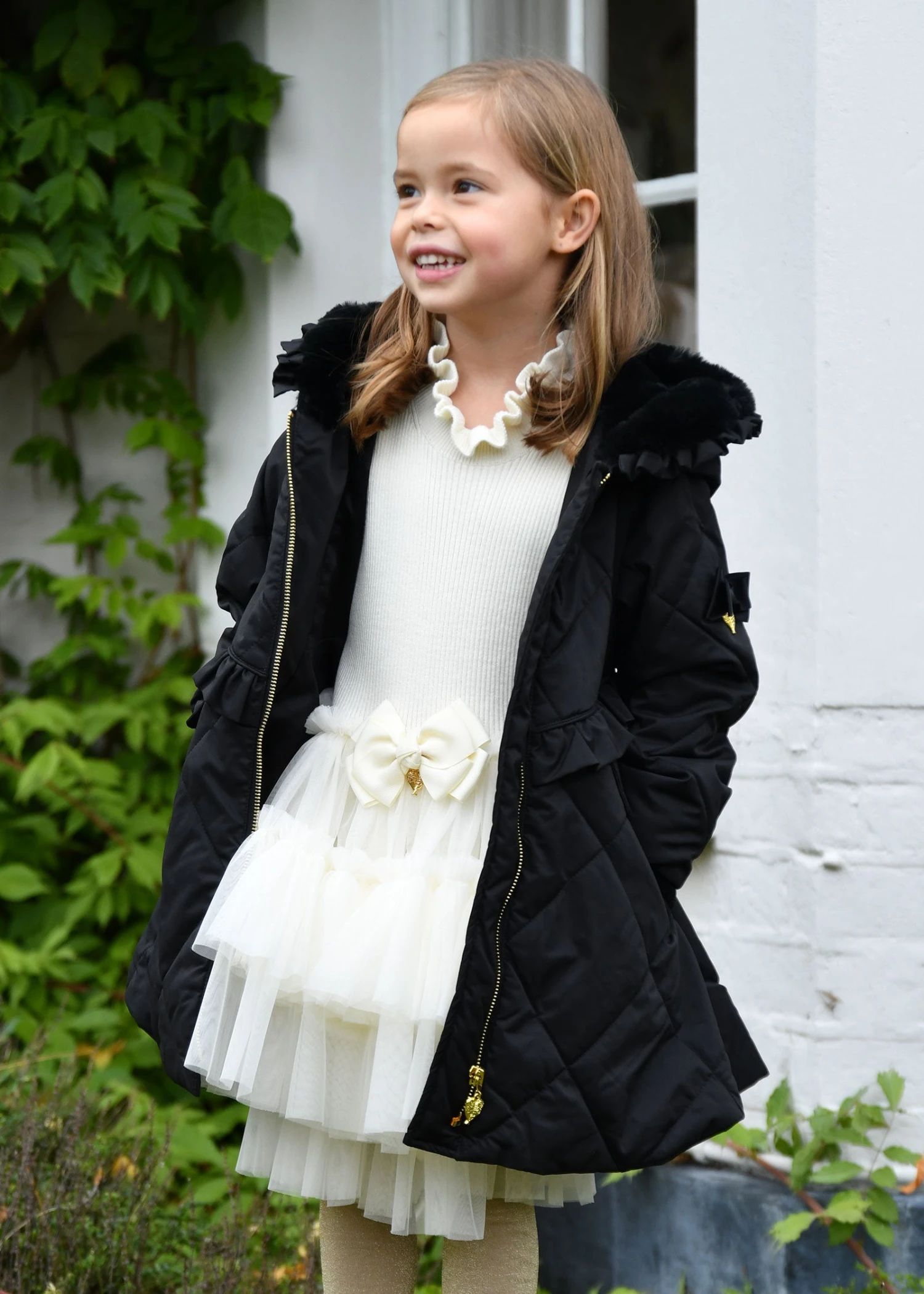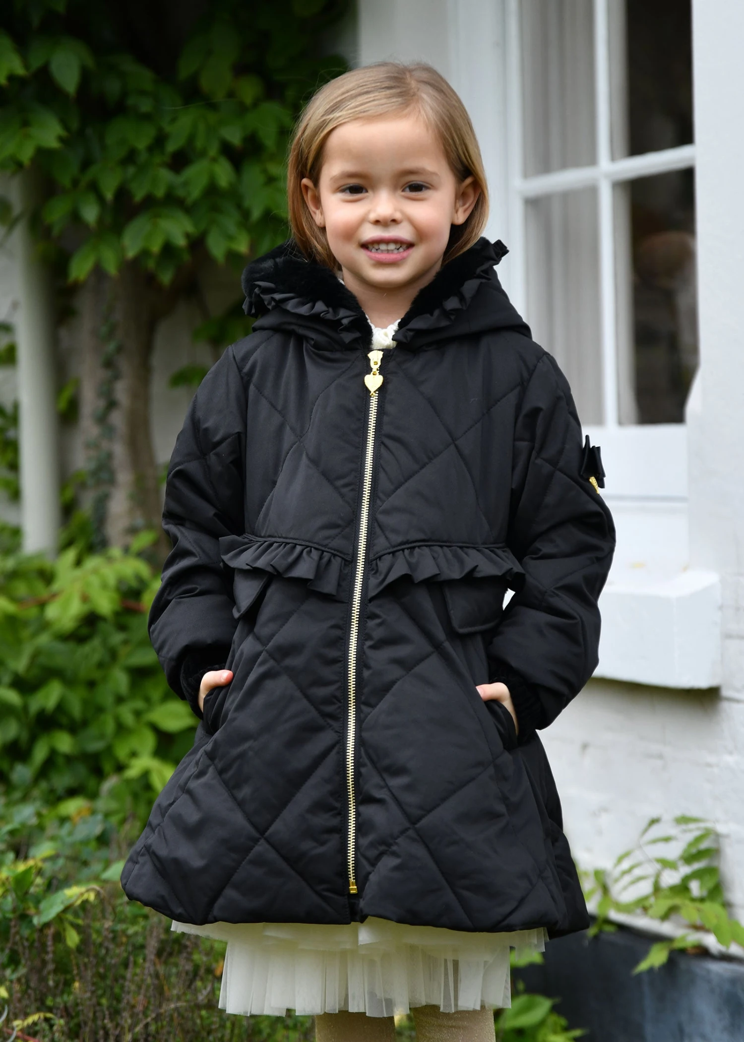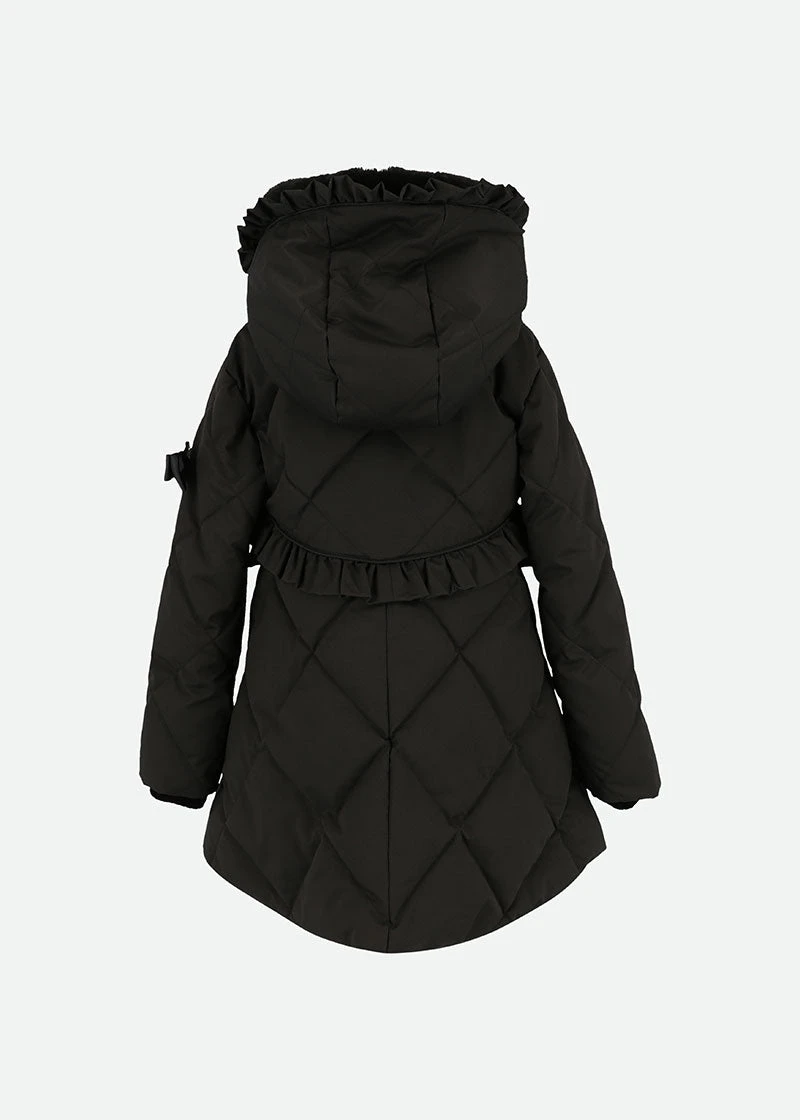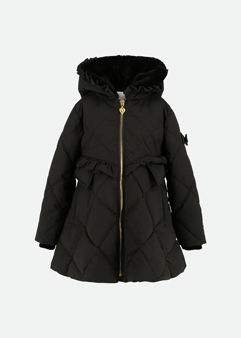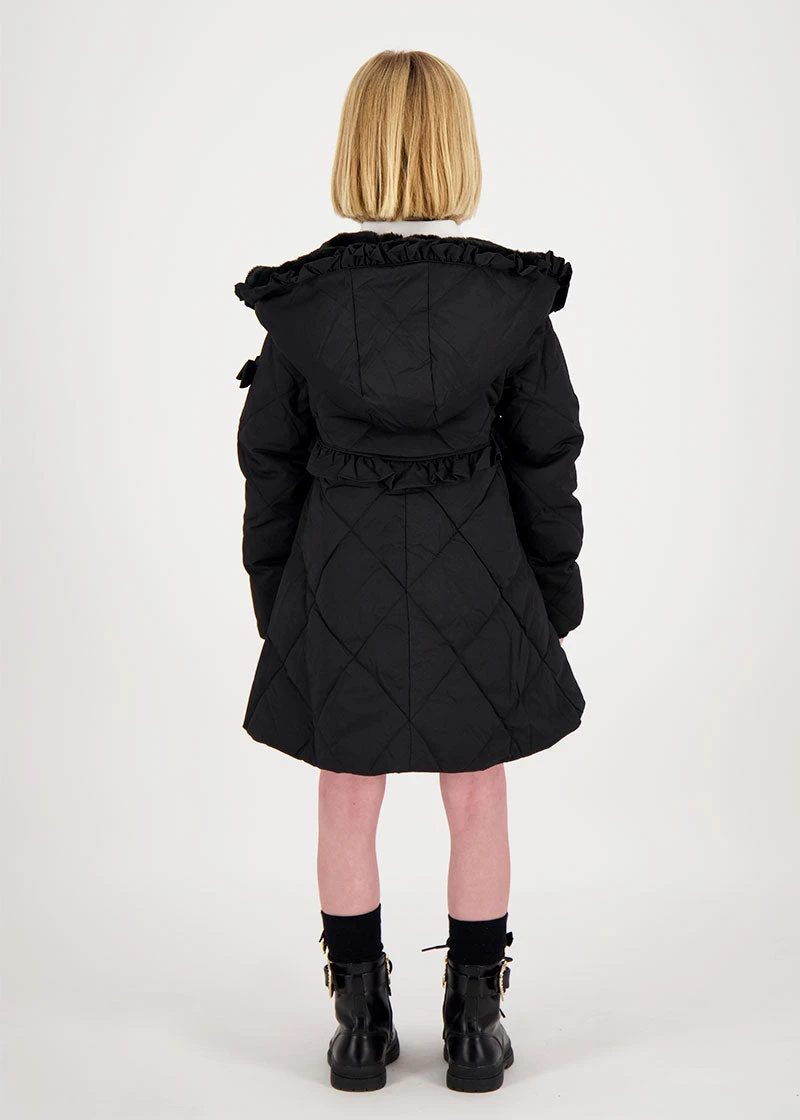 Gorgeous black winter coat for girls with ruffle detail around the hood and waist. Made from our luxurious outerwear shell in a diamond quilt design, the body is lined in soft satin and faux-fur in the hood. The coat features handy pockets, a beautiful peplum hem, and fastening down the front with our iconic gold zipper. The coat is complete with our signature bow and gold heart charm on the arm.