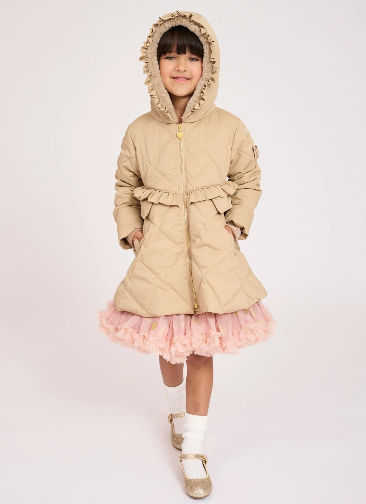 Gorgeous beige winter coat for girls with ruffle detail around the hood and waist. Made from our luxurious outerwear shell in a diamond quilt design, the body is lined in soft satin and faux-fur in the hood. The coat features handy pockets, a beautiful peplum hem, and fastening down the front with our iconic gold zipper. The coat is complete with our signature bow and gold heart charm on the arm.