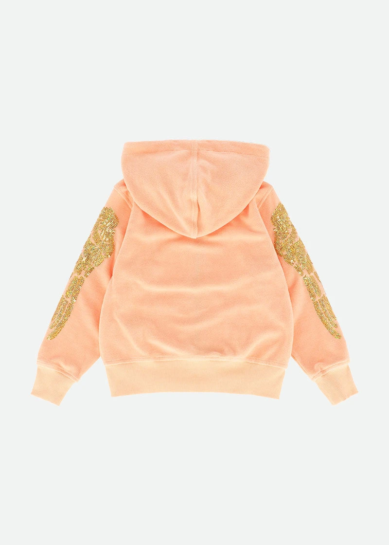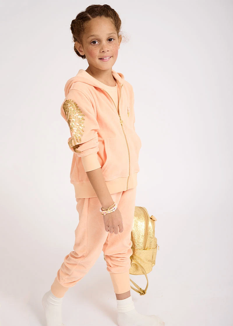 Lightweight Summer hoodie in Apricot Orange made from super soft velour. The hoodie features iconic Angel’s Face wings on the sleeves in sparkling sequins, fastening at the front with a shiny gold zipper. Finished in luxury our signature bow and gold heart charm on the chest.