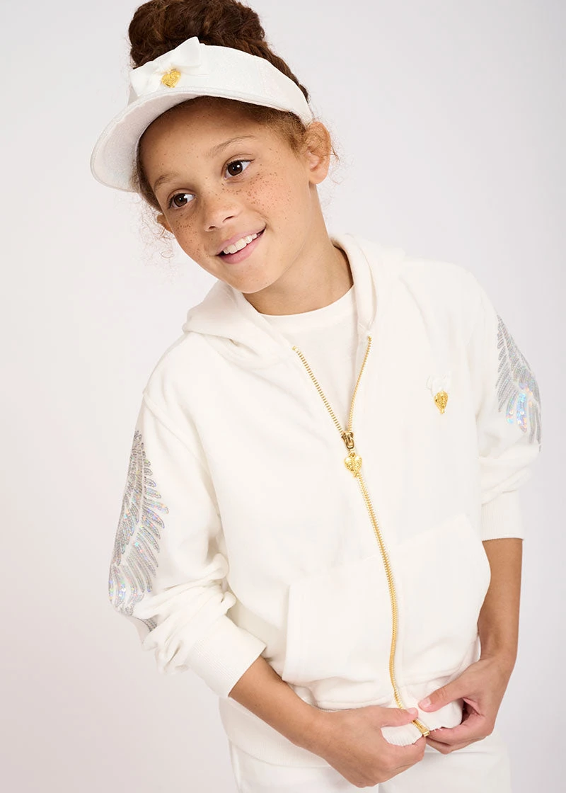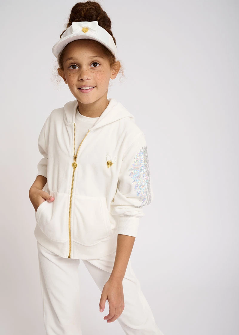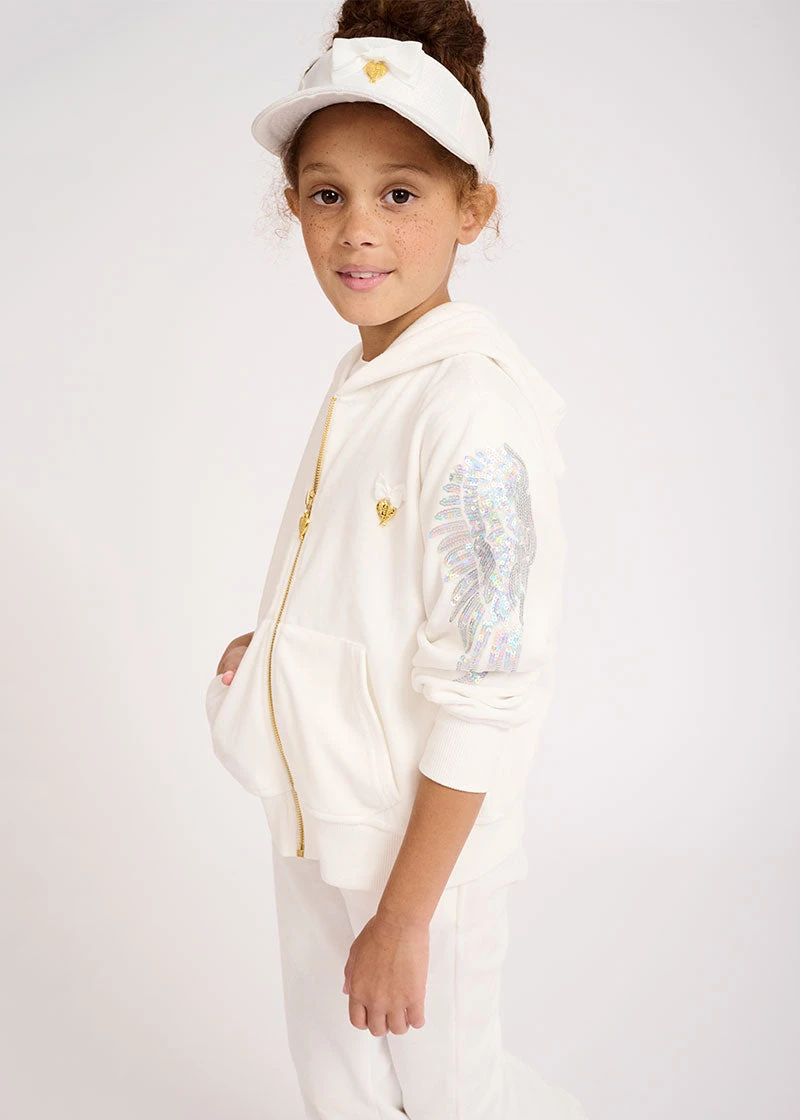 Lightweight Summer hoodie in white made from super soft velour. The hoodie features iconic Angel’s Face wings on the sleeves in sparkling sequins, fastening at the front with a shiny gold zipper. Finished in luxury our signature bow and gold heart charm on the chest.