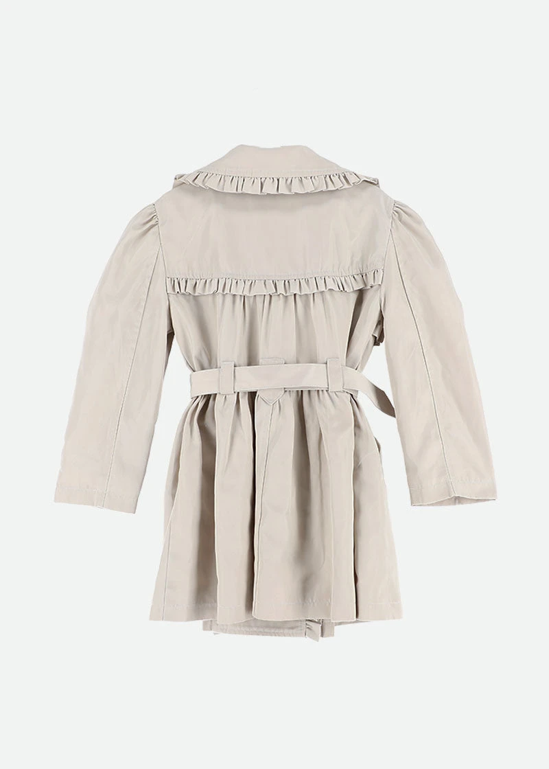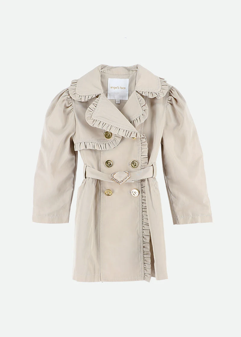 Fabulously frilly beige trench coat for girls. Fully lined in a smooth satin featuring handy pockets for little fingers. Trench fastens at the front with large gold buttons and a waist belt secure with a sparkling diamanté heart buckle.