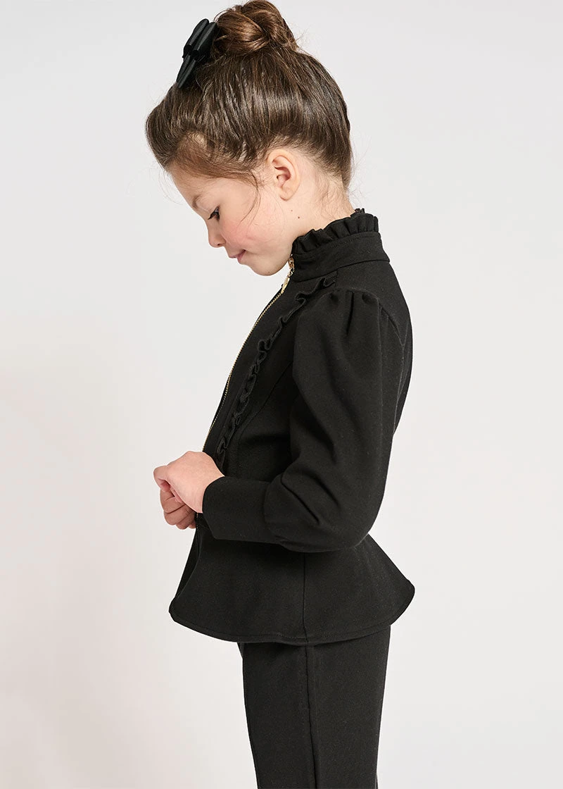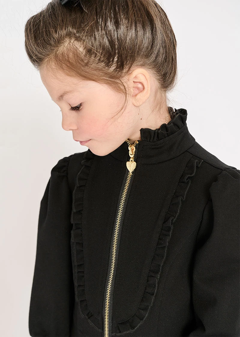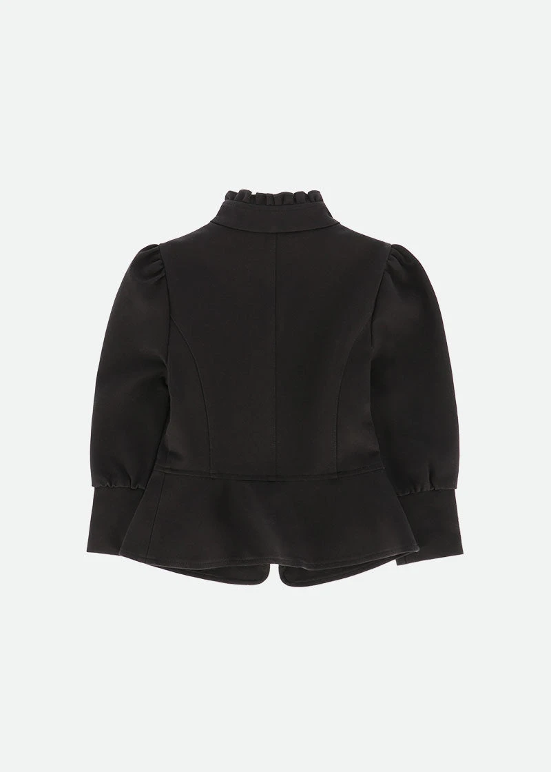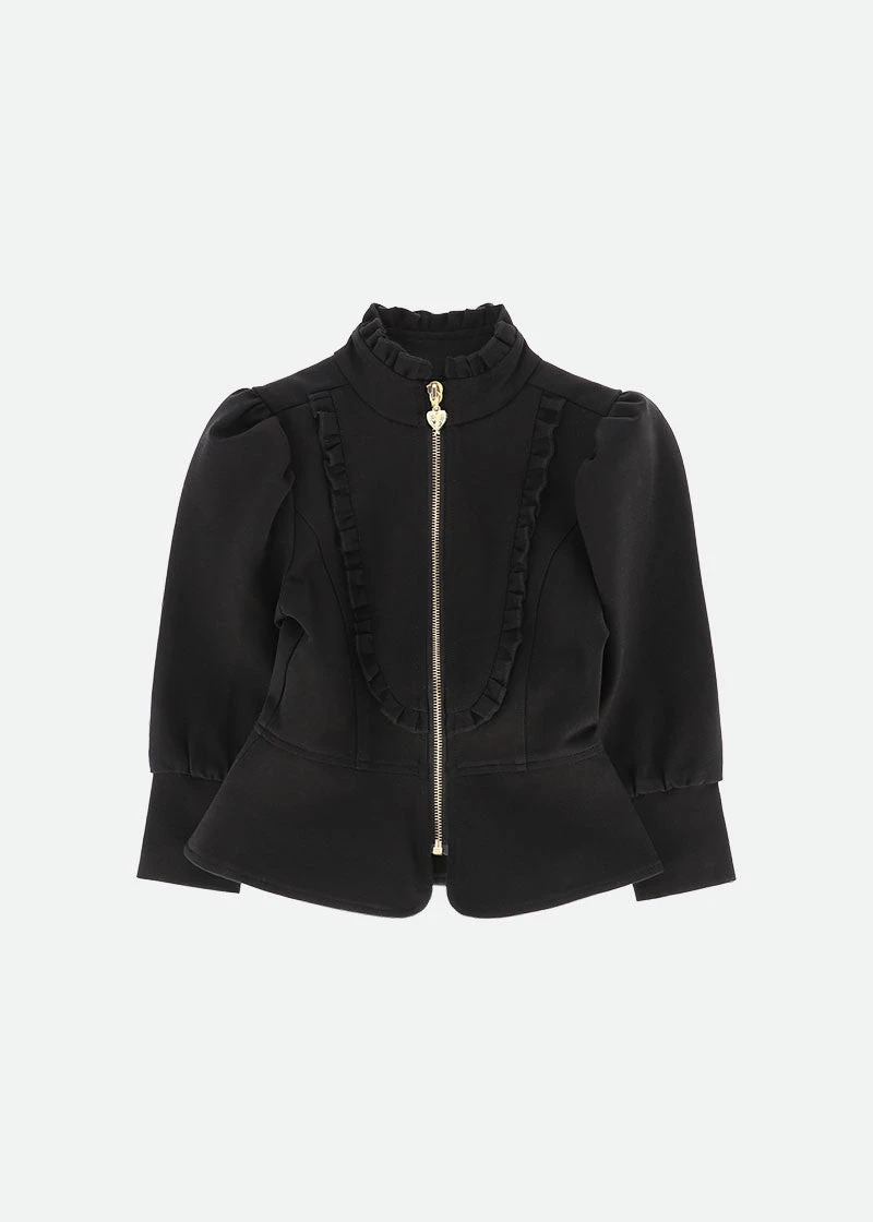 Phyllis is a beautifully cut, fitted jacket made in our gorgeous Ponte Roma fabric. The long-puffed sleeves and deep cuffs are enhanced by gathered shoulders. Bursting with detail pretty ruffles edge the collar and bodice bib, accompanied by an elegant peplum adorning the waistline. This unique jacket is completed with our iconic gold heart zipper down the centre front.