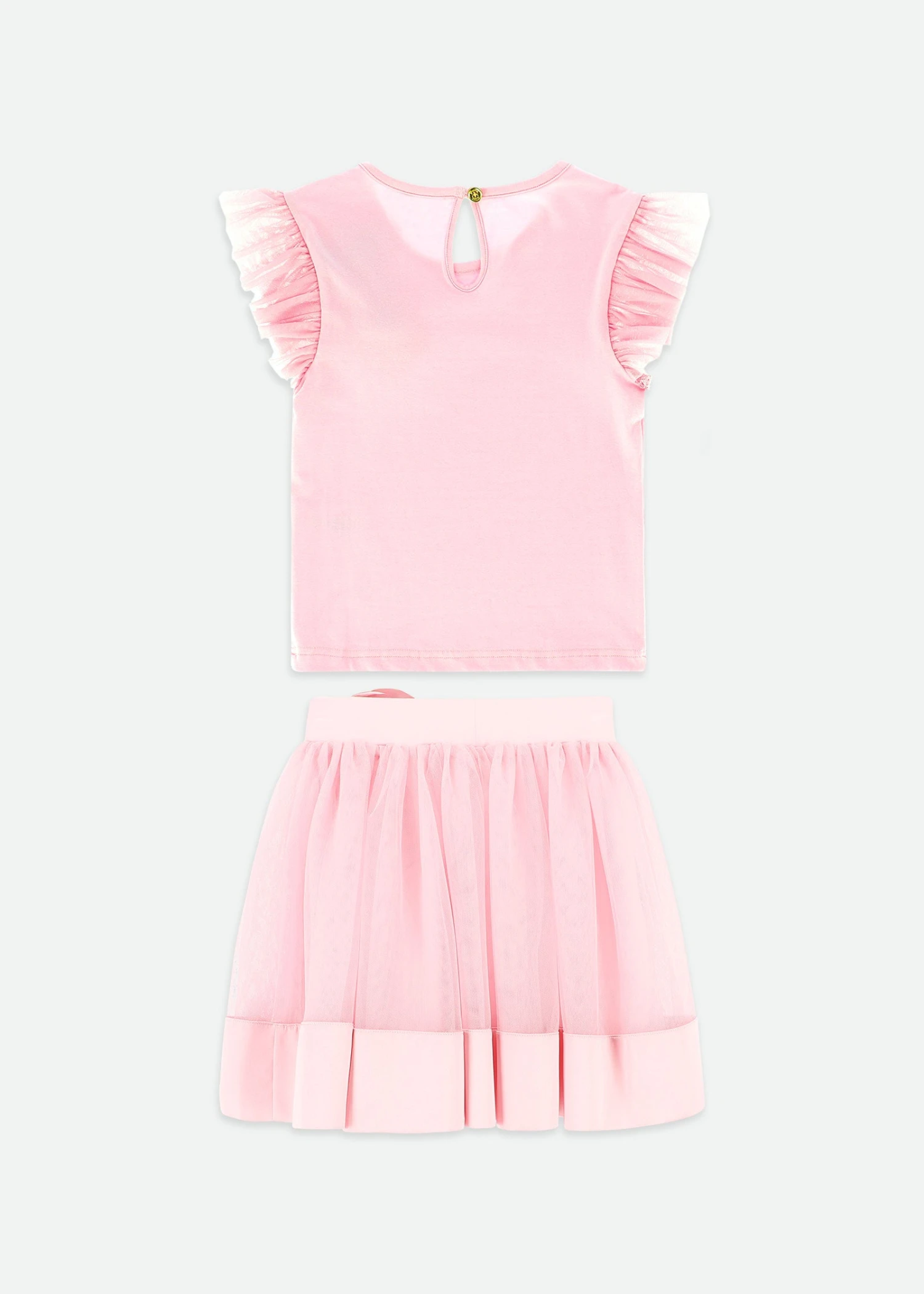 Cute pink tulle set with beautiful satin roses and elegant satin hem. The top features cute ruffled tulle sleeves and two satin roses on the front . This skirt is fully lined in a soft cotton and is detailed with a satin rose on the elasticated waistband.