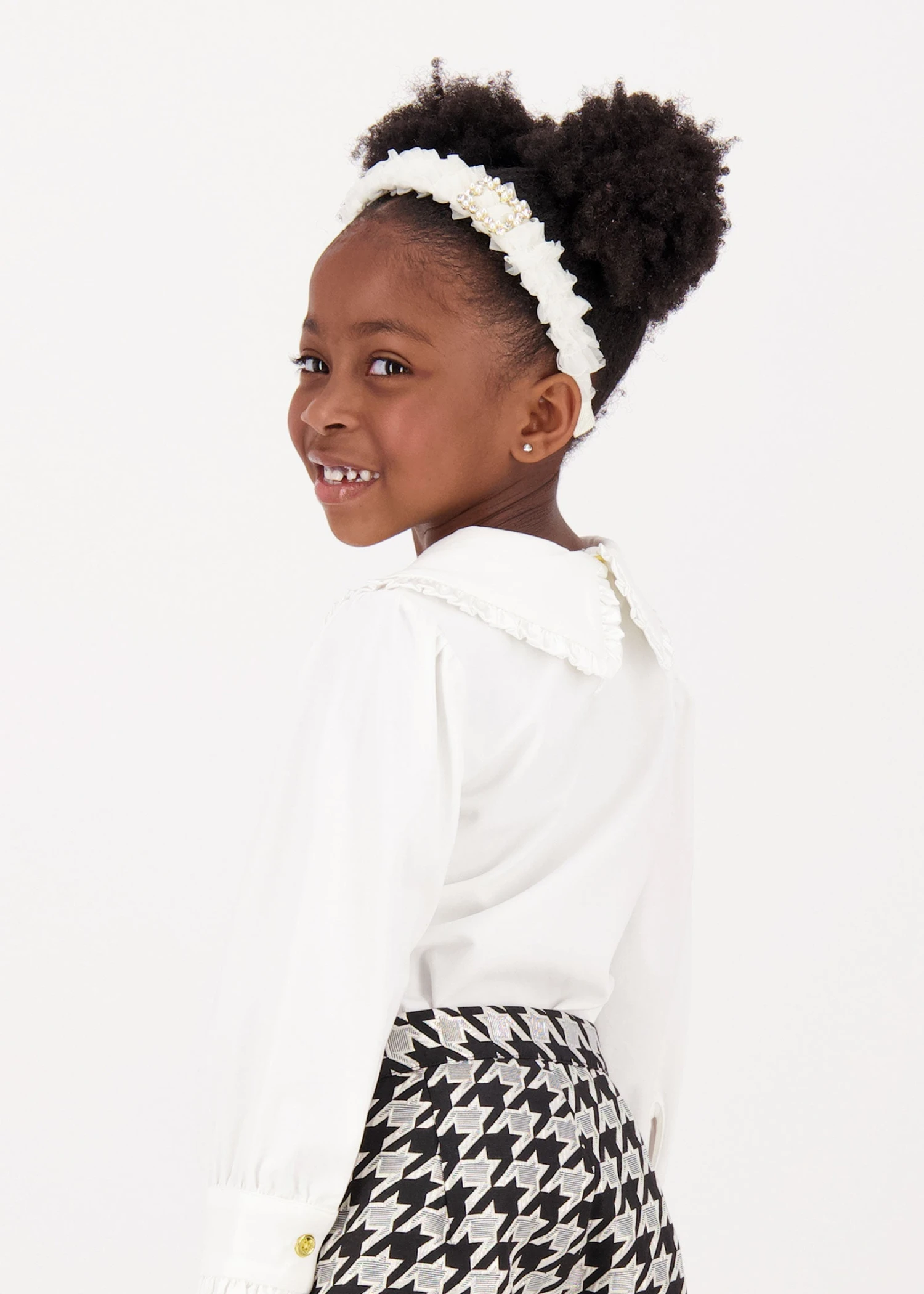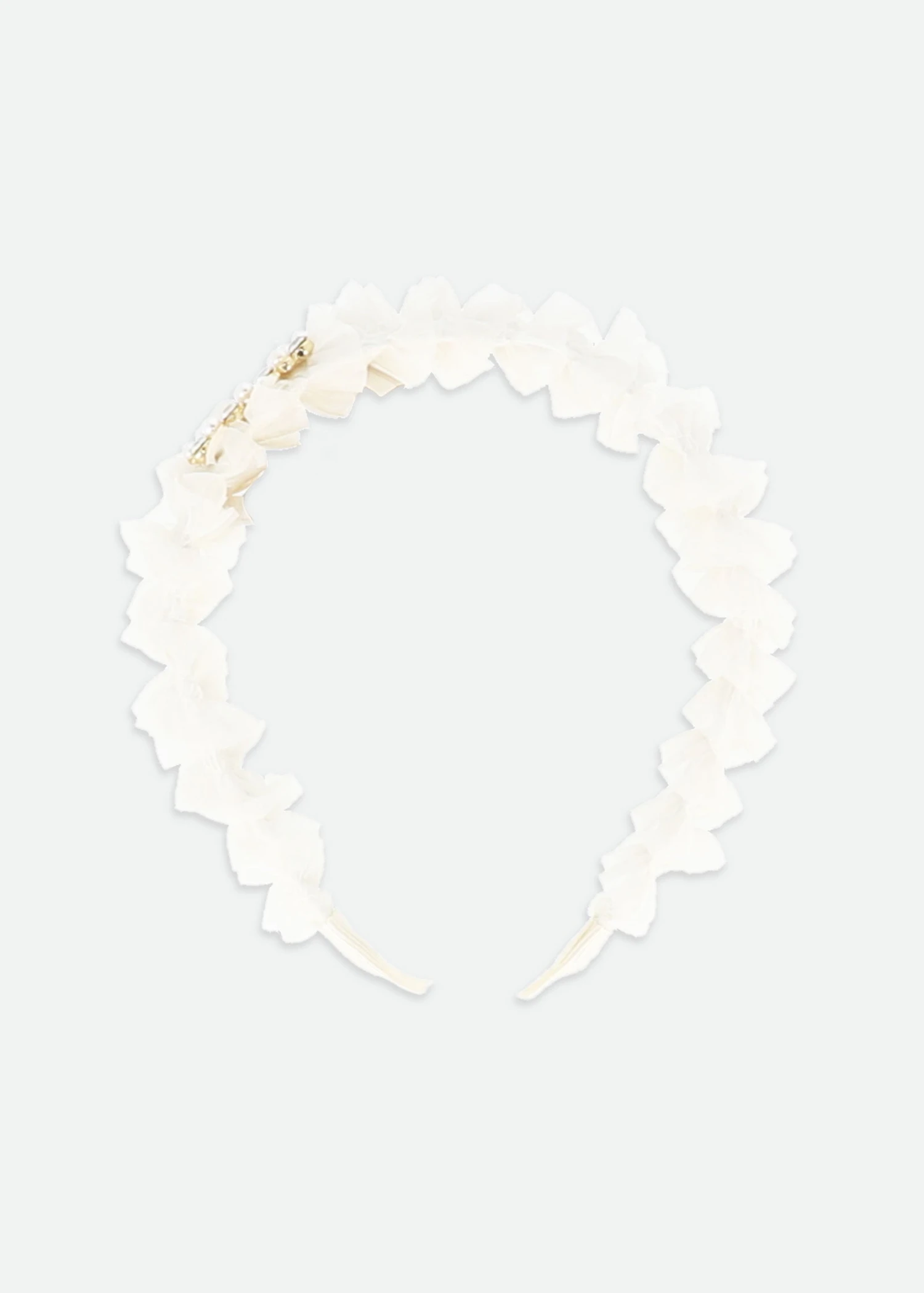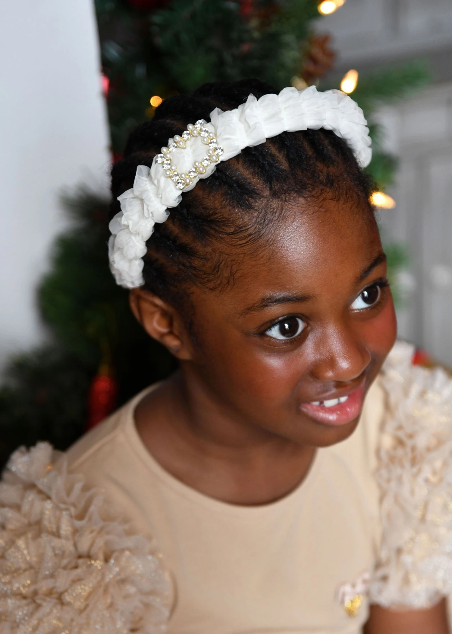 Eye-catching vanilla hairband with diamanté buckle for girls. The flexible, headband is simply and beautifully decorated with ruffled layers of tulle for a dramatic look. The perfect accessory to complete any Angel’s Face look.