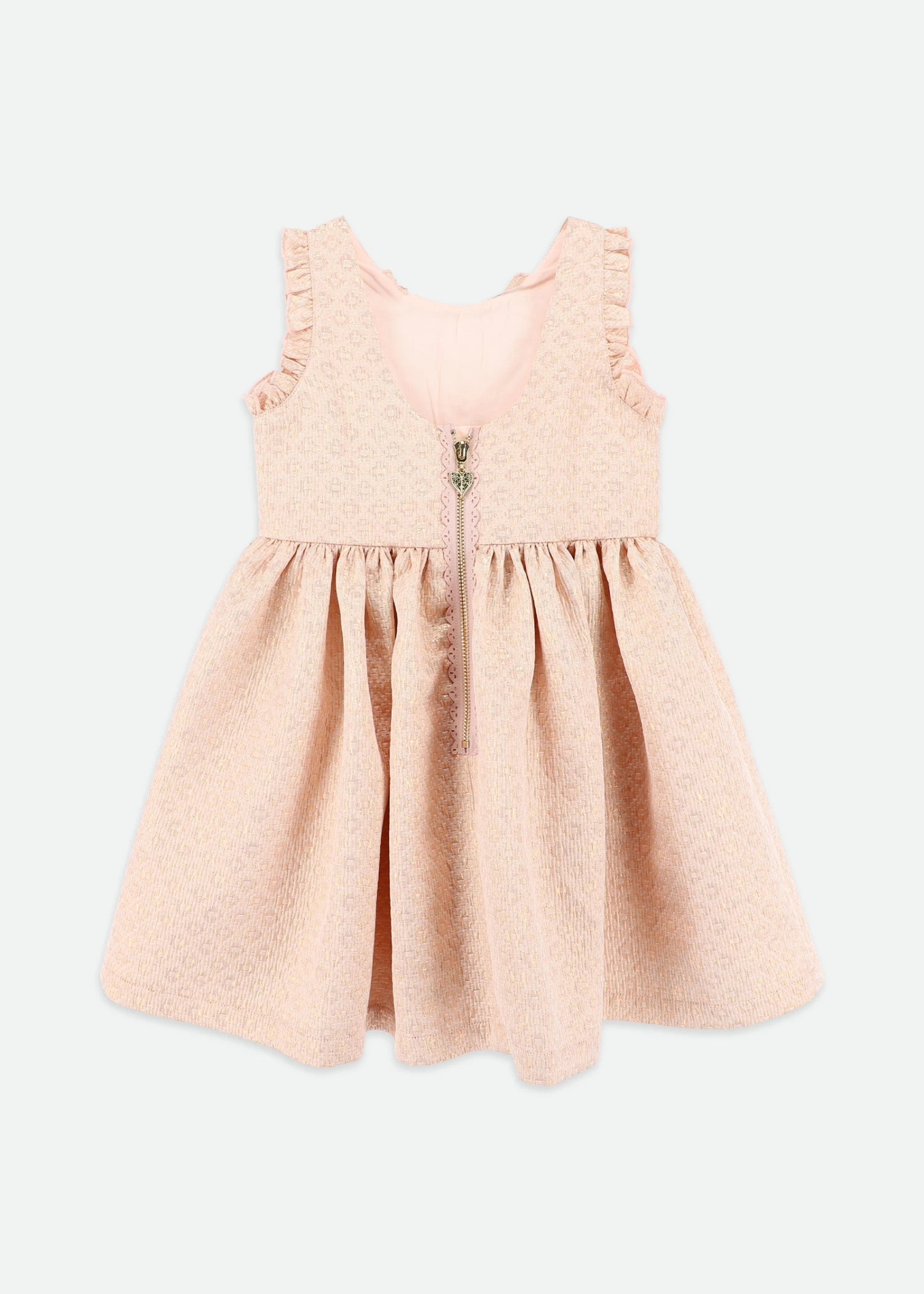 Elegant woven jacquard dress with metallic thread in rose gold. This eye-catching dress has three crystal buttons going down the front and fastens at the back with a gold metallic zip. The dress is complete with ruffle detailing around the arm holes.