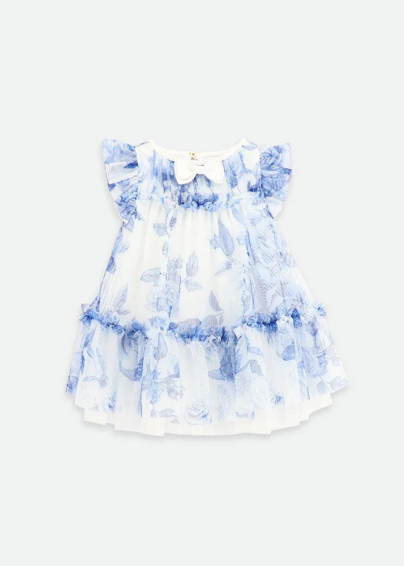 Voluminous tulle party dress for baby girls. This luxurious tulle dress is detailed with an exquisite flower design, fully lined in soft stretch cotton blend. The dress is complete with our signature bow and gold heart charm on the neckline, fastening at the back with a gold button.