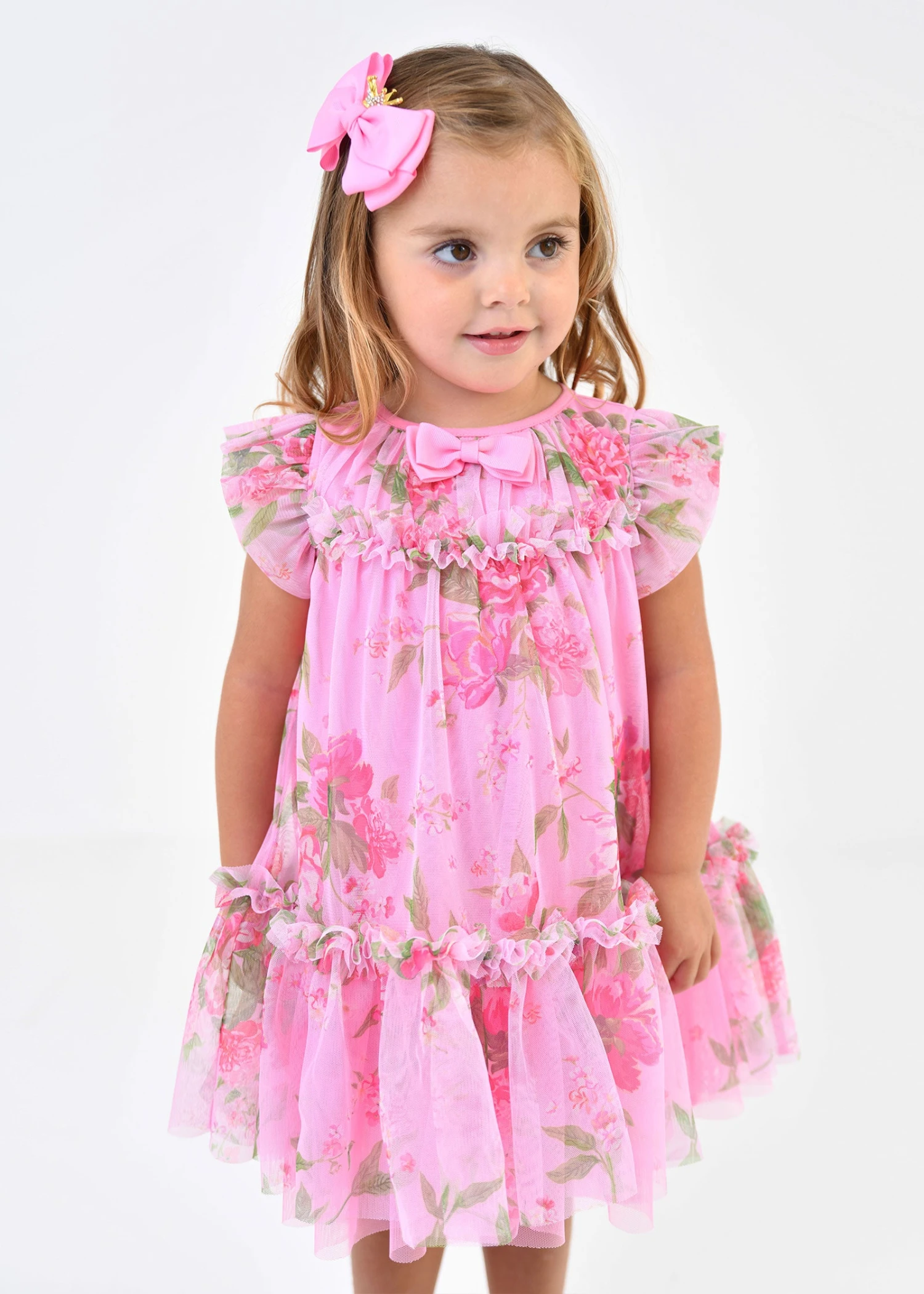 Voluminous tulle party dress for baby girls. This luxurious tulle dress is detailed with an exquisite flower design, fully lined in soft stretch cotton blend. The dress is complete with our signature bow and gold heart charm on the neckline, fastening at the back with a gold button.