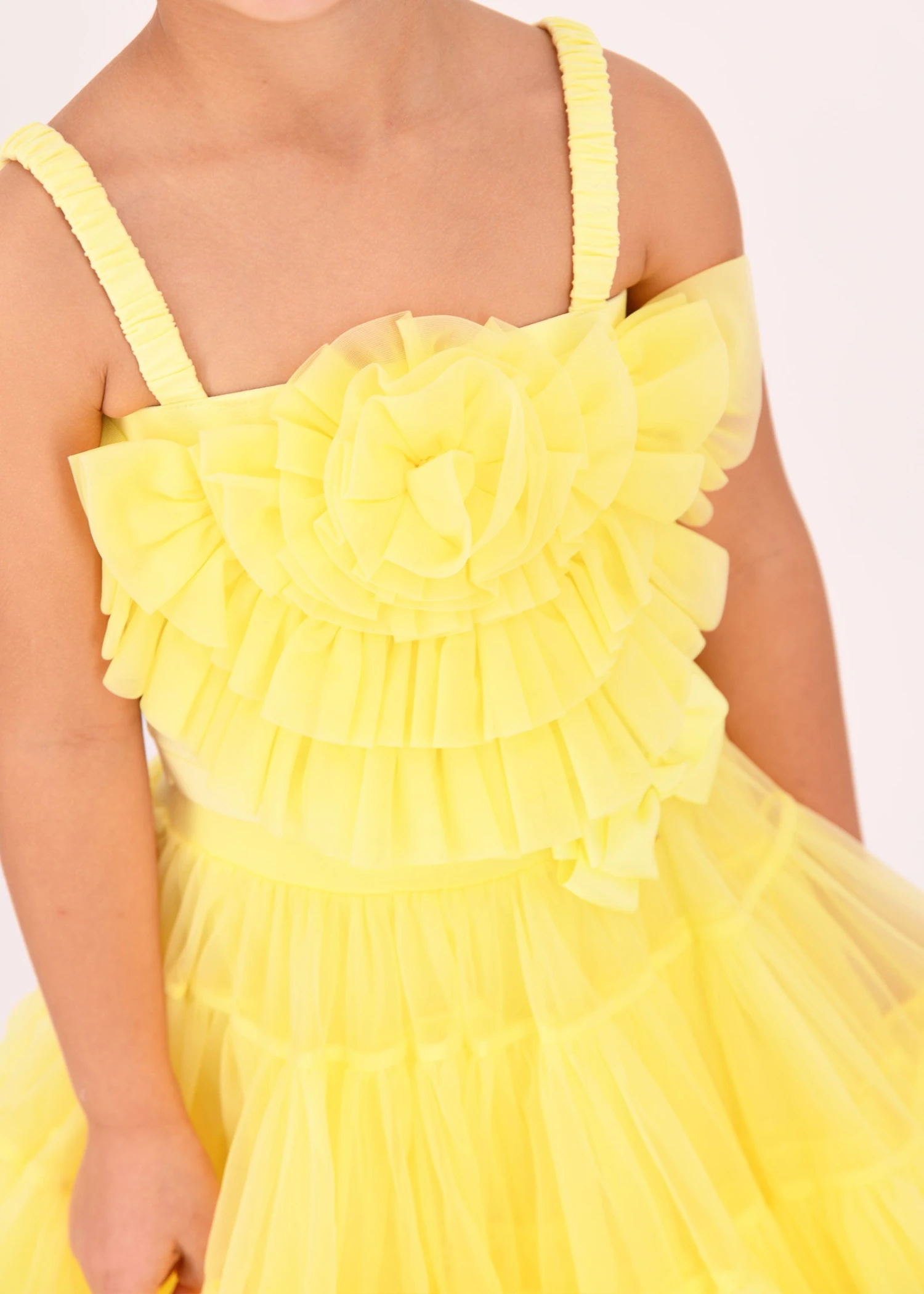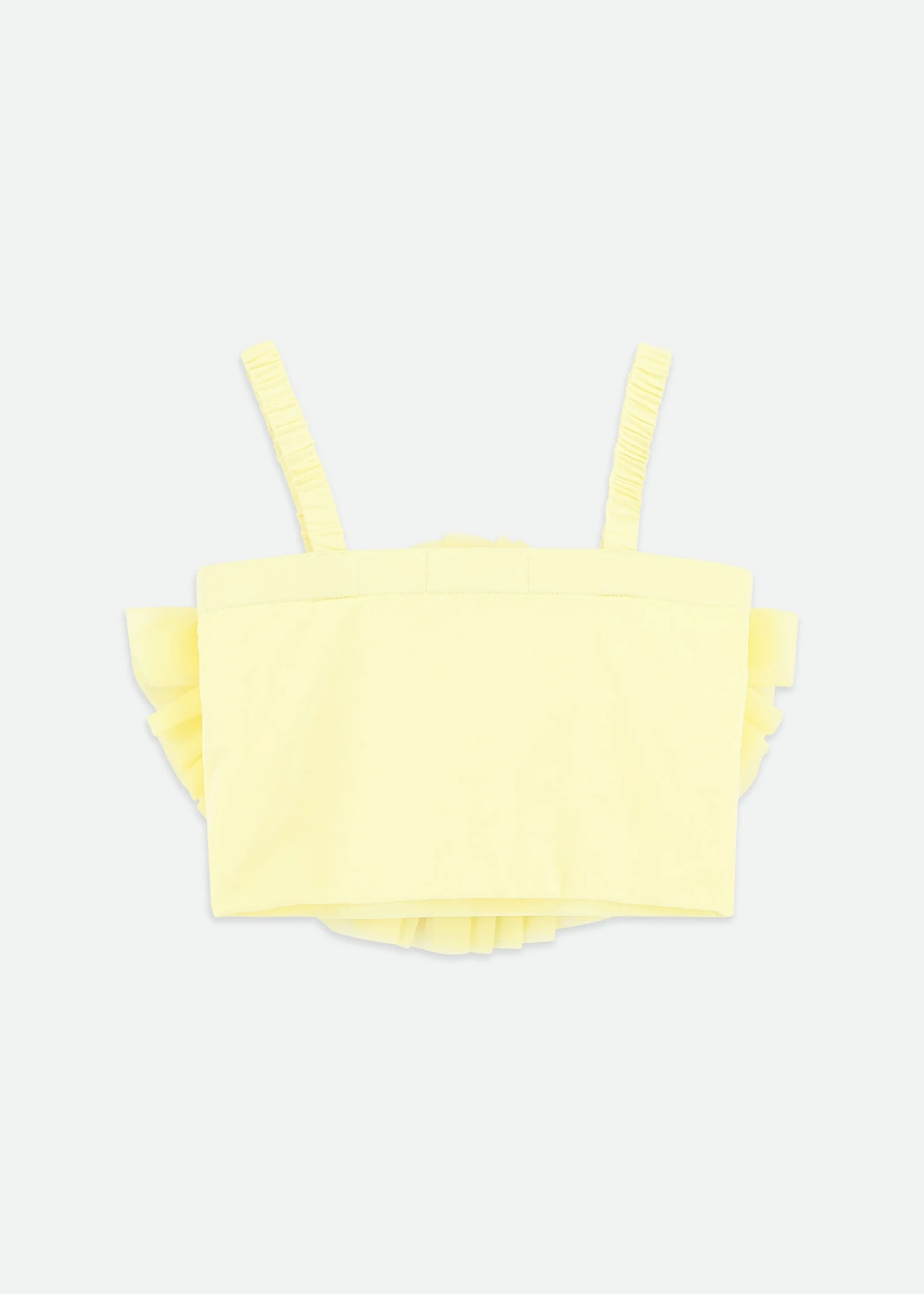 Cropped ruffle top in sherbet made from multiple layers of tulle lace. It has a pretty rosette design on the front and is colour-matched with our iconic pixie tutus in the same shade.