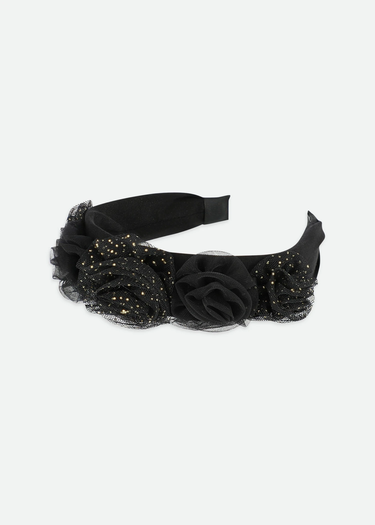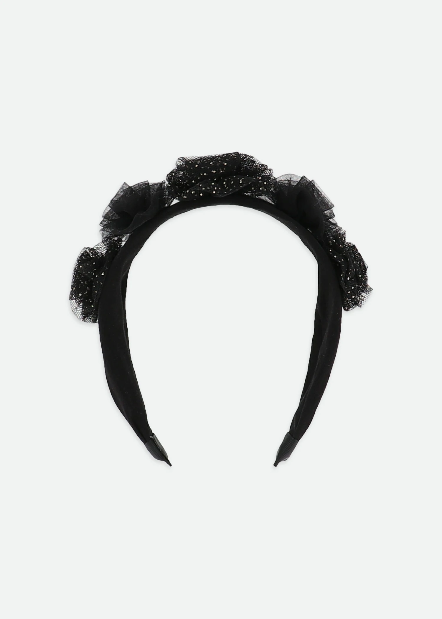 Add a luxury finish to any outfit with our tulle black sparkle headband with a soft jersey base. Featuring three matching roses to frame the face of your stylish angel.