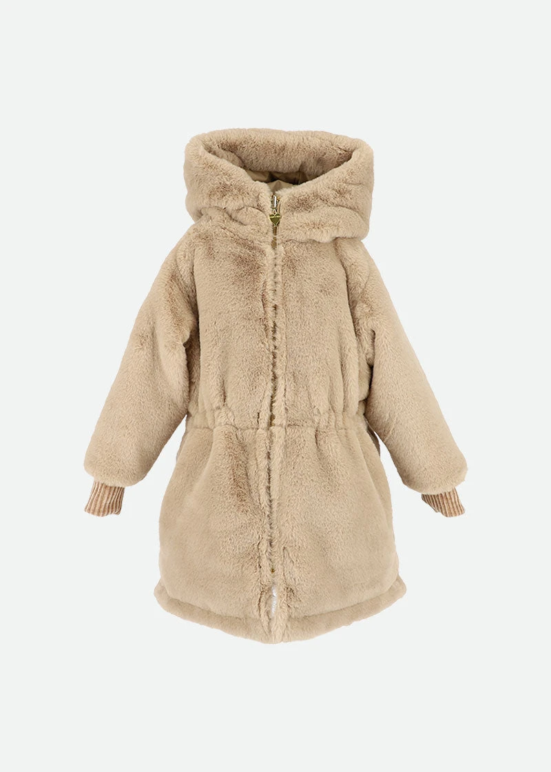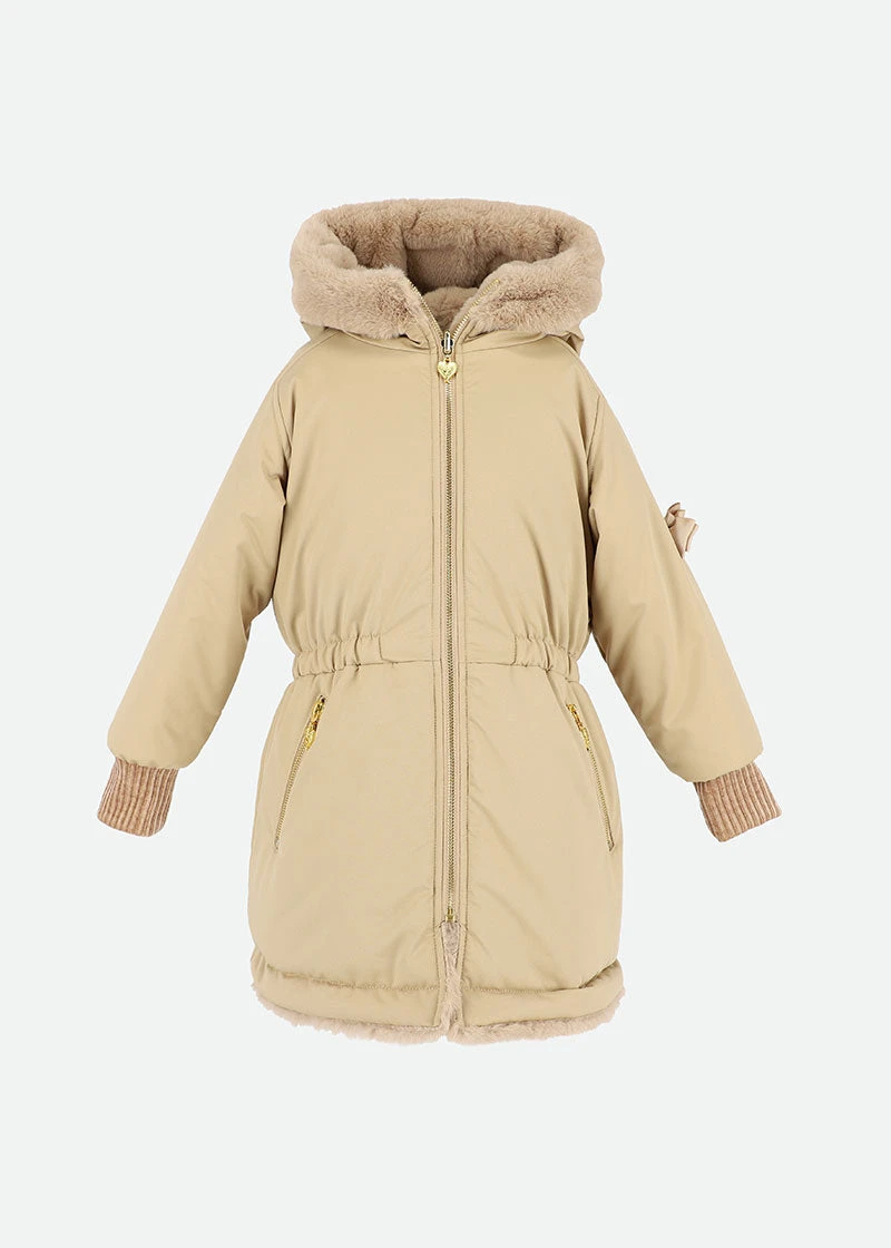 Keep cosy in our reversible faux fur winter coat for girls. The coat has a luxurious sand brown outer shell with a reversible faux fur side to match. The coat features an elasticated waist, handy pockets and deep warm cuffs. Our signature bow and gold heart charm features on the sleeve.