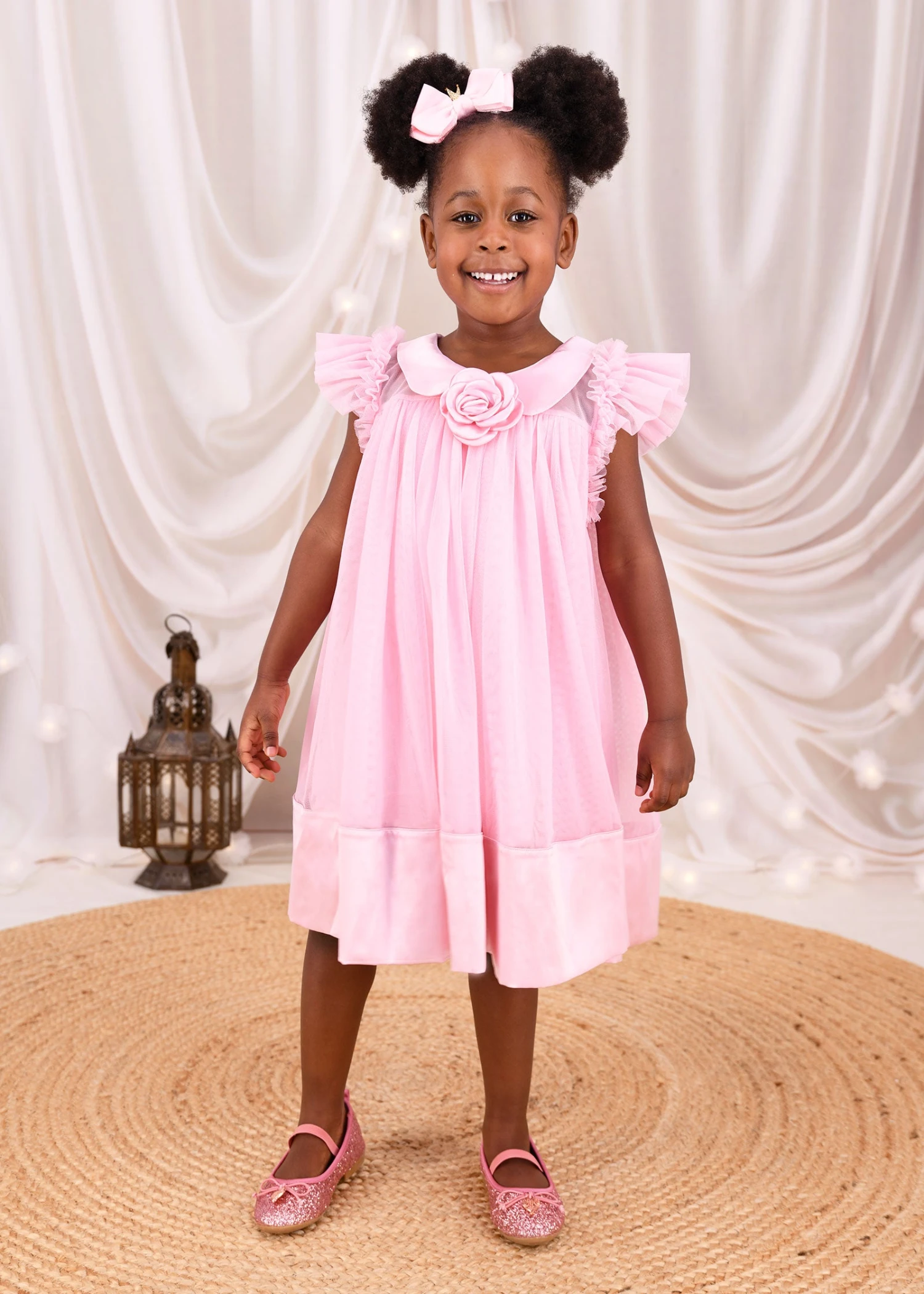 Pink tulle peplum dress with a beautiful satin collar and rose. This dress features an elegant satin hem and is fully lined with a soft cotton blend. Fastening at the back with a gold logo button.
