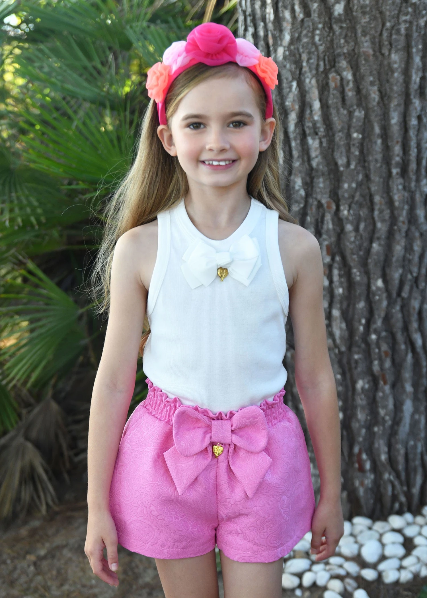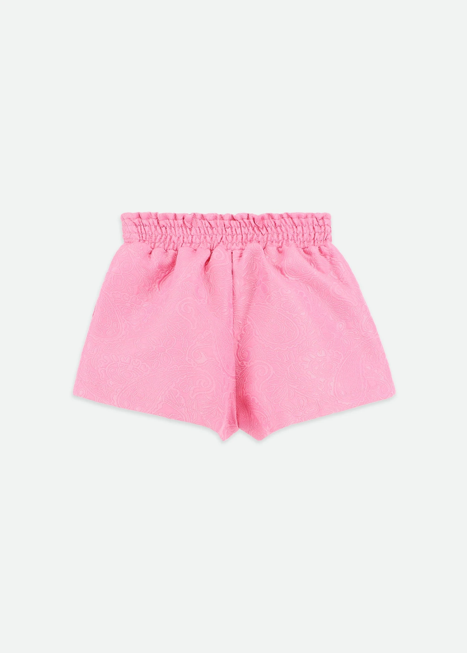 Dazzling Jacquard shorts in pink with a ruched paper bag waist. Full-lined in soft fabric for extra comfort. Complete with a Self-fabric bow and gold heart charm on the waist.