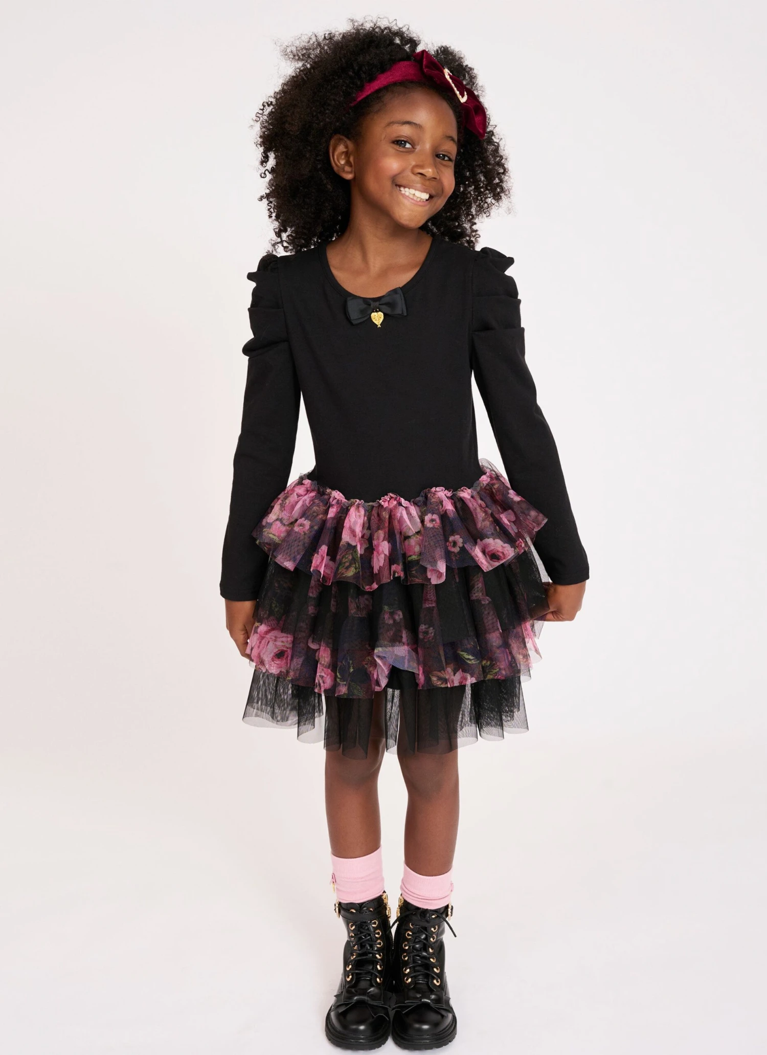 Party in this fabulous black long sleeve dress featuring this seasons exquisite flower tulle. Made from a comfortable cotton blend with voluminous layers on black and pink flower tulle. Detailed with gathered puffed sleeves and out signature bow and gold heart charm centre of the neckline.