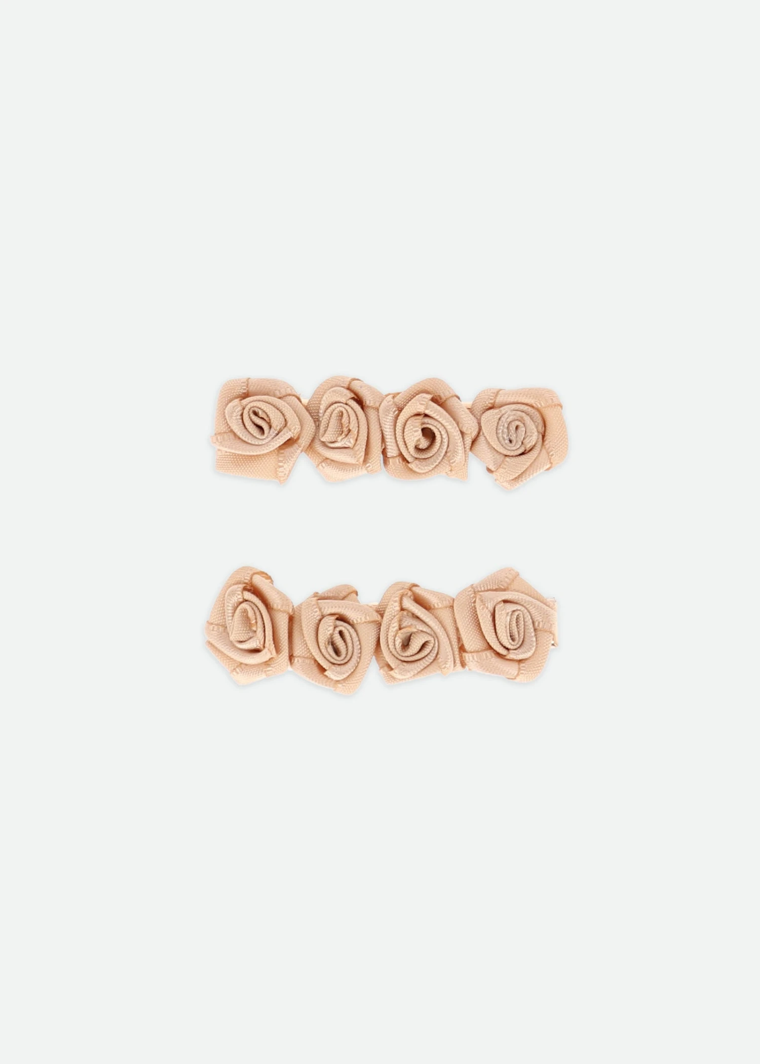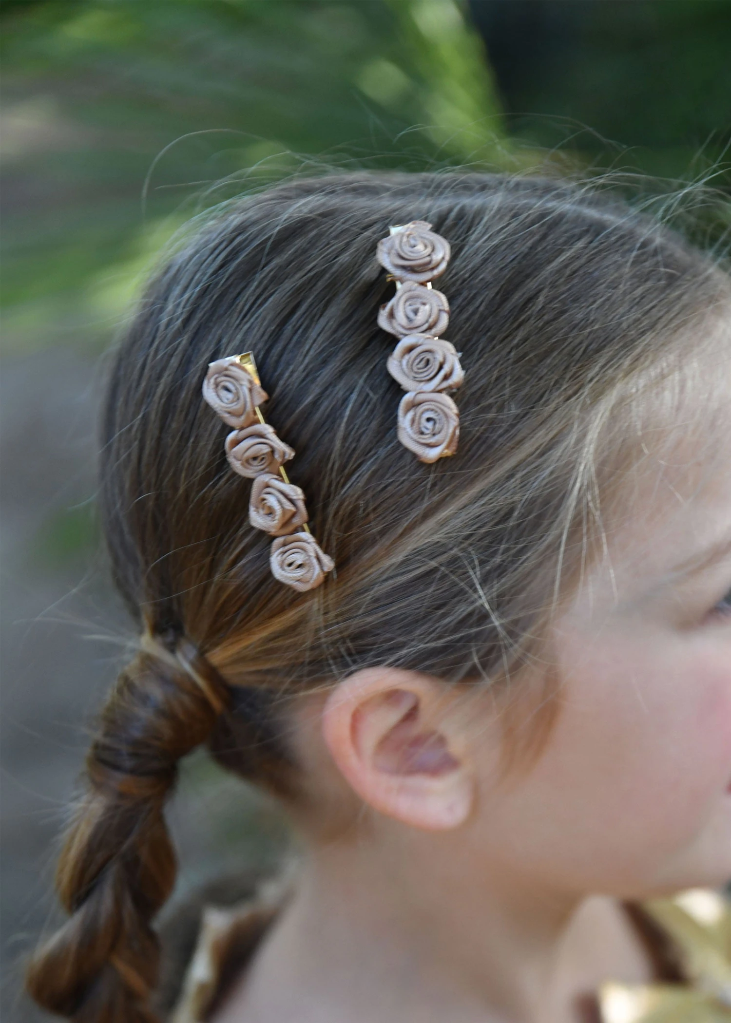 Chic satin hairclips with dainty roses detail in Champagne. The perfect finishing touch to complete your outfit.