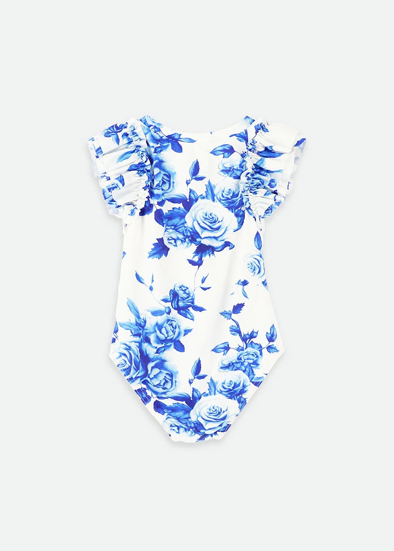 Pretty white with blue rose design swim costume for girls. Detailed with cute ruffles around the sleeves, fastening at the front with a branded zip. Swimwear fully lined and made from SPF 50 fabric for optimum sun protection.