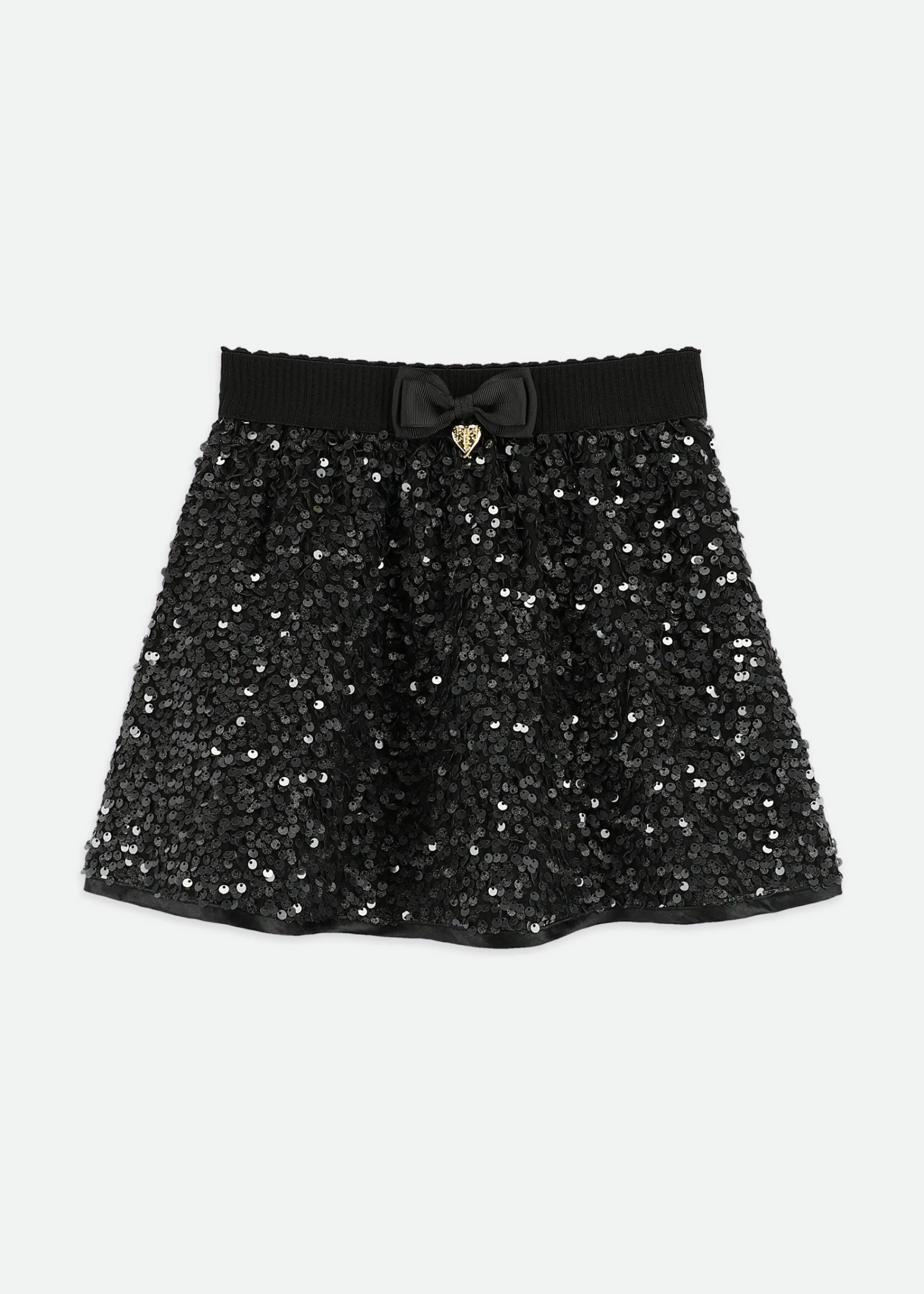 Stunning Black sequin pull-on skirt for girls. An elasticated skirt that is bound in a soft jersey for comfort. The waistband has a grosgrain bow and signature gold heart charm. The skirt is fully lined and sits above the knee.