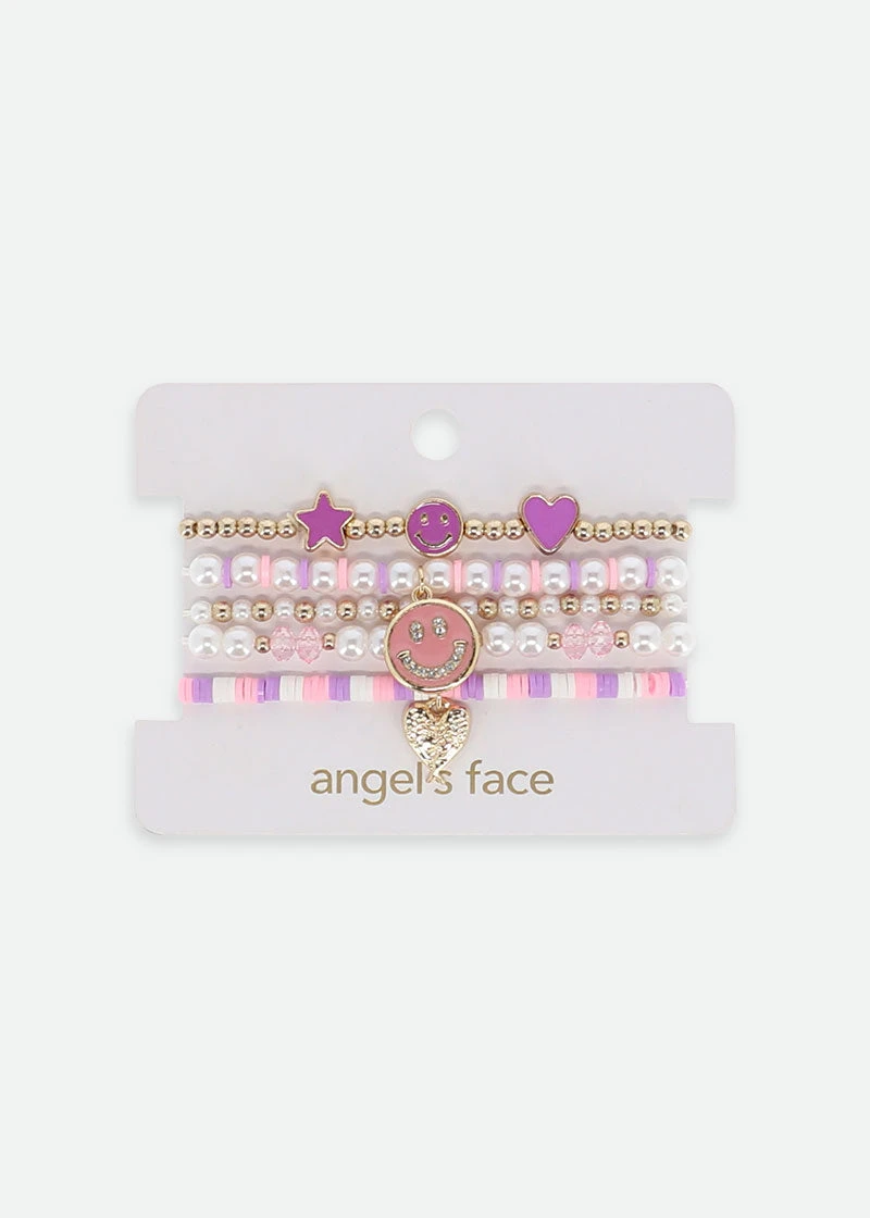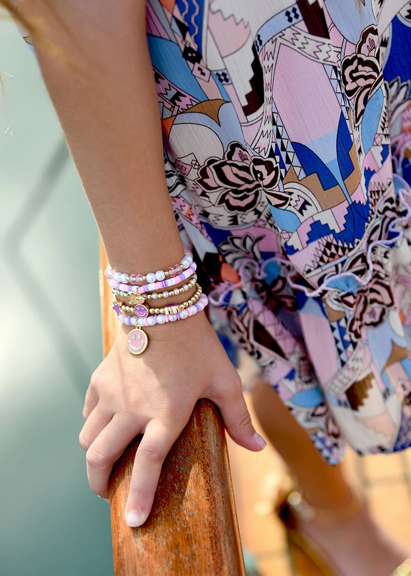 Lilac bracelet summer set for girls with smile detail. Wear together or individually to suit your style, all bracelets are elasticated for easy wearing.
