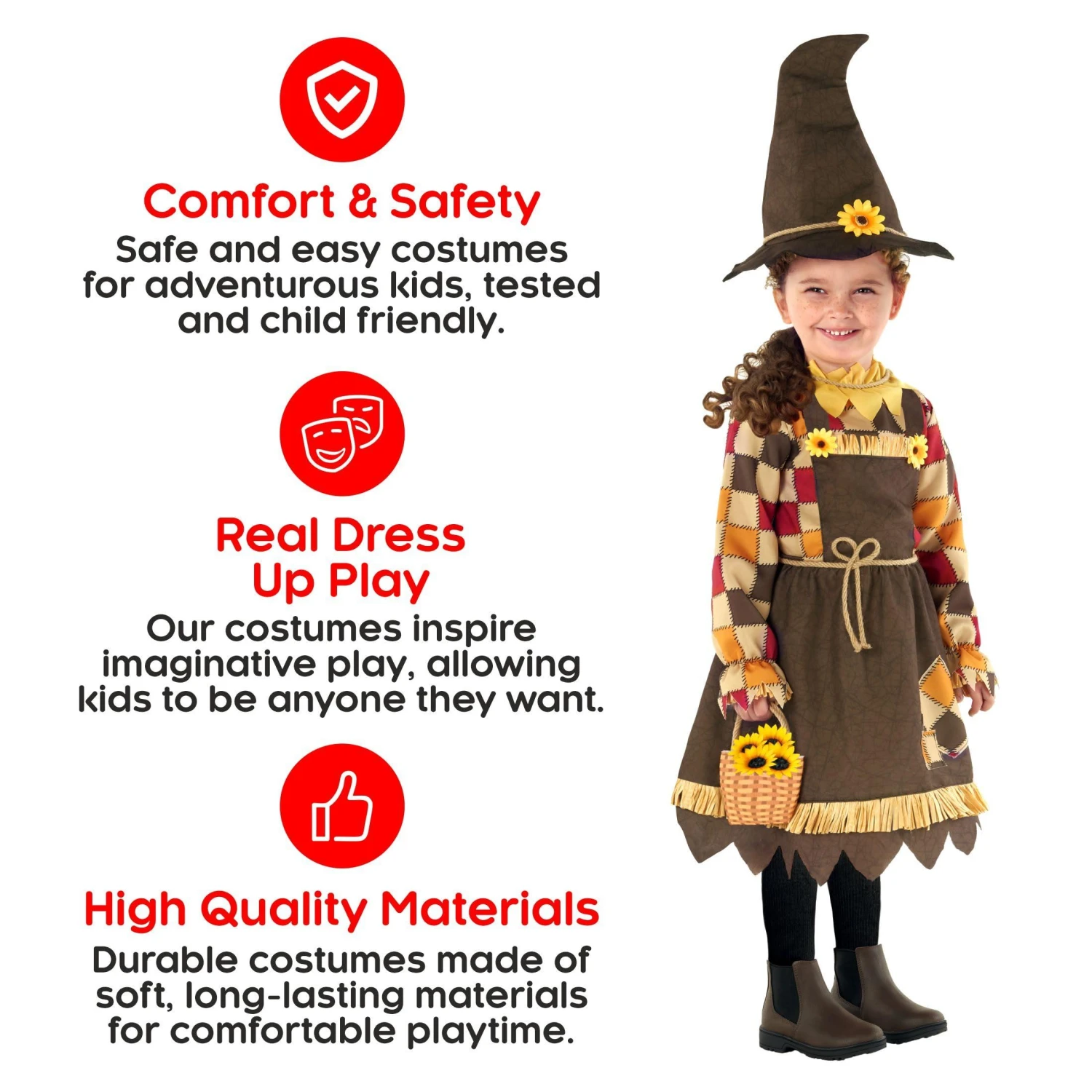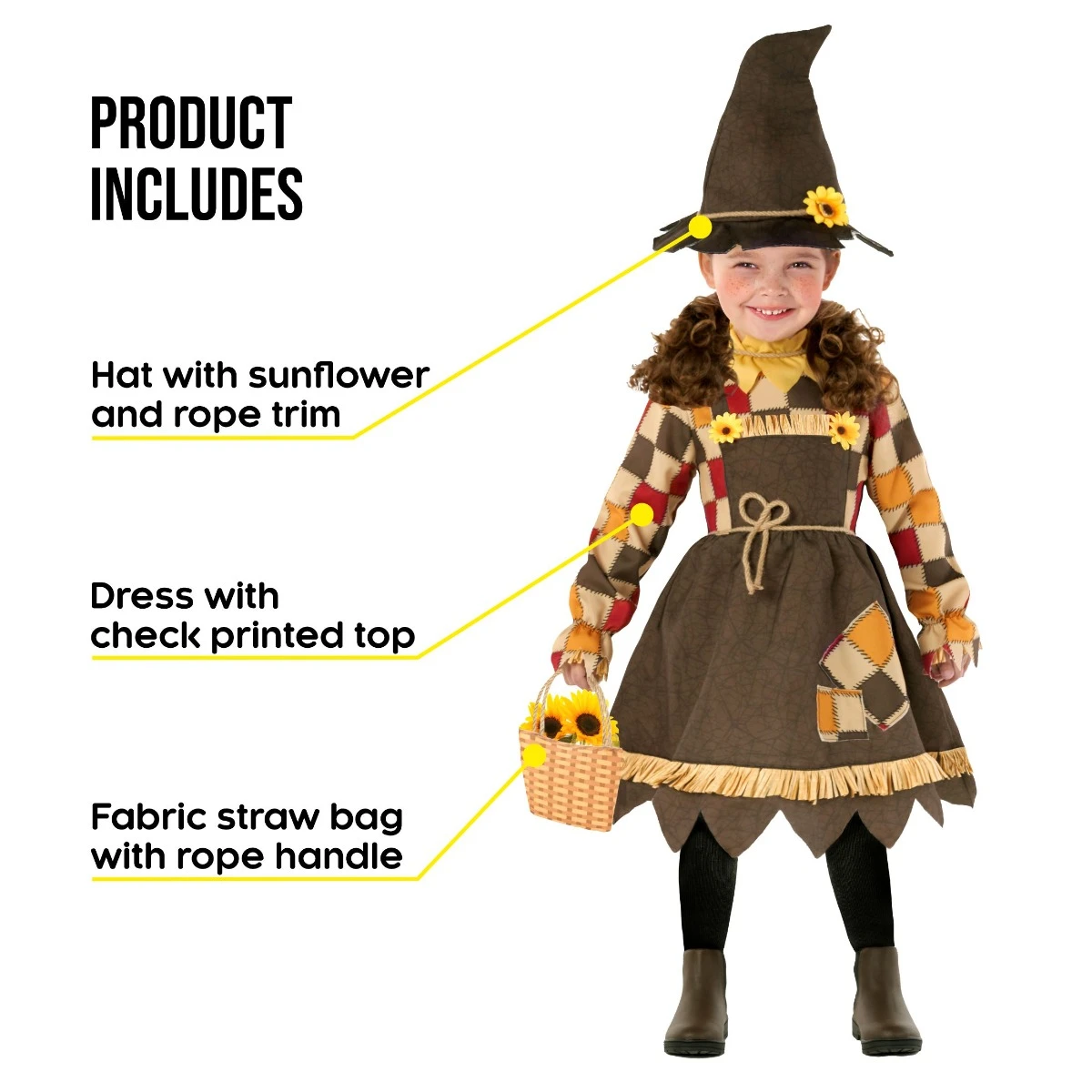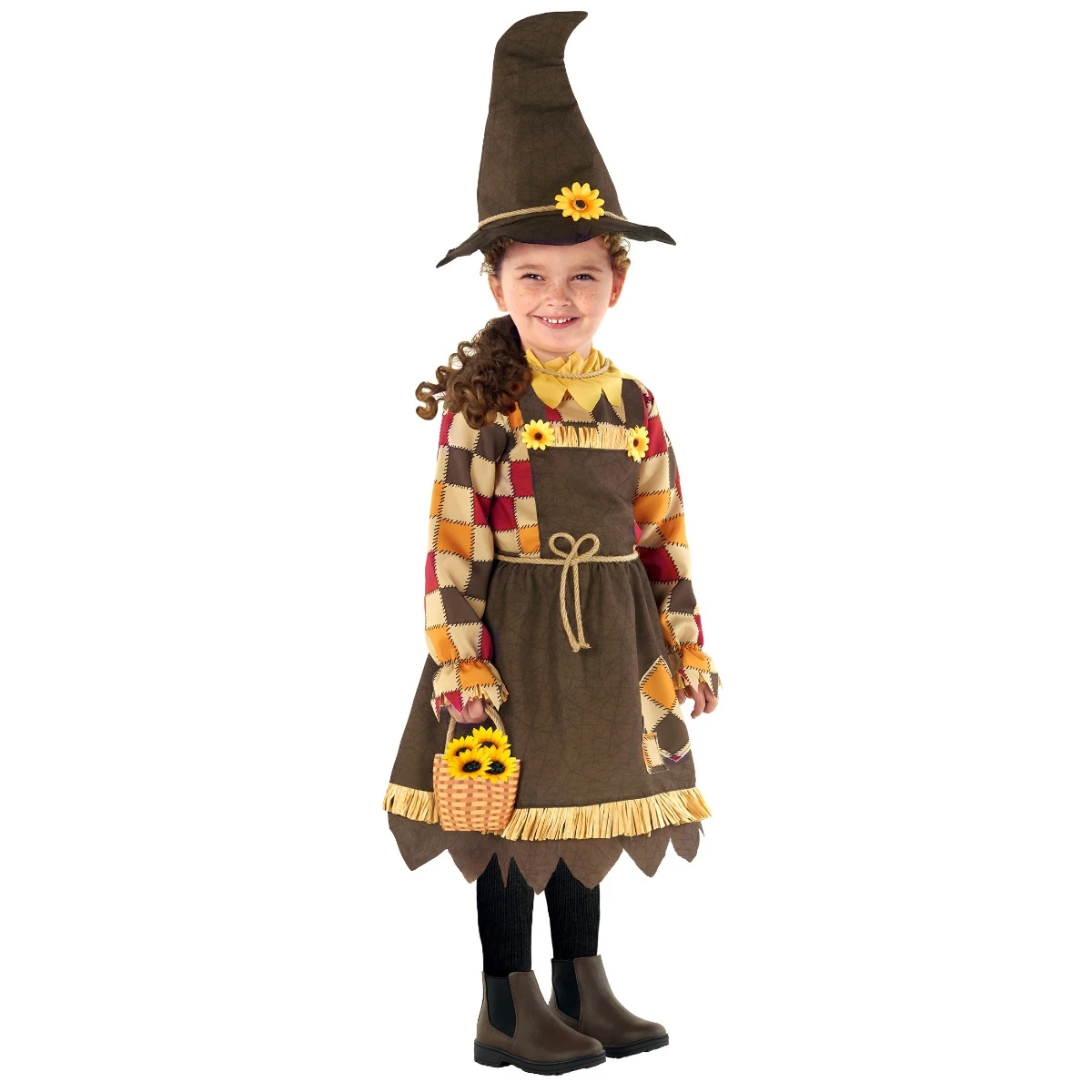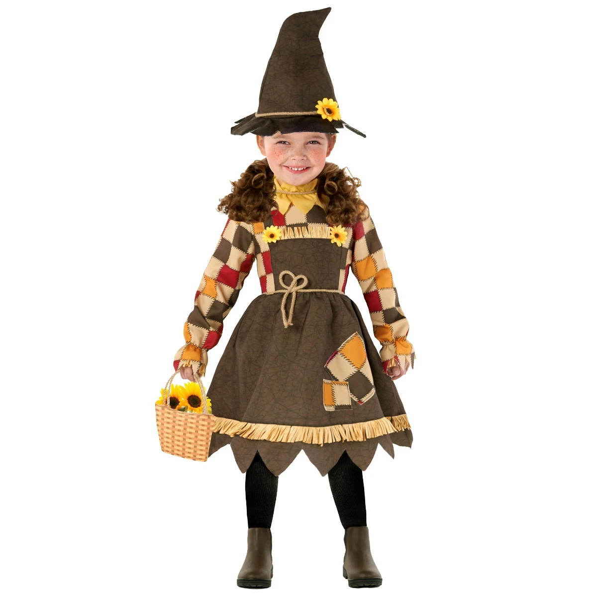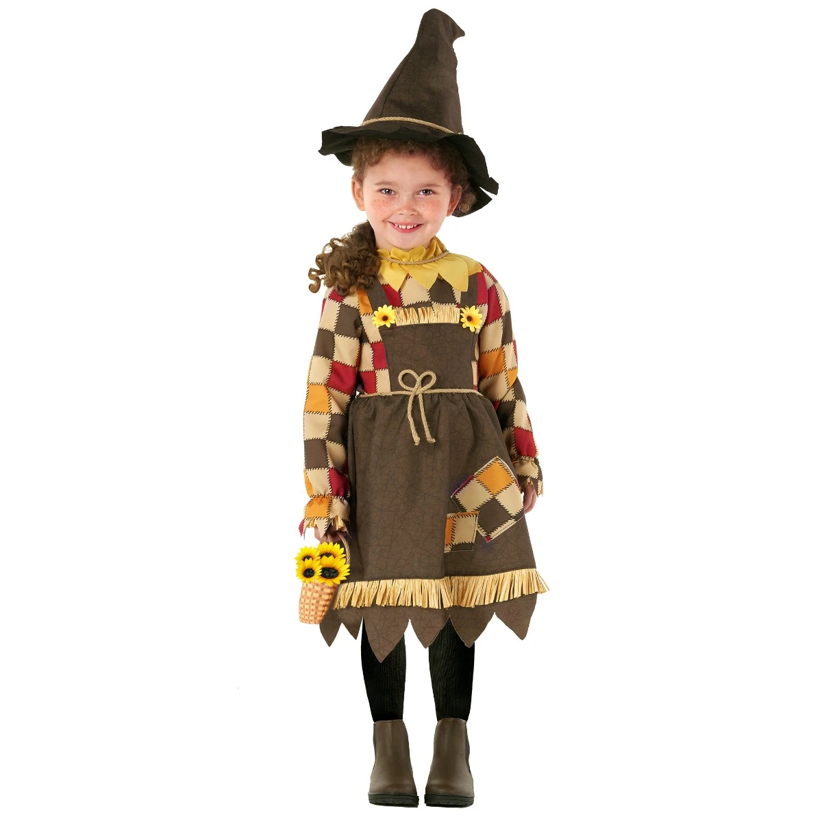 Il nostro simpatico costume spaventacrow con girasole per bambini è la combinazione perfetta di morbidezza e fascino! Questo costume incantevole è progettato per rendere il tuo bambino la star di qualsiasi occasione correlata al raccolto o festa di Halloween. Il set contiene un abito di girasole vivace con petali colorati. Finiscilo fino in fondo con il cappello abbinato, decorato con un girasole allegro, per completare il look. Contiene persino un sacchetto di paglia in tessuto con una maniglia del cordone, perfetta per trasportare dolci di Halloween.